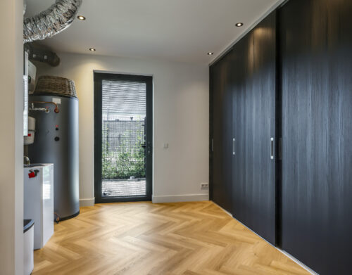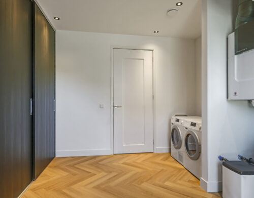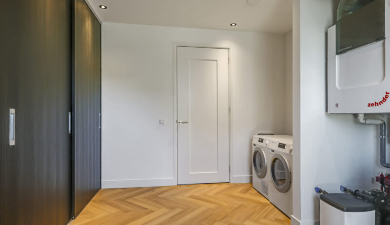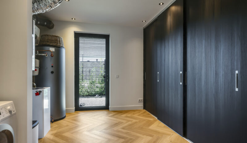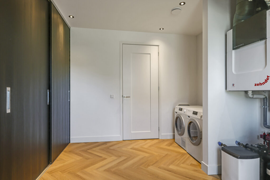 De inpandige berging is praktisch ingedeeld met een vaste kastenwand, aansluitingen voor de wasmachine en droger, de opstelling van de warmtepomp, WTW-installatie en waterontharder alsmede de achterentree.