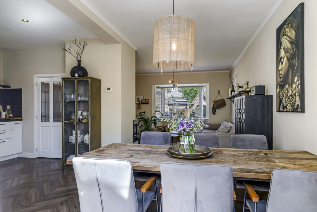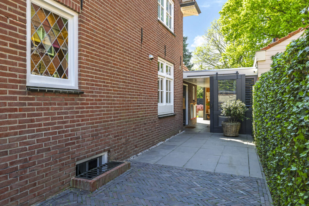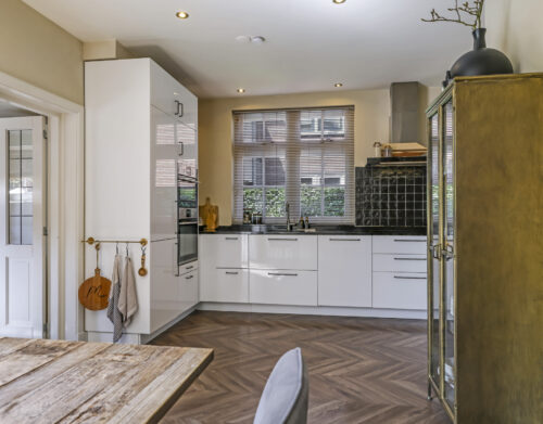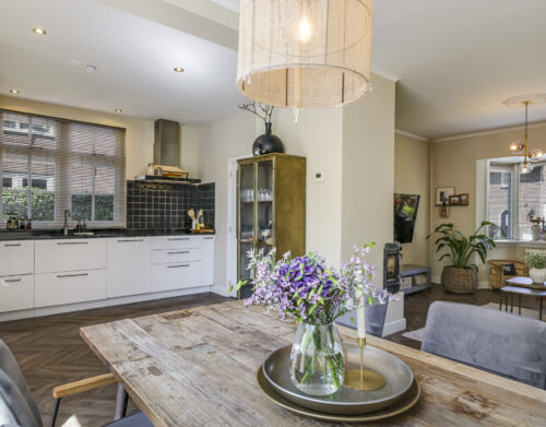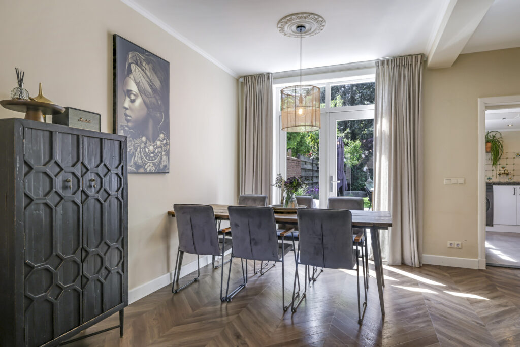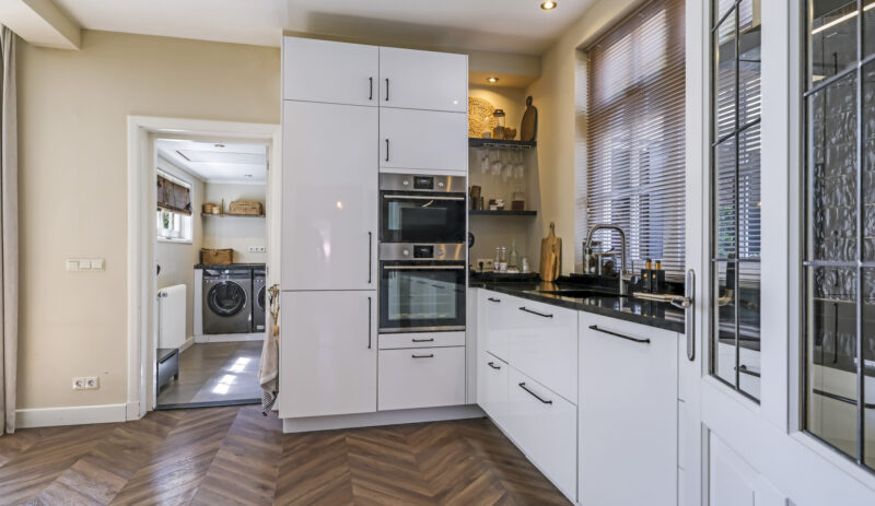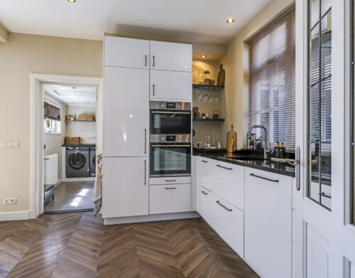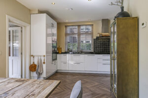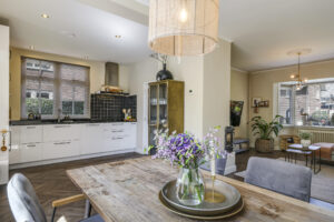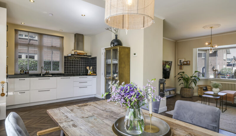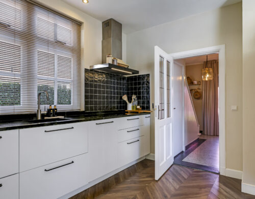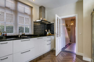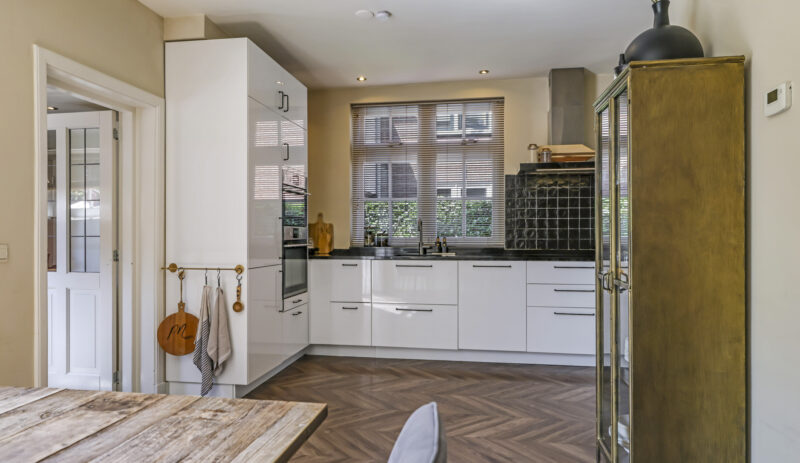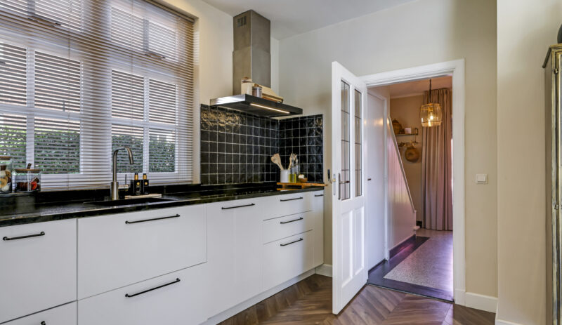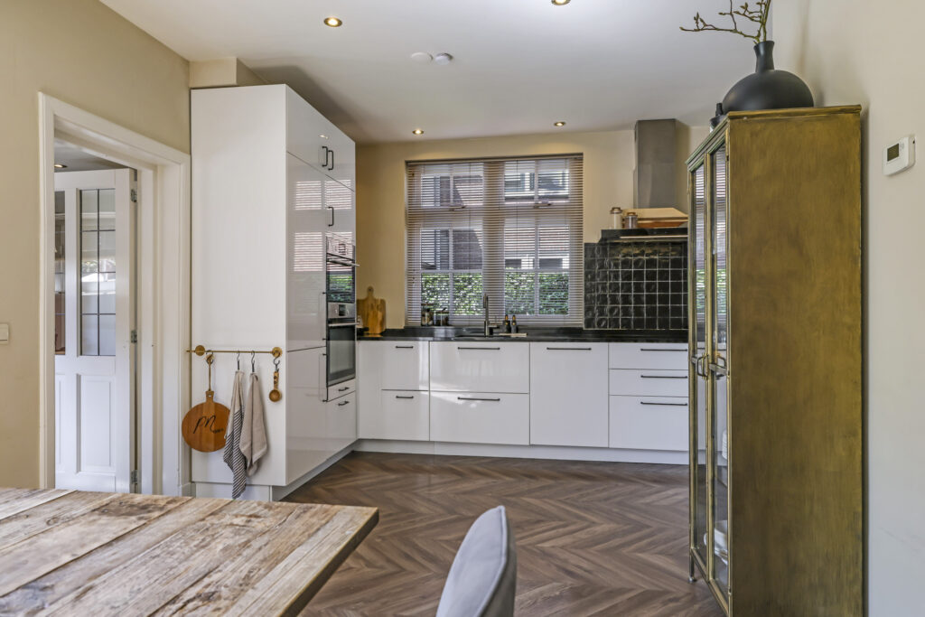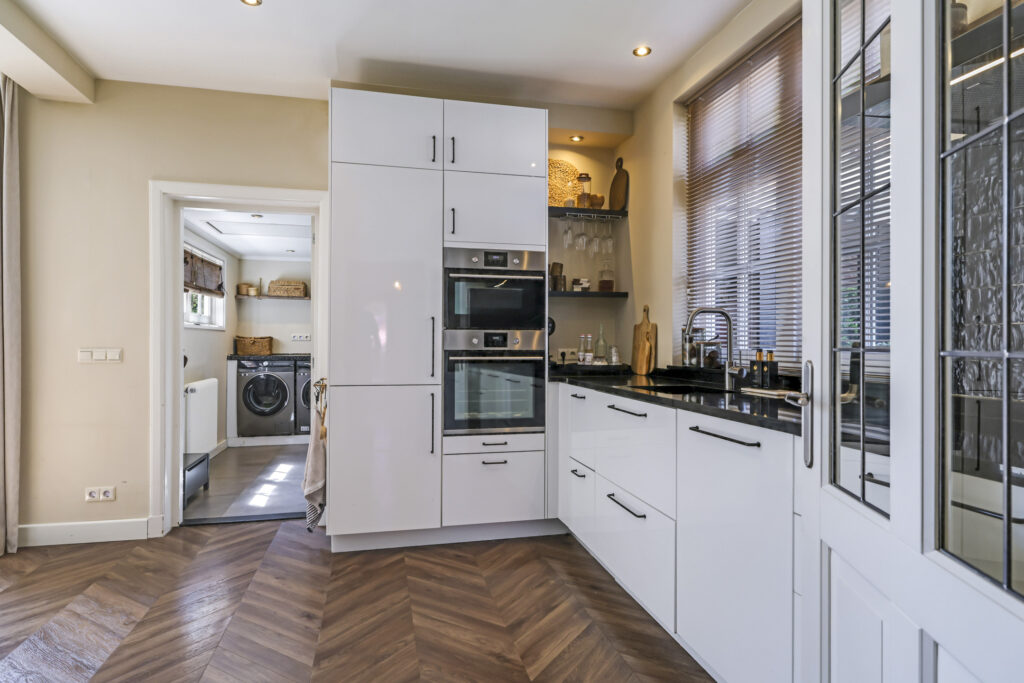 De karakteristieke boogvormige voordeur geeft toegang tot de entreehal met granito vloer, vanwaar u de trap naar de eerste verdieping, de kelder en de keuken bereikt. De keuken is in open verbinding met de woonkamer en is in 2018 volledig vernieuwd. Ze is uitgerust met diverse inbouwapparatuur, waaronder een oven, combimagnetron, vaatwasser, inductiekookplaat en een moderne afzuigkap. Het eetgedeelte van de open keuken loopt naadloos over in de woonkamer, waar u een prettige zithoek kunt creëren naast de charmante erker. Dankzij de raampartijen aan drie zijden geniet u van een prettig uitzicht over zowel de voor- als achtertuin. Het binnen- en buitenleven loopt moeiteloos in elkaar over door de openslaande deuren naar de tuin. Aangrenzend bevindt zich de bijkeuken, met extra bergruimte en aansluitingen voor wasmachine en droger en een toilet.