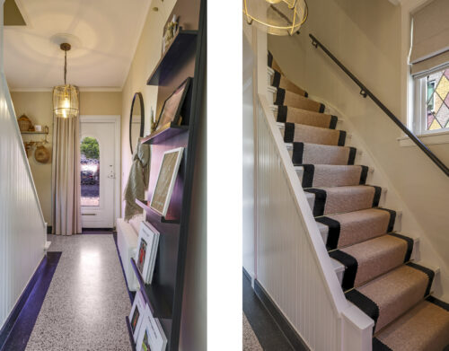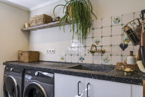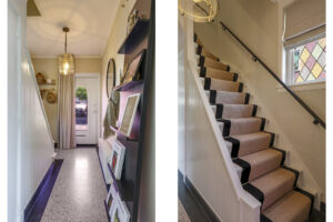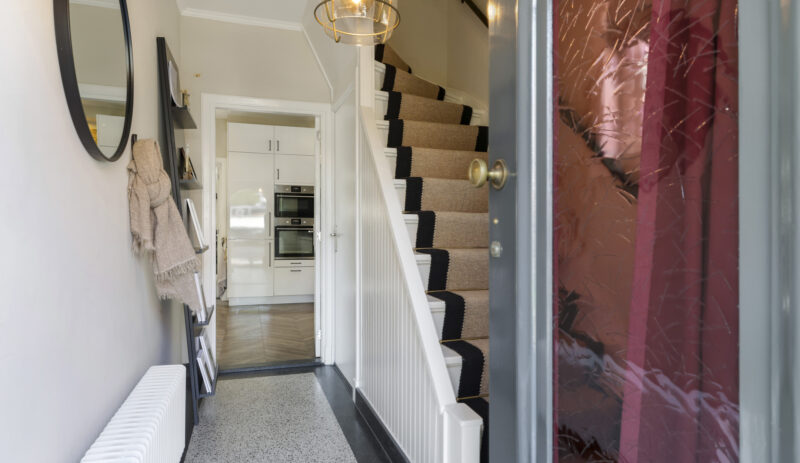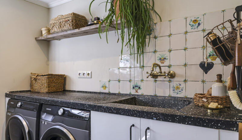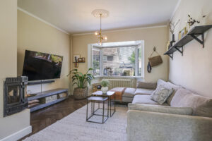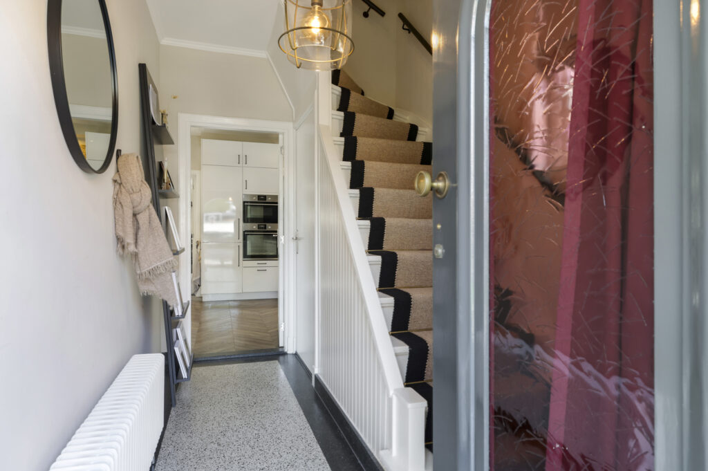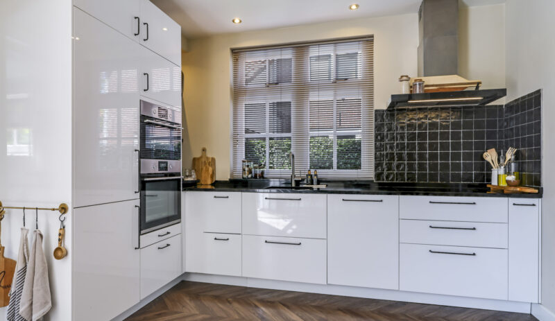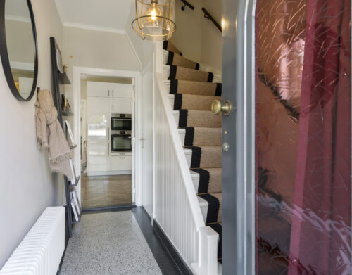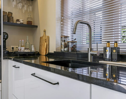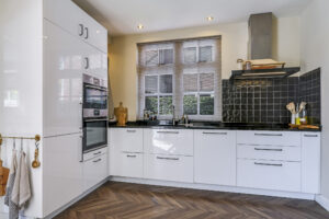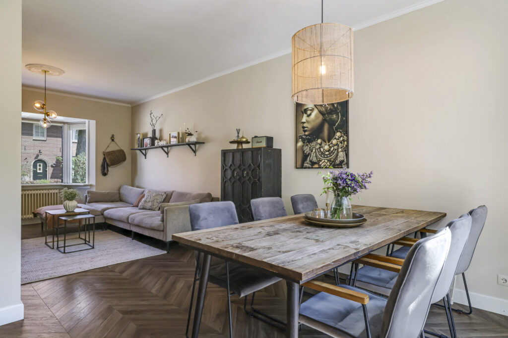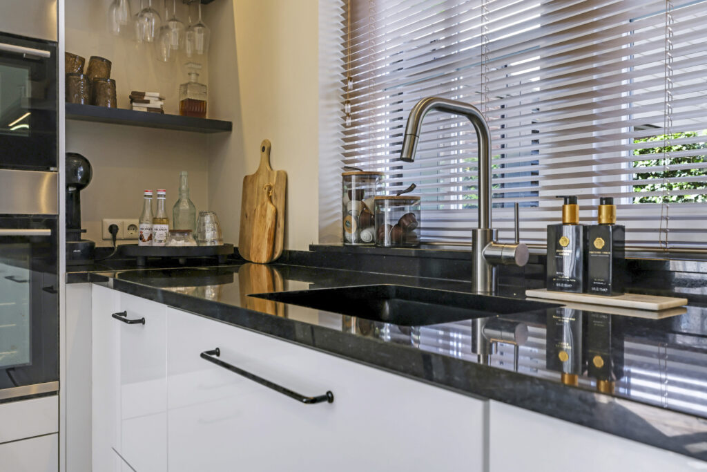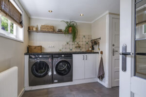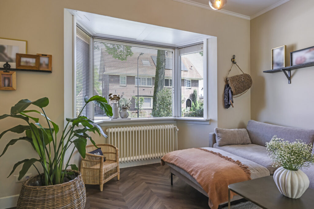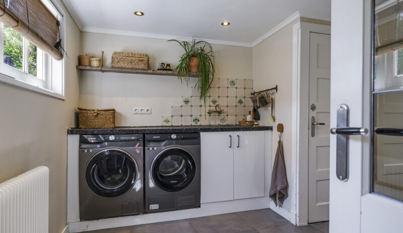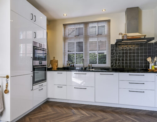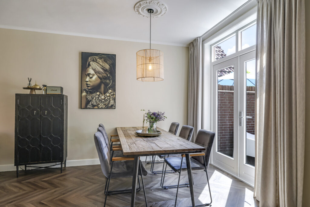 De karakteristieke boogvormige voordeur geeft toegang tot de entreehal met granito vloer, vanwaar u de trap naar de eerste verdieping, de kelder en de keuken bereikt. De keuken is in open verbinding met de woonkamer en is in 2018 volledig vernieuwd. Ze is uitgerust met diverse inbouwapparatuur, waaronder een oven, combimagnetron, vaatwasser, inductiekookplaat en een moderne afzuigkap. Het eetgedeelte van de open keuken loopt naadloos over in de woonkamer, waar u een prettige zithoek kunt creëren naast de charmante erker. Dankzij de raampartijen aan drie zijden geniet u van een prettig uitzicht over zowel de voor- als achtertuin. Het binnen- en buitenleven loopt moeiteloos in elkaar over door de openslaande deuren naar de tuin. Aangrenzend bevindt zich de bijkeuken, met extra bergruimte en aansluitingen voor wasmachine en droger en een toilet.