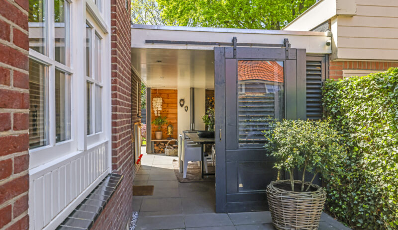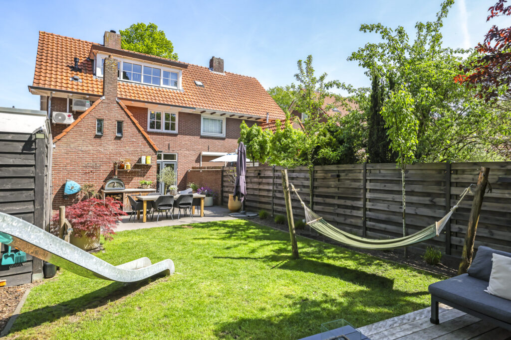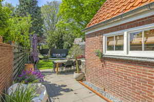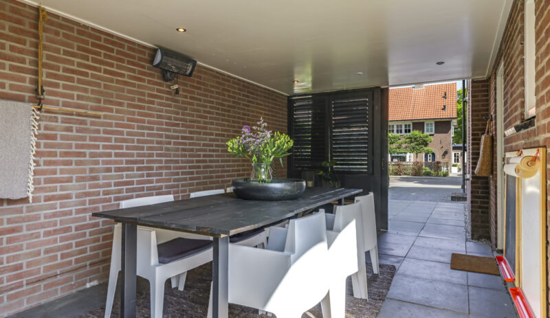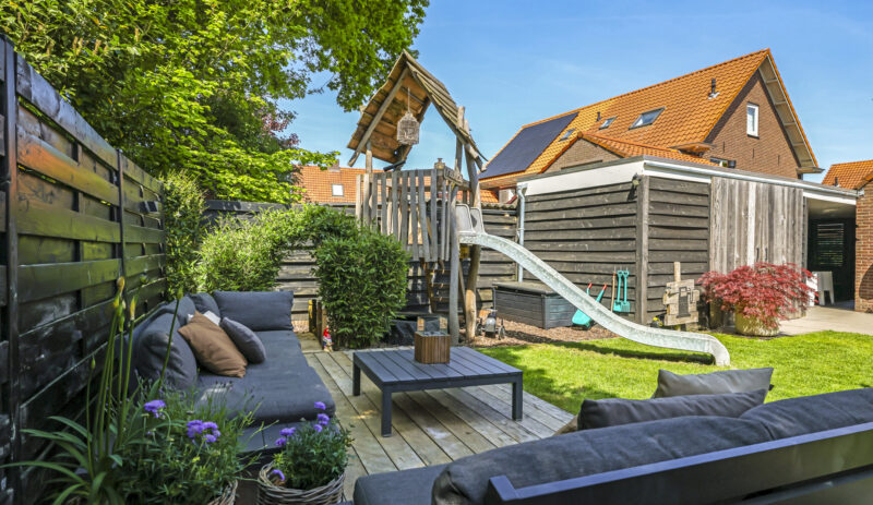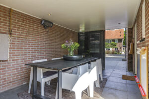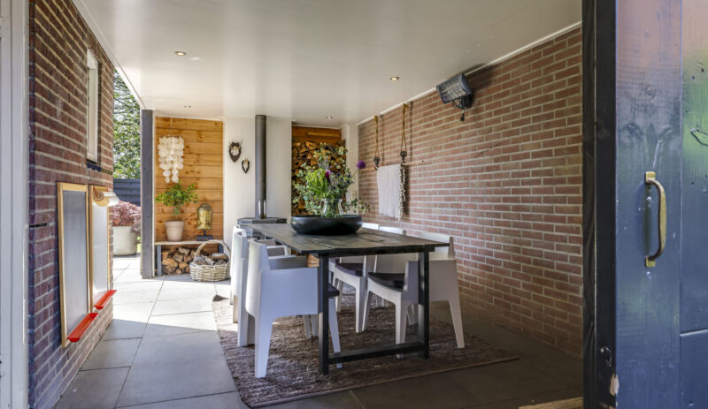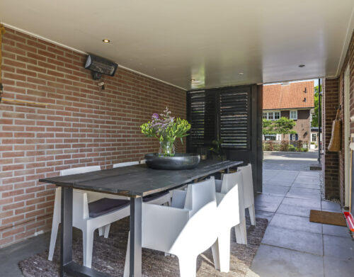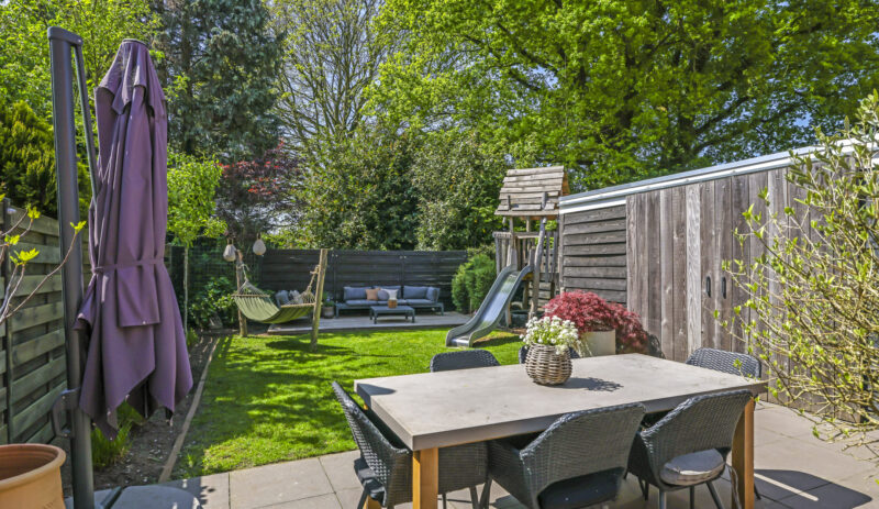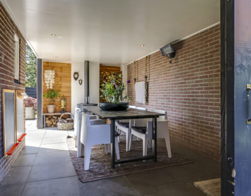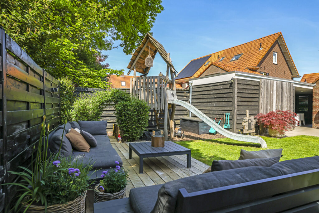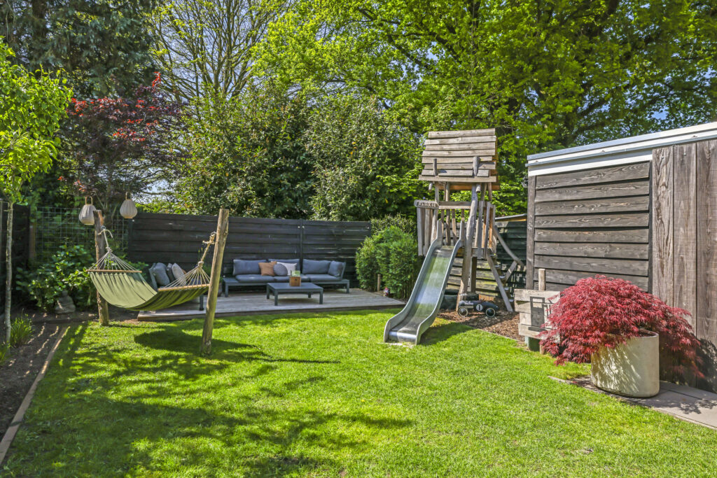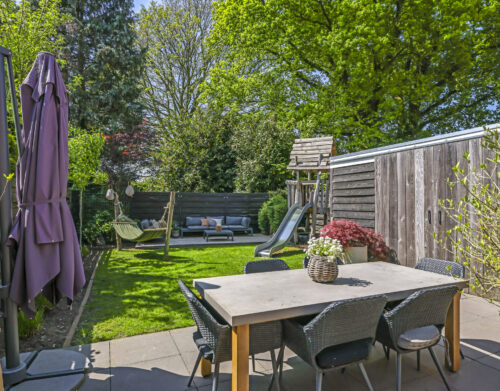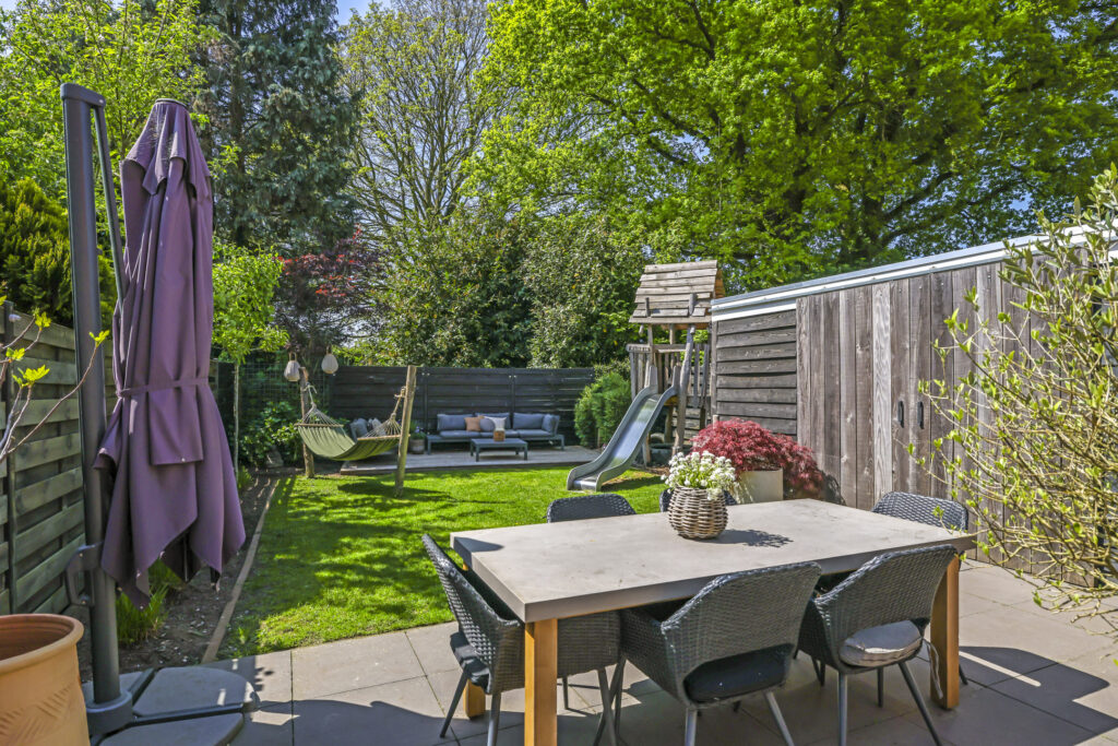 Via de oprit aan de voorkant van de woning bereikt u eenvoudig de garage, die is omgebouwd tot een overdekt terras met een open wand, een warmtelamp en plafondspotjes. Deze gezellige ruimte biedt voldoende plek voor een grote eettafel, zodat u bij elk weertype uitgebreid buiten kunt dineren met familie en vrienden. Vanuit dit terras is er directe toegang tot de achtertuin. De achtertuin is voorzien van een fraai betegeld terras, een groen gazon en wordt omringd door grote, volwassen bomen. Voor de kinderen is er een speeltoestel met glijbaan, waar zij uitgebreid kunnen spelen. Tot slot is er een houten berging in de achtertuin. Kortom: een rustige en sfeervolle plek om tot rust te komen.