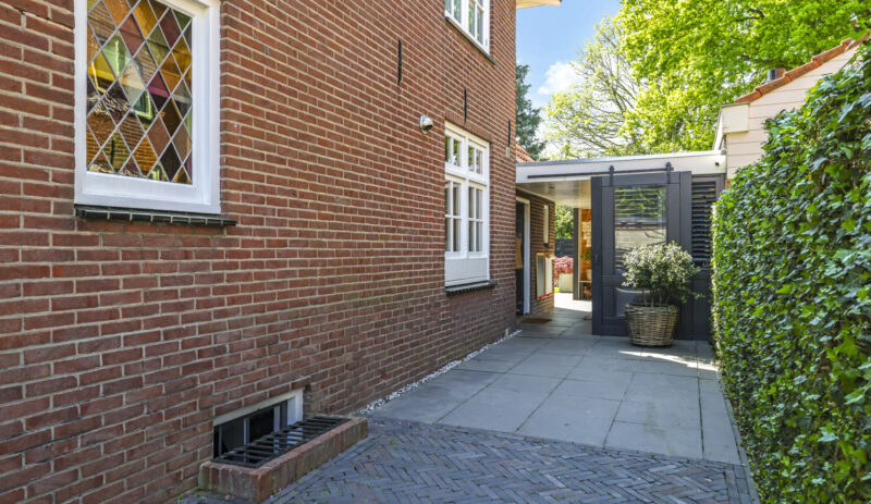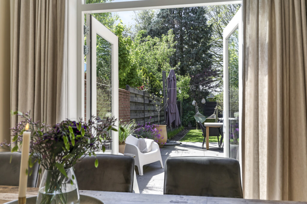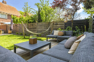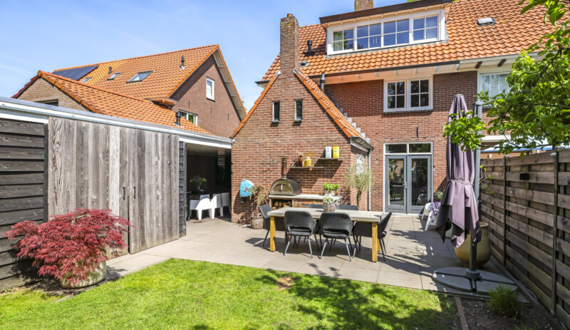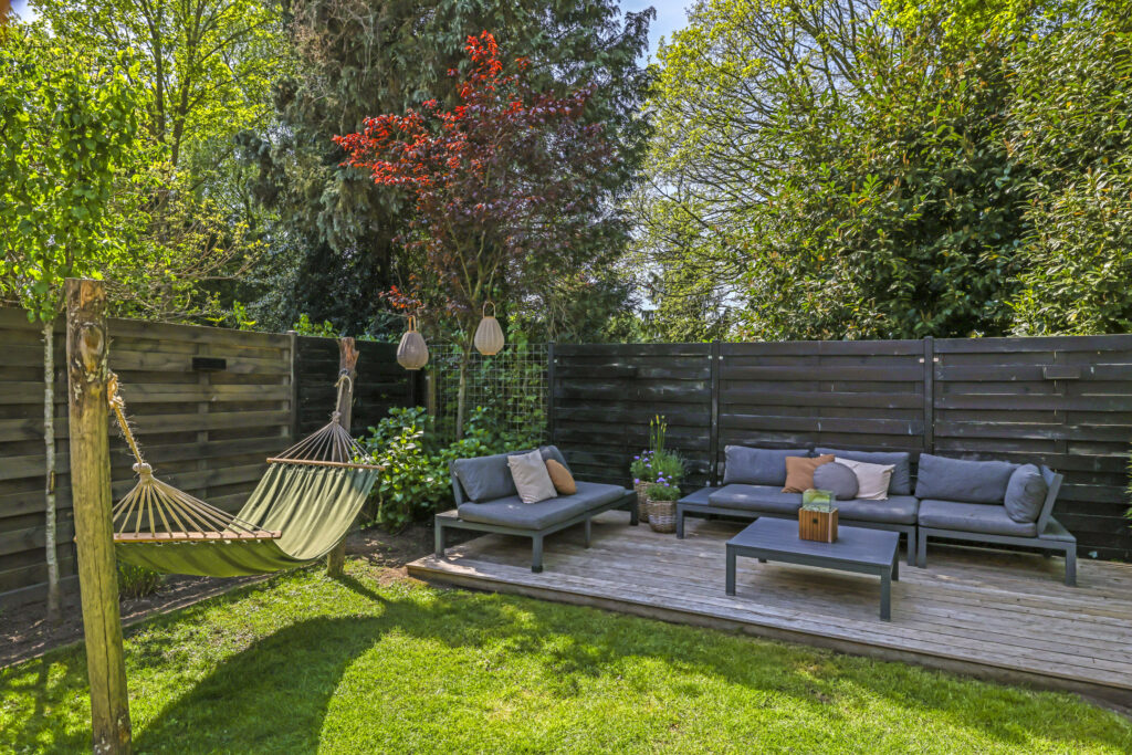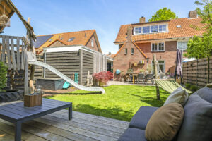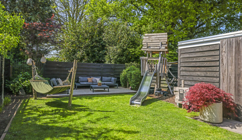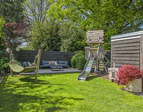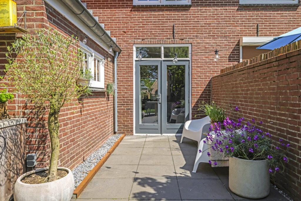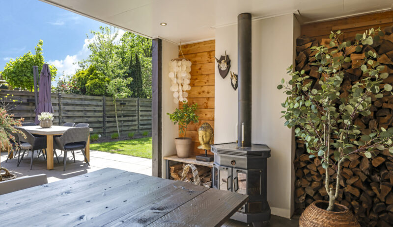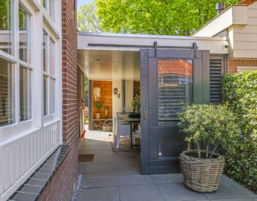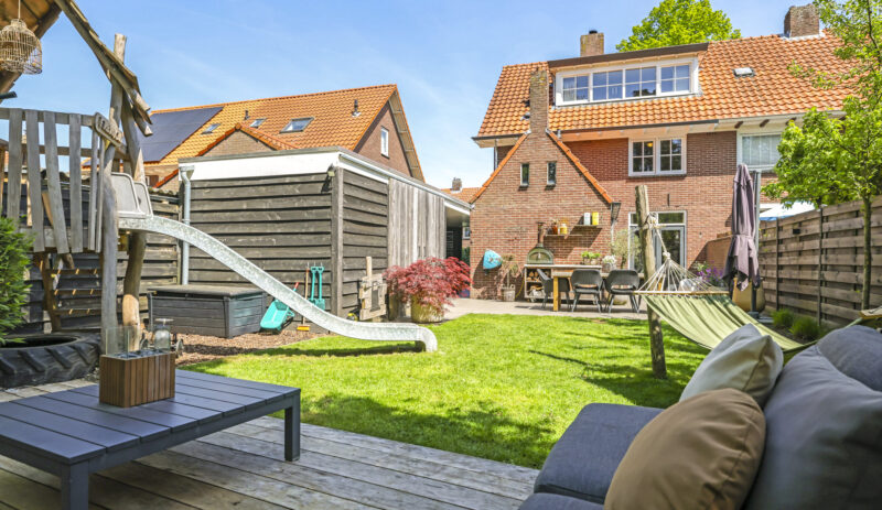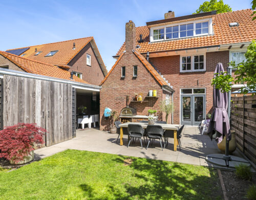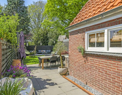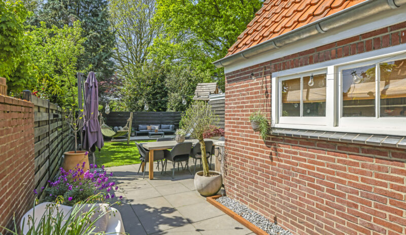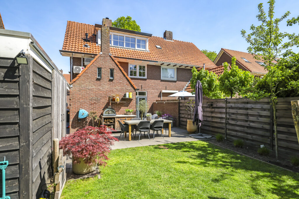 Via de oprit aan de voorkant van de woning bereikt u eenvoudig de garage, die is omgebouwd tot een overdekt terras met een open wand, een warmtelamp en plafondspotjes. Deze gezellige ruimte biedt voldoende plek voor een grote eettafel, zodat u bij elk weertype uitgebreid buiten kunt dineren met familie en vrienden. Vanuit dit terras is er directe toegang tot de achtertuin. De achtertuin is voorzien van een fraai betegeld terras, een groen gazon en wordt omringd door grote, volwassen bomen. Voor de kinderen is er een speeltoestel met glijbaan, waar zij uitgebreid kunnen spelen. Tot slot is er een houten berging in de achtertuin. Kortom: een rustige en sfeervolle plek om tot rust te komen.
