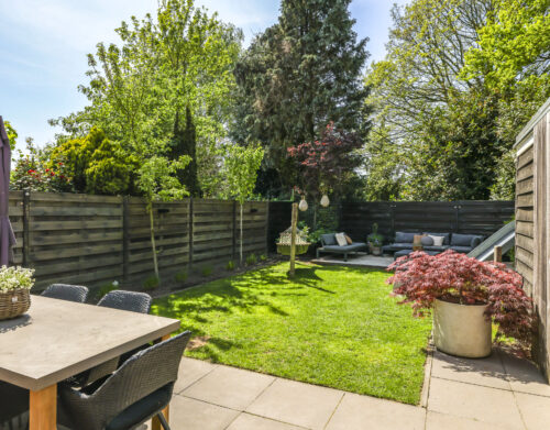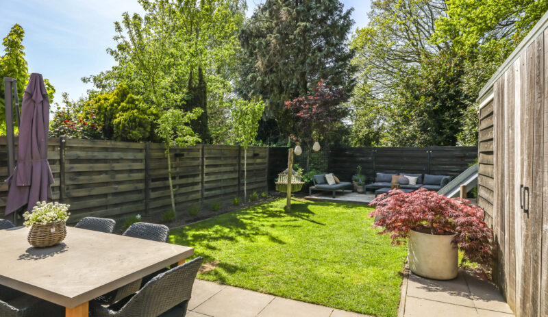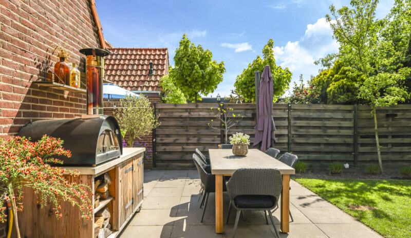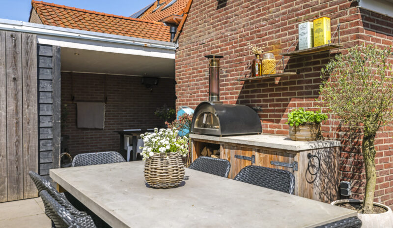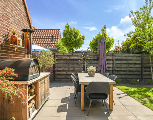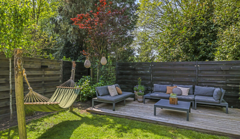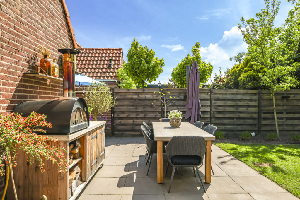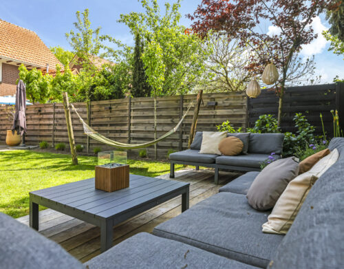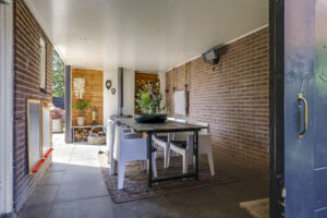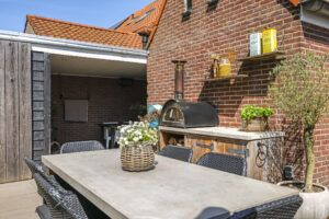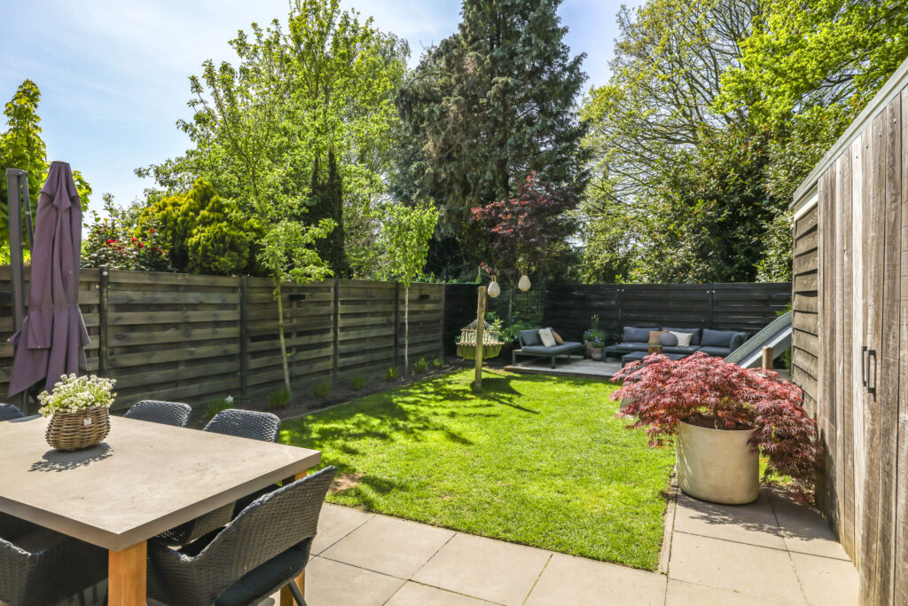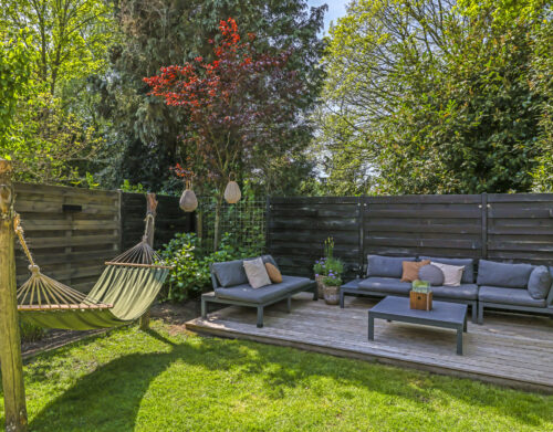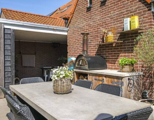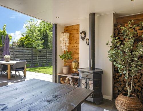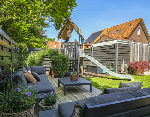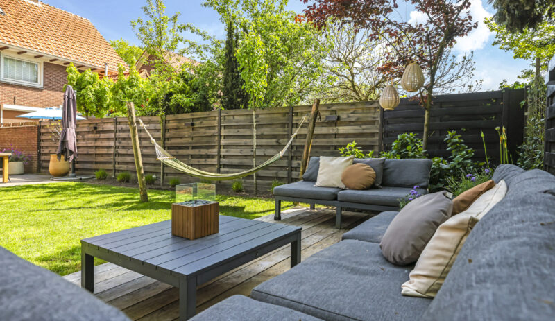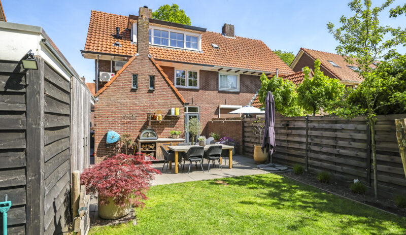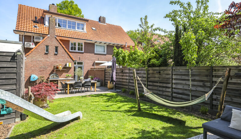 Via de oprit aan de voorkant van de woning bereikt u eenvoudig de garage, die is omgebouwd tot een overdekt terras met een open wand, een warmtelamp en plafondspotjes. Deze gezellige ruimte biedt voldoende plek voor een grote eettafel, zodat u bij elk weertype uitgebreid buiten kunt dineren met familie en vrienden. Vanuit dit terras is er directe toegang tot de achtertuin. De achtertuin is voorzien van een fraai betegeld terras, een groen gazon en wordt omringd door grote, volwassen bomen. Voor de kinderen is er een speeltoestel met glijbaan, waar zij uitgebreid kunnen spelen. Tot slot is er een houten berging in de achtertuin. Kortom: een rustige en sfeervolle plek om tot rust te komen.