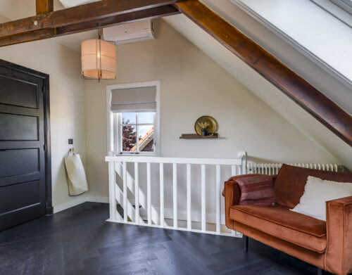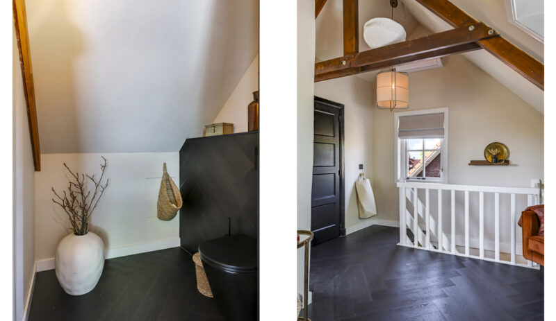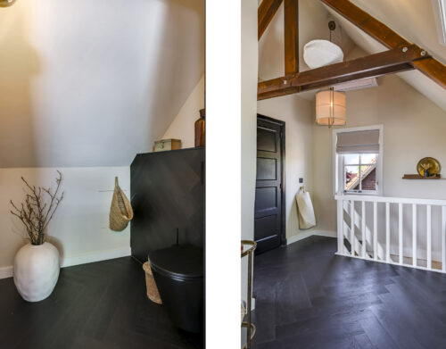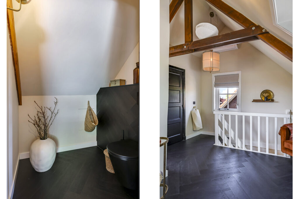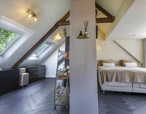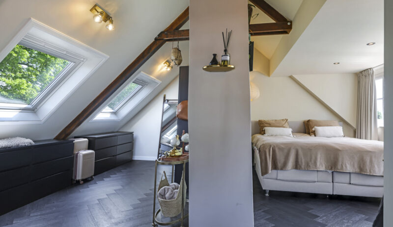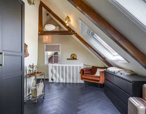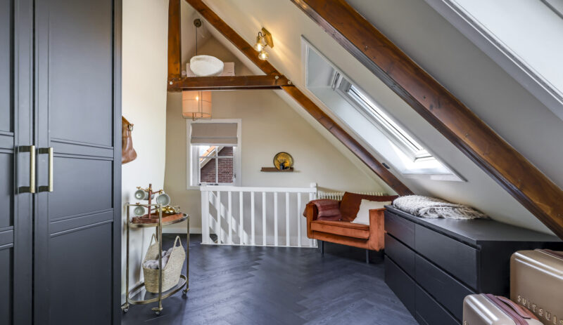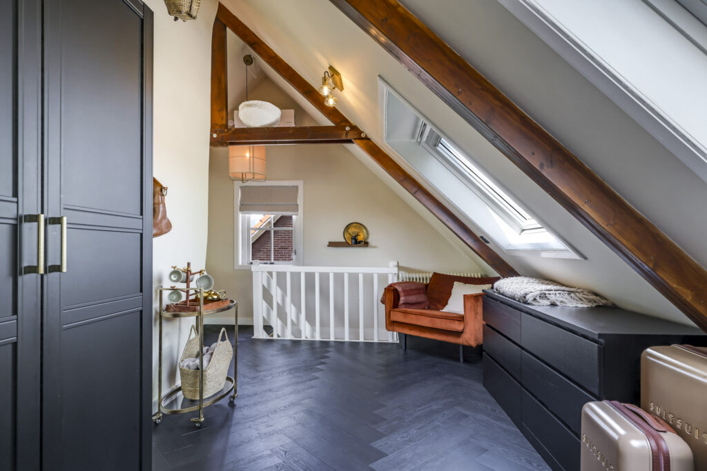Deze royale master bedroom op zolder straalt warmte en comfort uit, met een prachtig plafond, zichtbare houten balken en veel daglicht dankzij de dakramen. De ruimte is slim ingedeeld met een aparte kleedruimte, voorzien van stijlvolle zwarte ladekasten en een visgraatvloer die doorloopt over de gehele verdieping. Ook is er een 3e toilet op de tweede verdieping aanwezig.