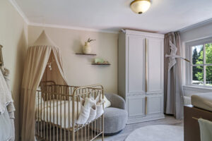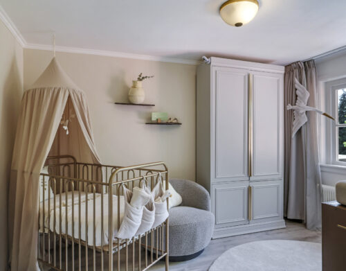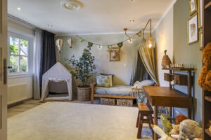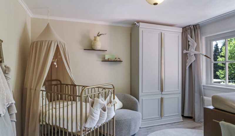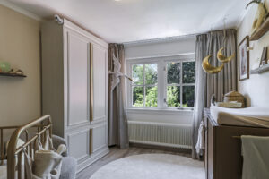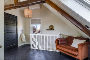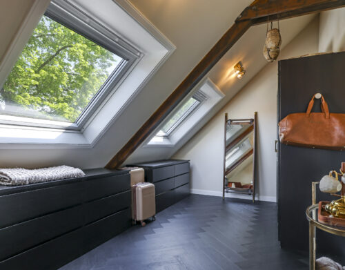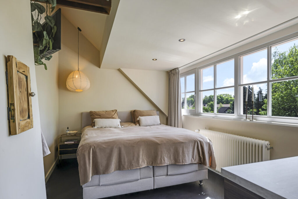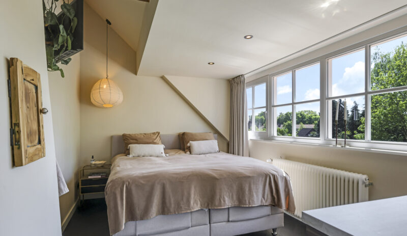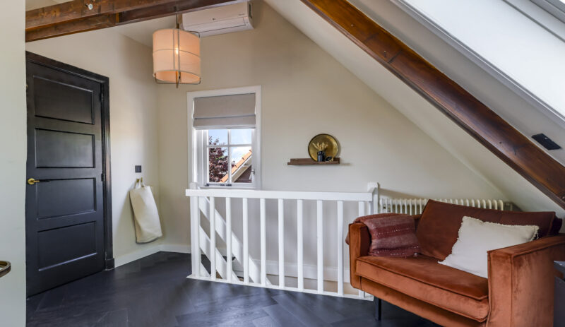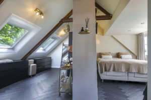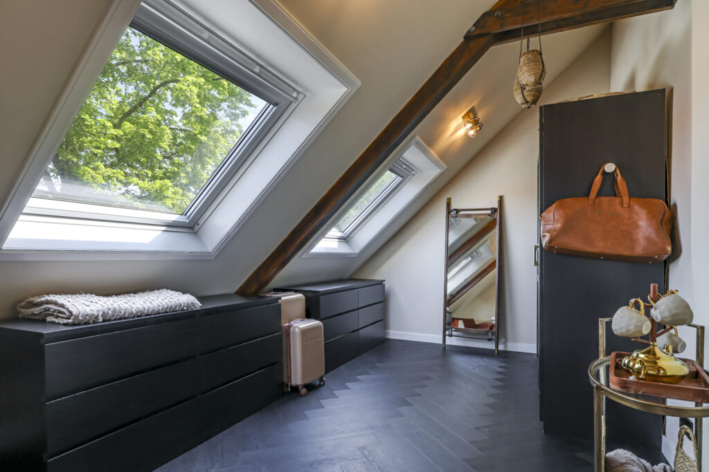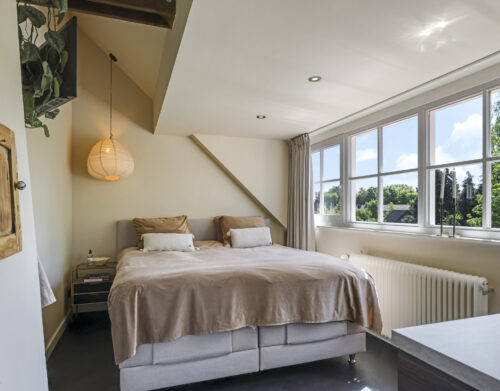 Deze royale master bedroom op zolder straalt warmte en comfort uit, met een prachtig plafond, zichtbare houten balken en veel daglicht dankzij de dakramen. De ruimte is slim ingedeeld met een aparte kleedruimte, voorzien van stijlvolle zwarte ladekasten en een visgraatvloer die doorloopt over de gehele verdieping. Ook is er een 3e toilet op de tweede verdieping aanwezig.