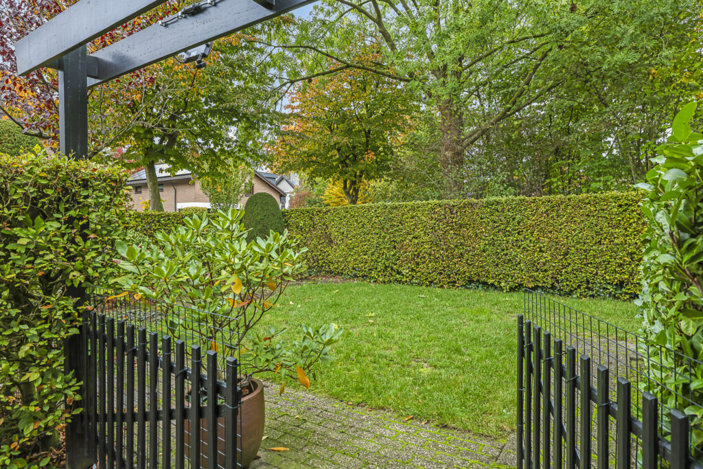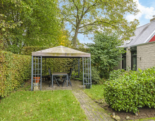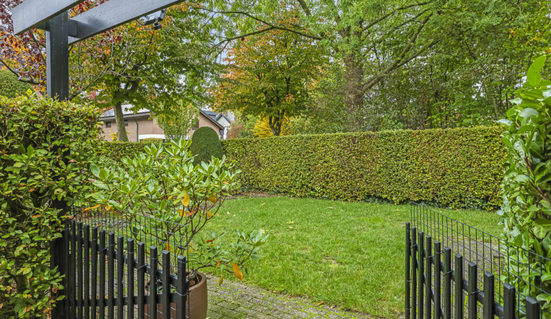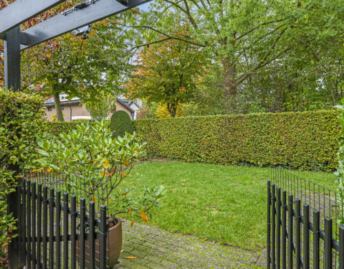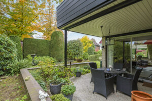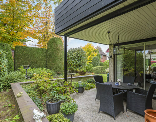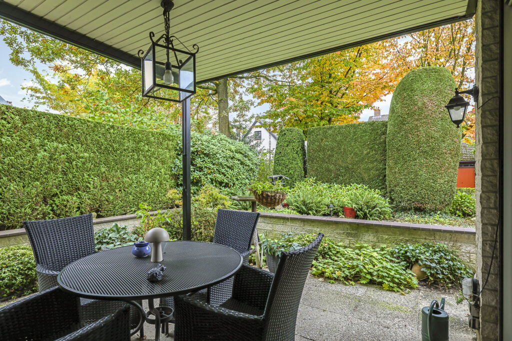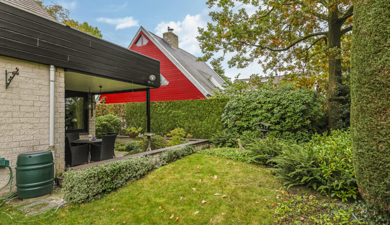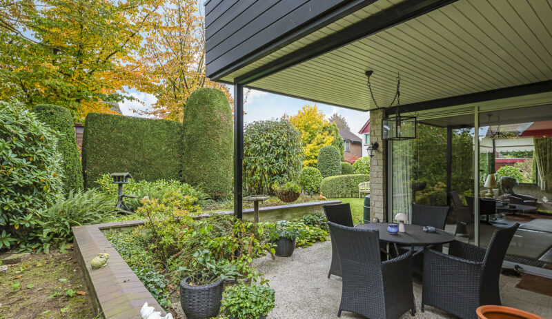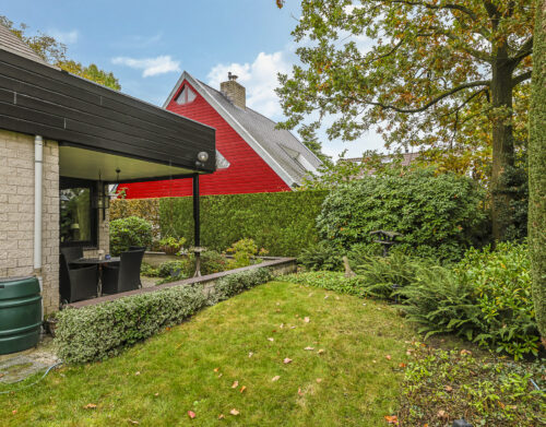 De achtertuin is ruim opgezet en biedt veel privacy. Dankzij het gazon, de diverse beplanting, volwassen bomen en meerdere terrassen is dit een fijne plek om te genieten van het buitenleven.