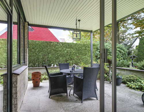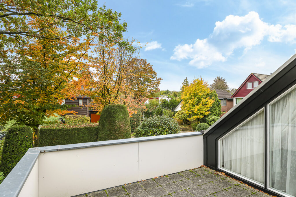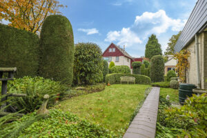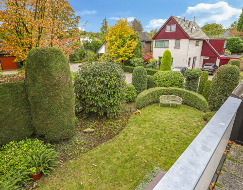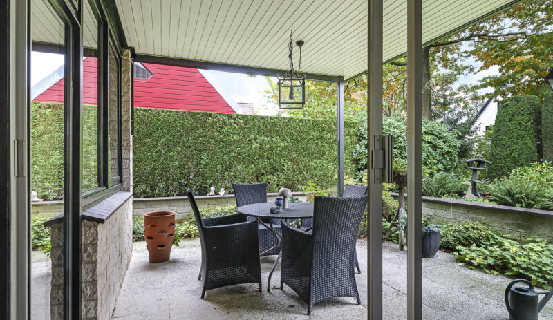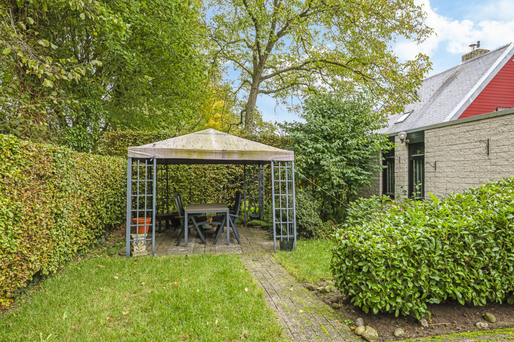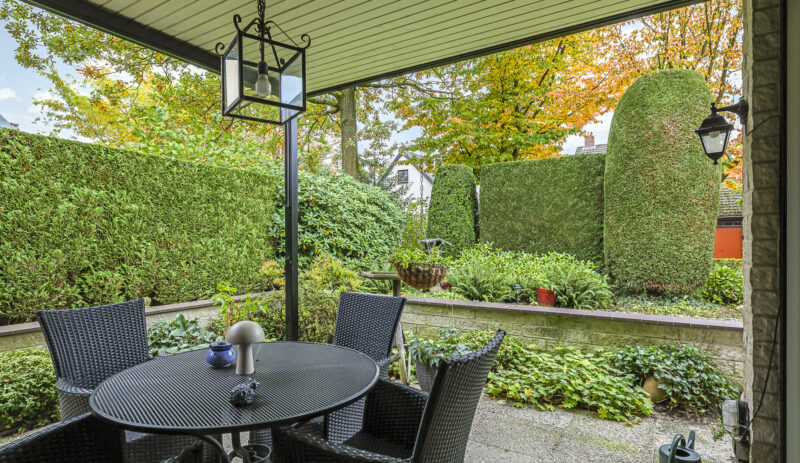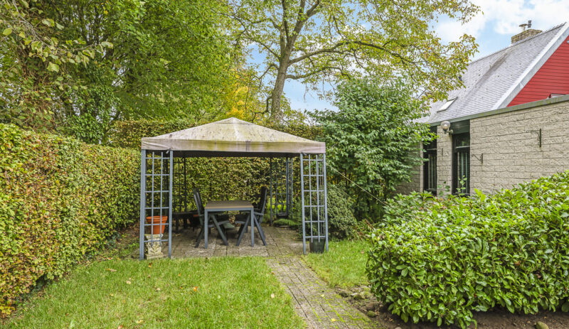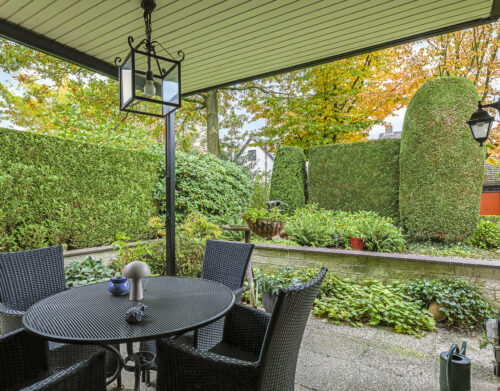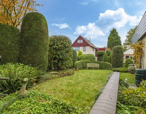 De achtertuin is ruim opgezet en biedt veel privacy. Dankzij het gazon, de diverse beplanting, volwassen bomen en meerdere terrassen is dit een fijne plek om te genieten van het buitenleven.