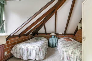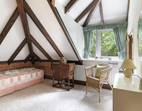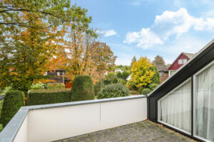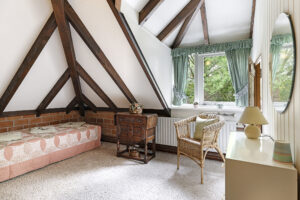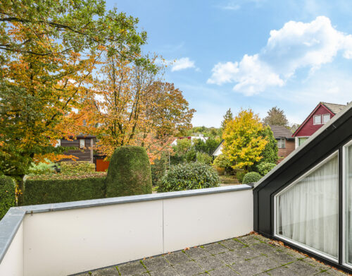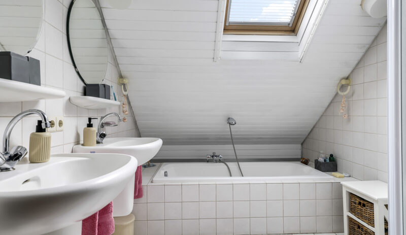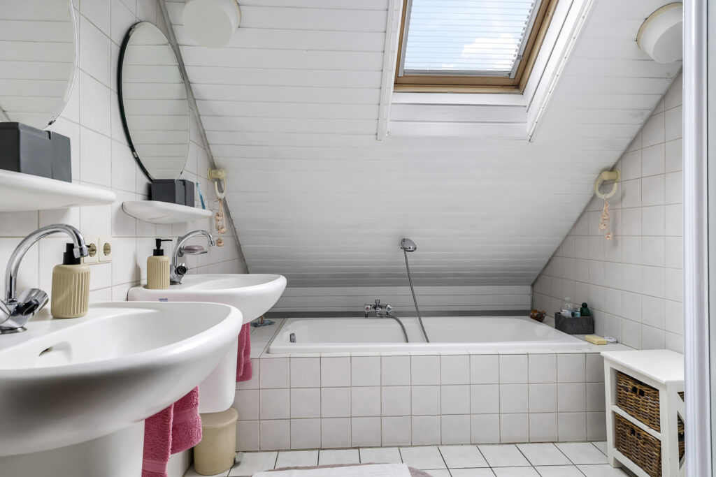 De eerste verdieping beschikt over vier slaapkamers, die allen licht en ruim zijn. De hoofdslaapkamer is royaal van formaat en biedt toegang tot een ruim dakterras kijkend op de tuin en het groen van de straat. Eén van de slaapkamers geeft ook toegang tot een berging met de CV-installatie. De badkamer is uitgerust met een ligbad, douchecabine en dubbele wastafel. Op de verdieping bevindt zich tevens een separaat toilet met fonteintje.