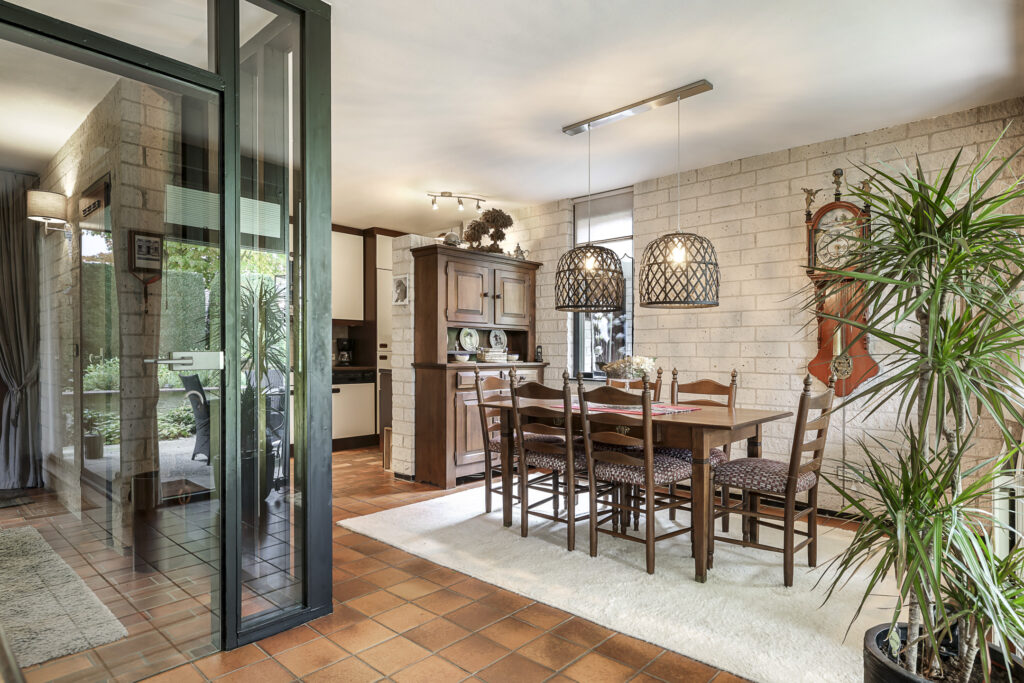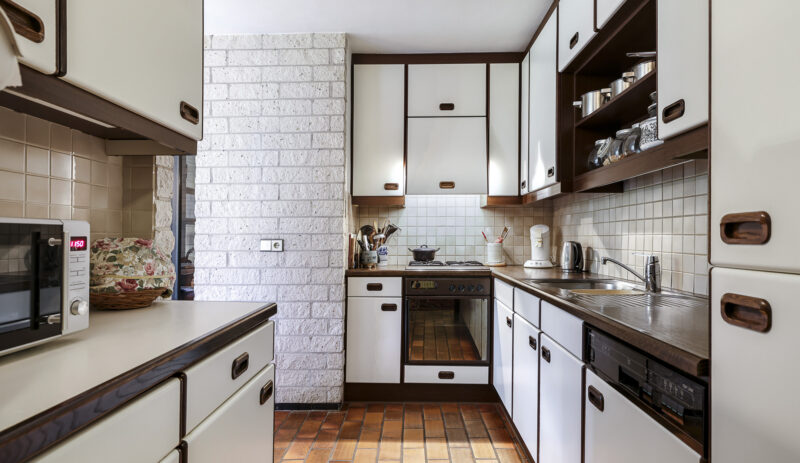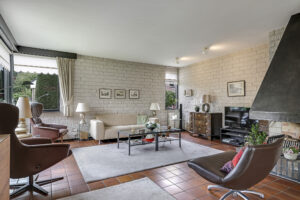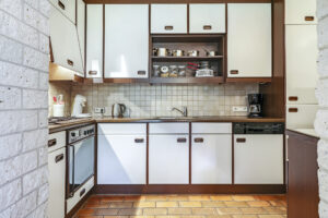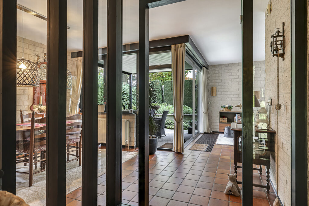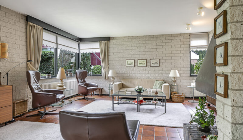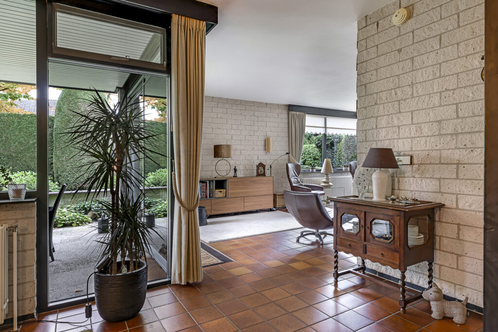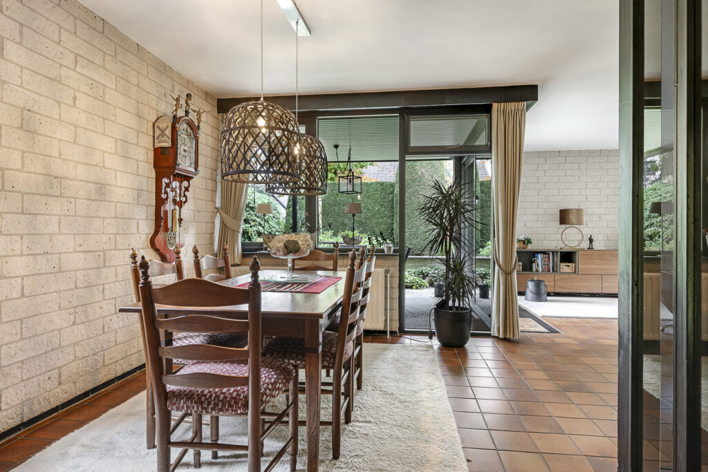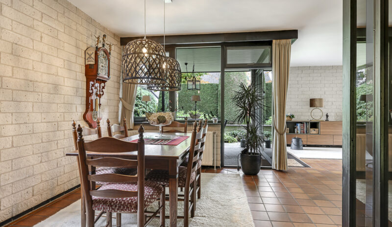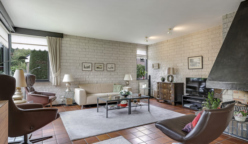 Via de entree met trapopgang, meterkast en betegeld toilet met fonteintje bereikt u de woonkamer. De lichte woonkamer beschikt over grote raampartijen, schuifpui met toegang tot de veranda en een open haard, wat zorgt voor een sfeervol geheel. De eethoek sluit aan op de halfopen keuken, voorzien van een oven, koelkast, wasemkap en 4-pits gaskookplaat.