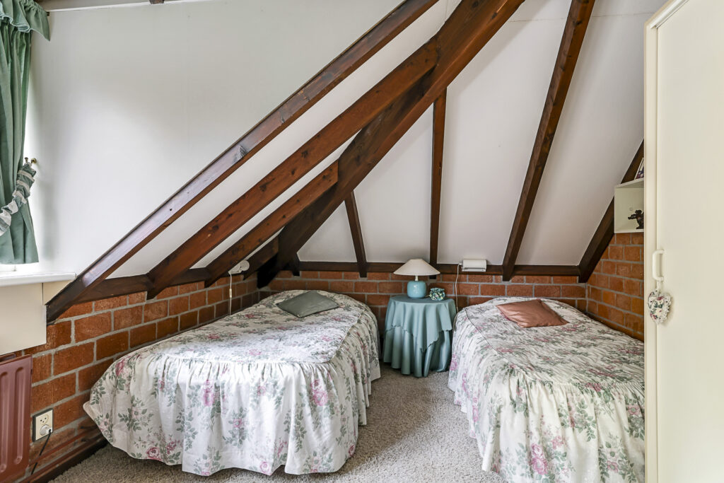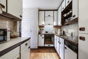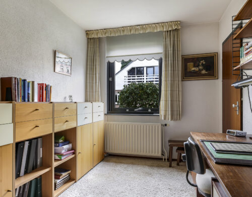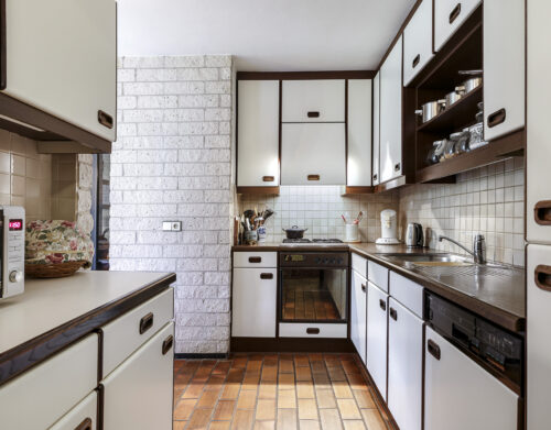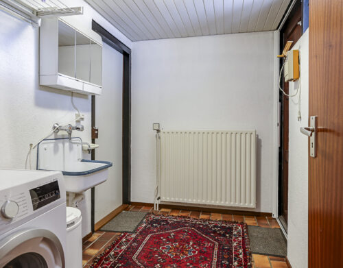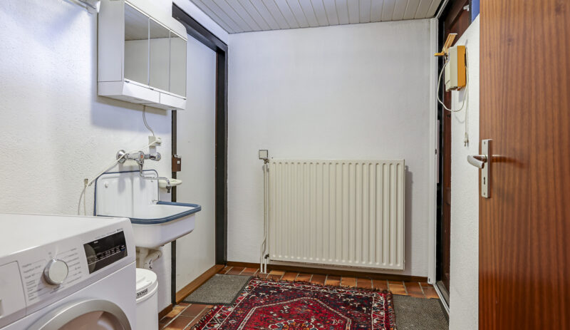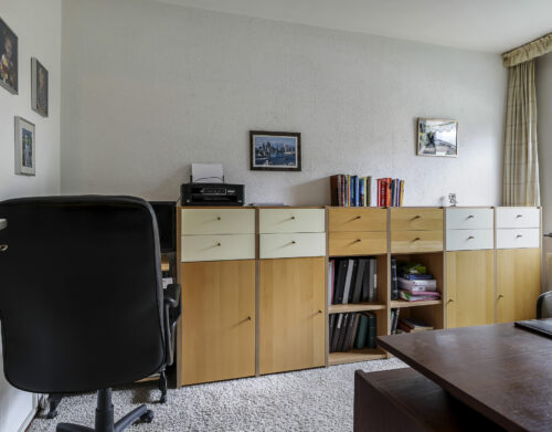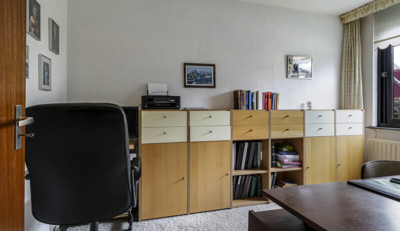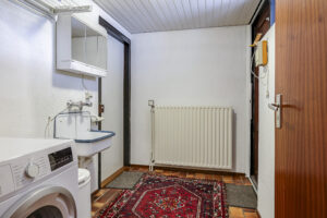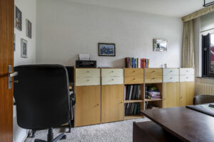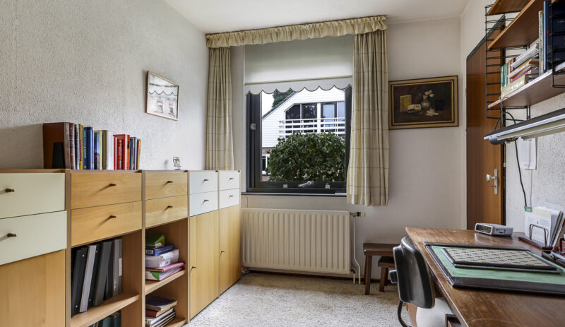 Aangrenzend bevindt zich de bijkeuken met aansluitingen voor wasmachine en droger, extra opbergruimte en een wastafel. Vanuit de bijkeuken is er directe toegang tot de voortuin. Op de begane grond is tevens een extra werk- of slaapkamer aanwezig, wat de woning ook geschikt maakt voor levensloopbestendig wonen of thuiswerken.