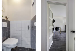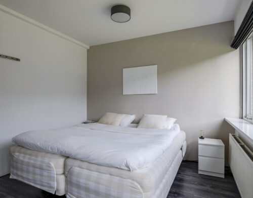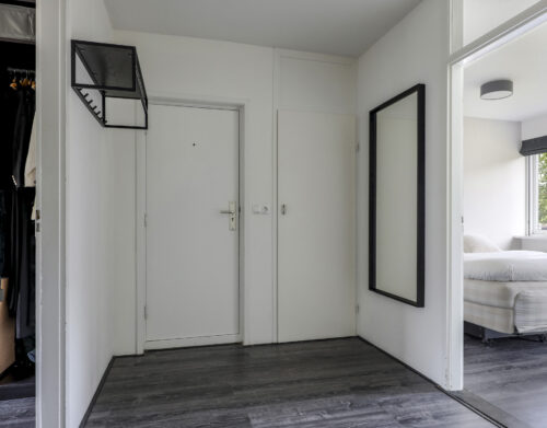 Ruime hal met toegang tot de lichte woonkamer en de recent gemoderniseerde open keuken, uitgerust met diverse inbouwapparatuur. Vanuit de hal bereikt u tevens de masterbedroom met halfopen, moderne badkamer voorzien van inloopdouche en wastafel, evenals een nis met opstelplaats voor de was. Aangrenzend aan deze slaapkamer bevindt zich het eerste van de twee balkons. Daarnaast zijn er een tweede, kleinere slaapkamer – ideaal als kinder-, werk- of hobbykamer met toegang tot het tweede balkon – en een gemoderniseerd toilet met wandcloset.