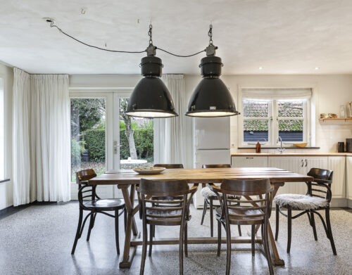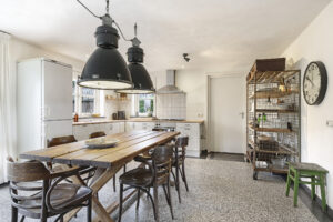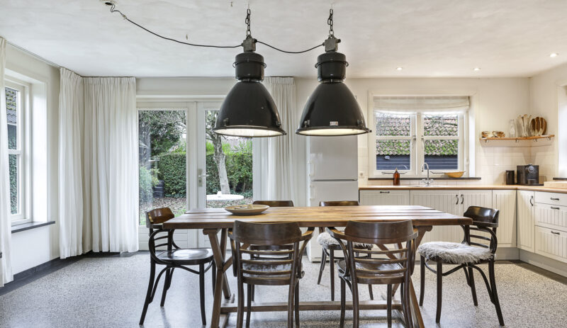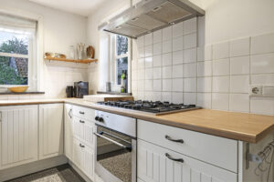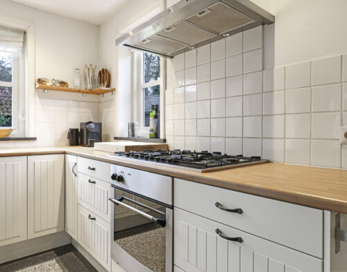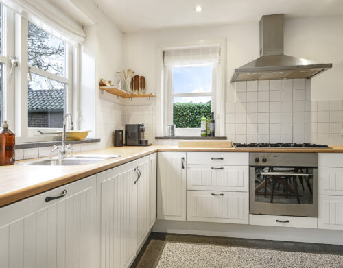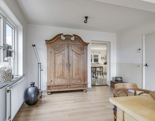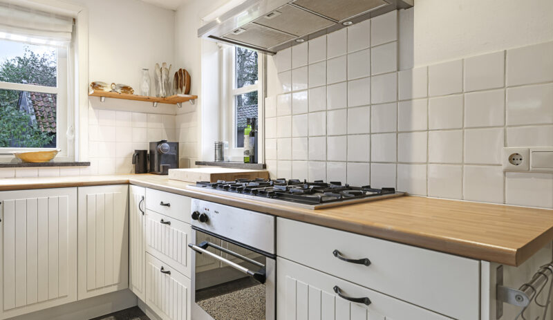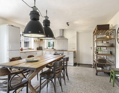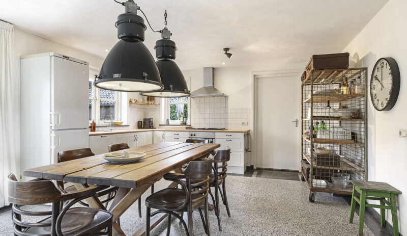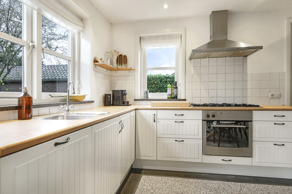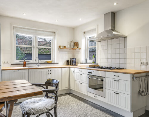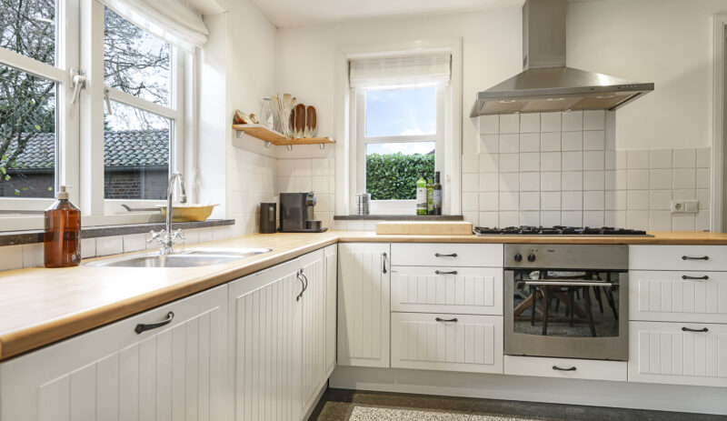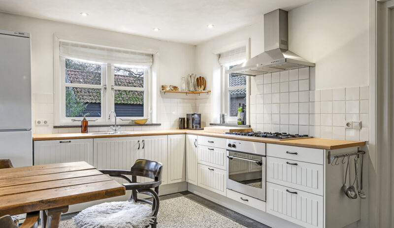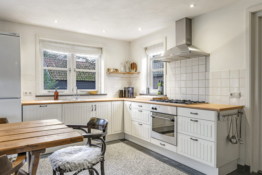 Aan de achterkant is in 2000 de leefkeuken aangebouwd: een ruime, sfeervolle plek met granitovloer, vloerverwarming en openslaande deuren naar de tuin. De inbouwkeuken in hoekopstelling is voorzien van een vaatwasser, gaskookplaat en oven. Deze is nog uit 2000 en daarmee dé kans om hier jouw droomkeuken te creëren.