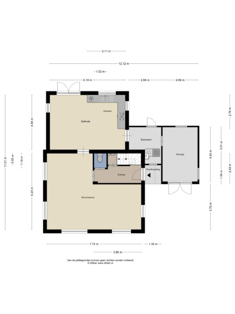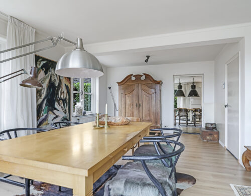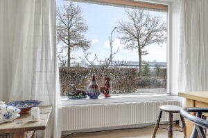 Via de entree kom je in de hal met trapopgang, toiletruimte en toegang tot de provisiekelder. De ruime L-vormige woonkamer heeft grote raampartijen die zorgen voor veel lichtinval en voldoende ruimte voor zowel een fijne zithoek als een grote eettafel.