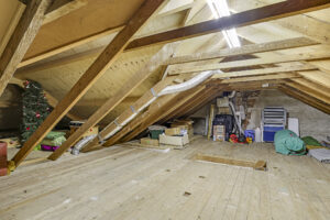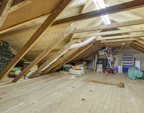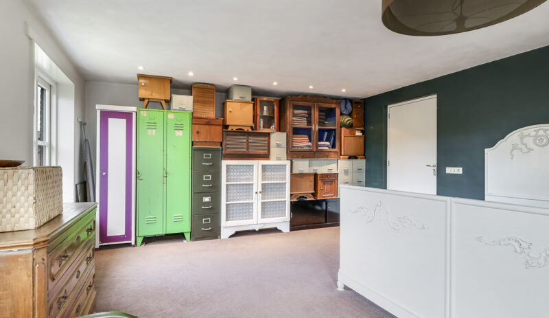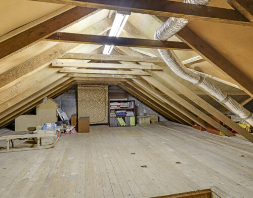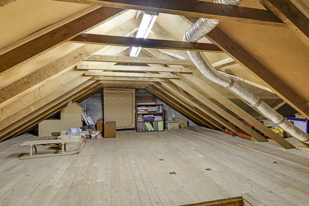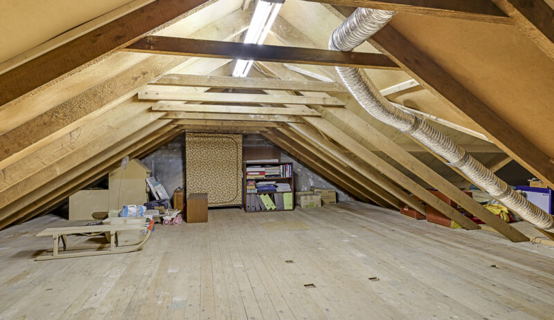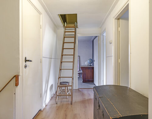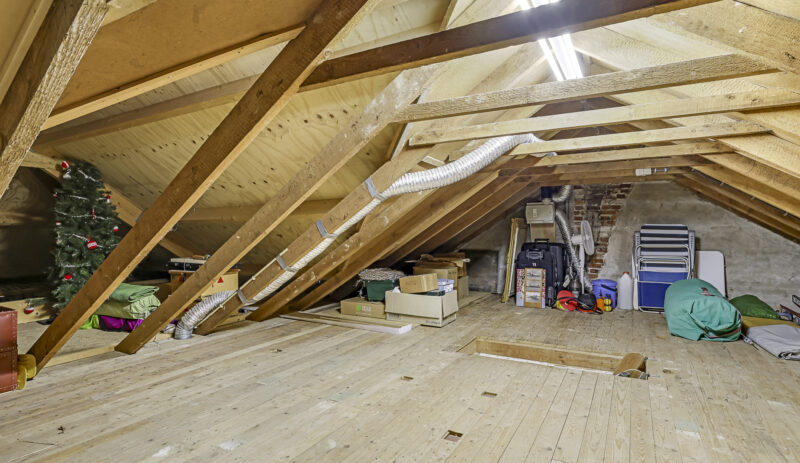 De praktische bergzolder is bereikbaar via een steektrap. Meer dan genoeg plek voor alles wat je niet dagelijks nodig hebt, zoals koffers of seizoensspullen.