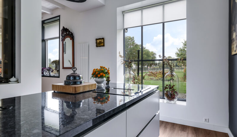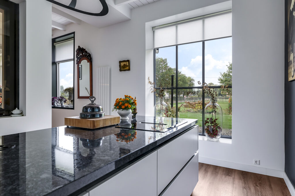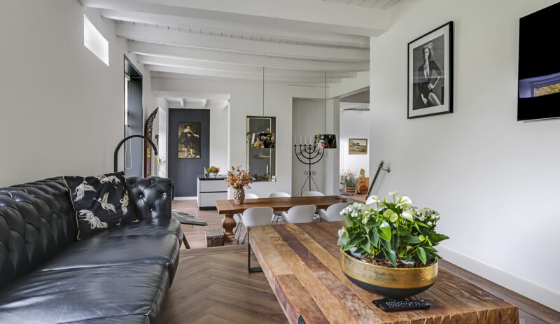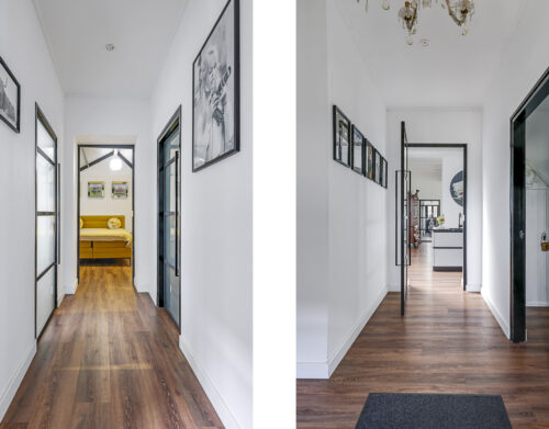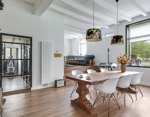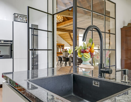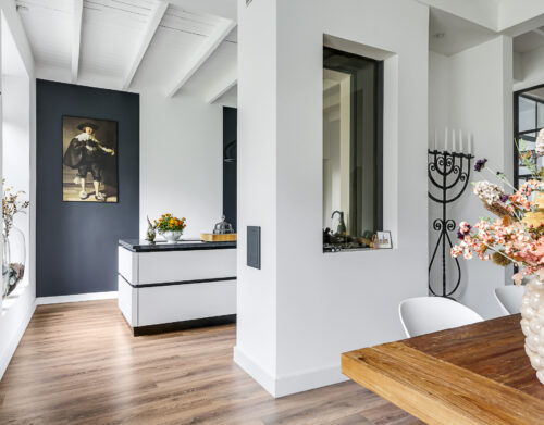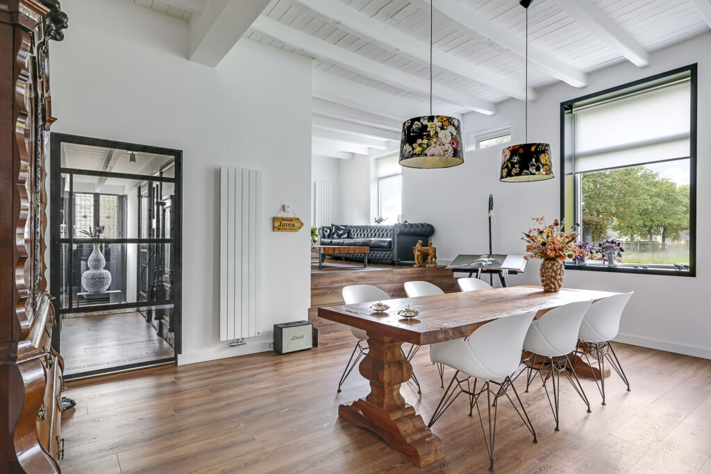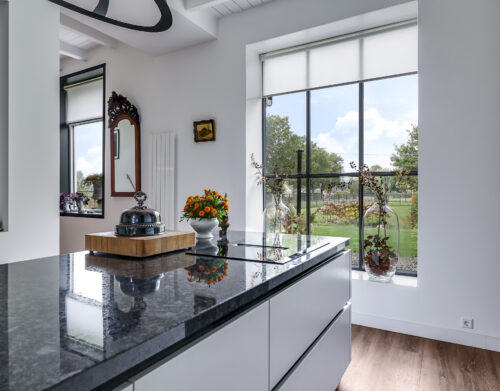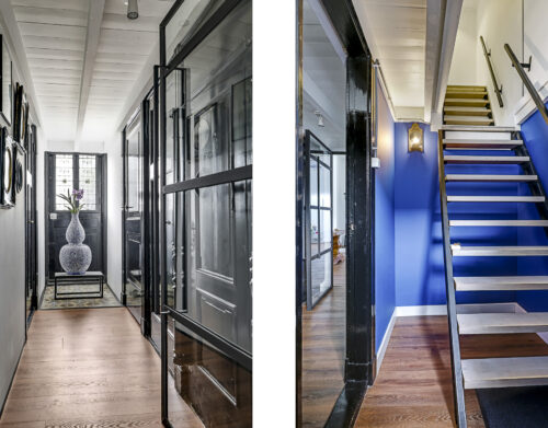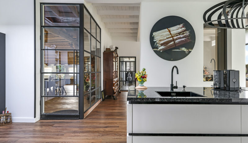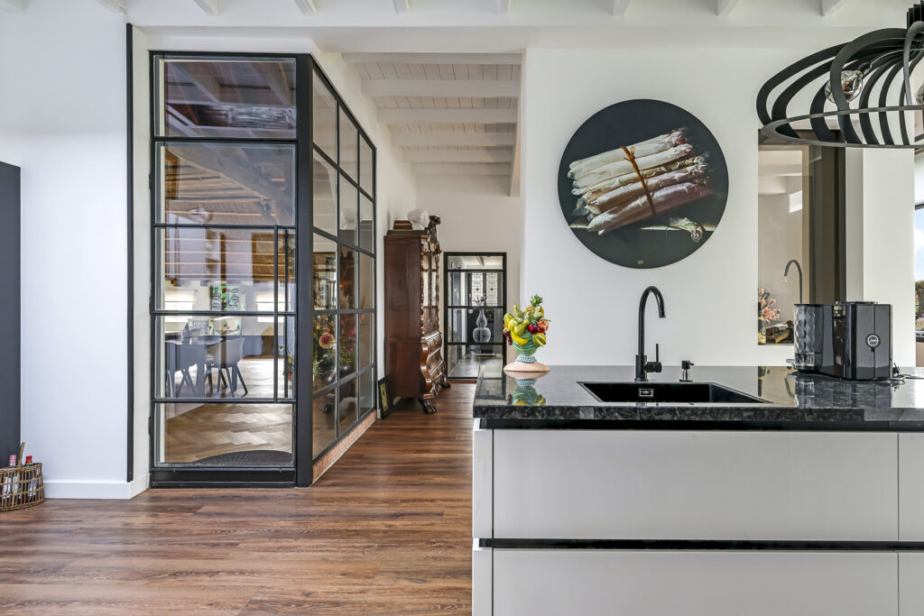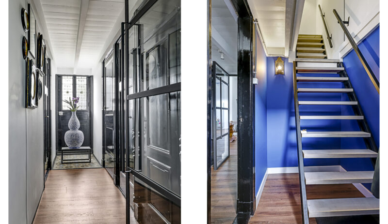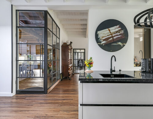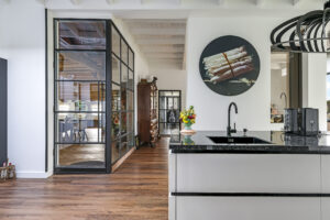De verblijfsruimten bieden hierdoor prachtige zichtlijnen door de gehele woning. Dankzij de stalen glazen deuren blijven het voorhuis, achterhuis en de bovenverdieping op stijlvolle wijze met elkaar verbonden, wat zorgt voor een open en lichte woonsfeer.