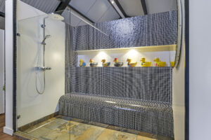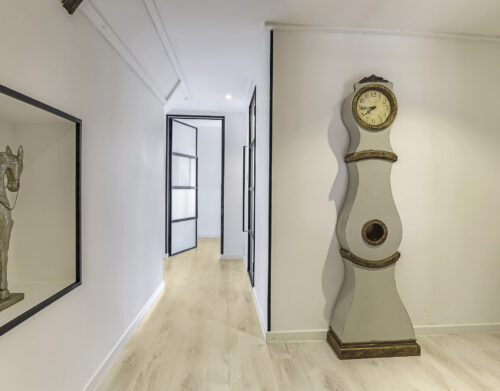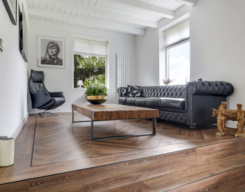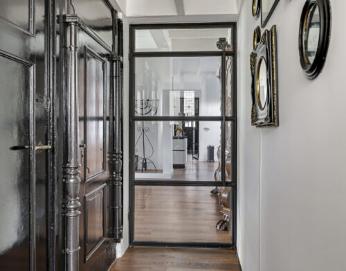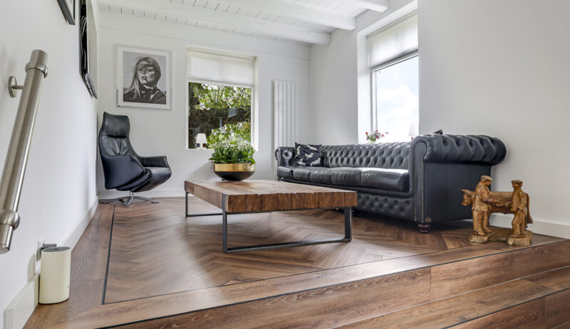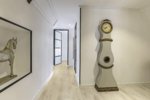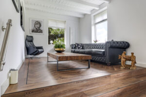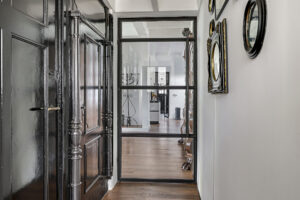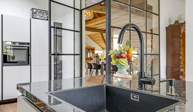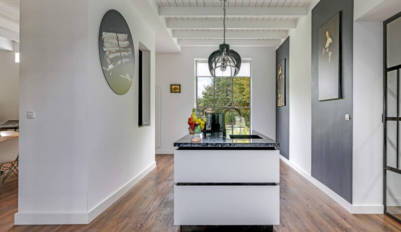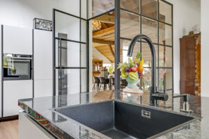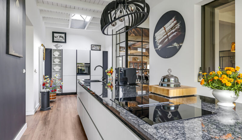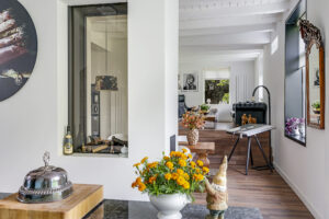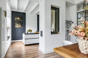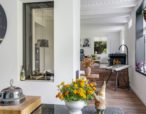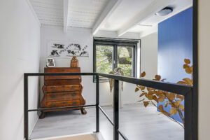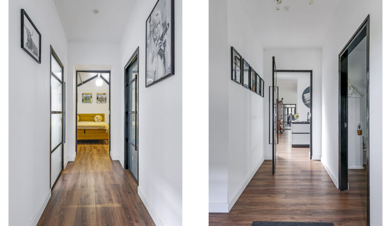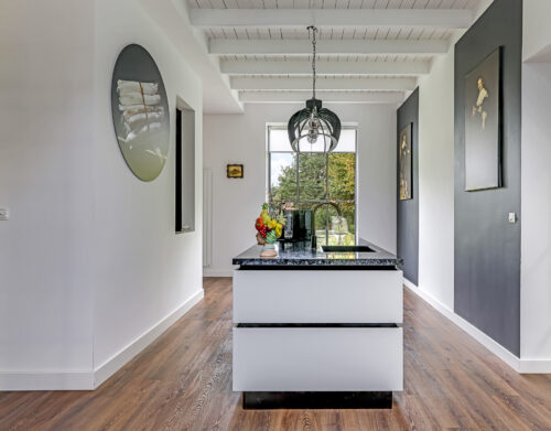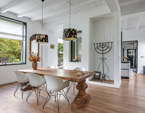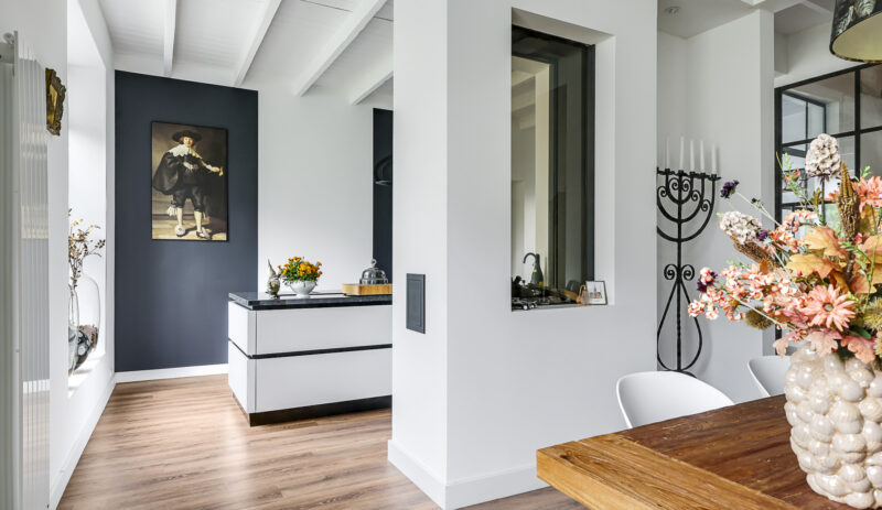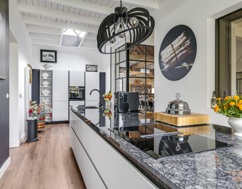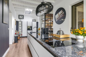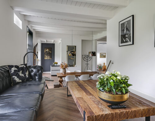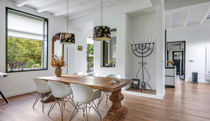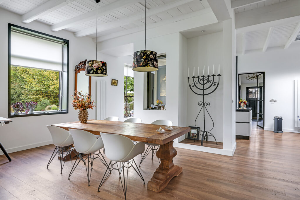De verblijfsruimten bieden hierdoor prachtige zichtlijnen door de gehele woning. Dankzij de stalen glazen deuren blijven het voorhuis, achterhuis en de bovenverdieping op stijlvolle wijze met elkaar verbonden, wat zorgt voor een open en lichte woonsfeer.