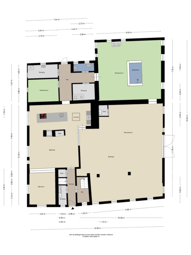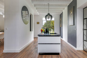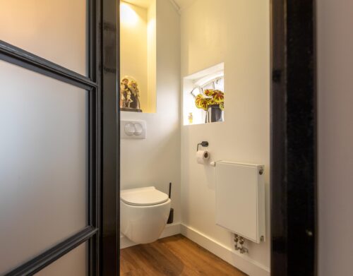 Entree/hal met toilet en toegang tot de kelder. De sfeervolle eetkamer met opkamer, gashaard en open keuken met kookeiland vormt het hart van de woning en biedt zicht op de royale woonkamer, die zich onderscheidt door haar indrukwekkende hoogte tot in de nok. Tijdens de renovatie is veel aandacht besteed aan het behoud van authentieke details, zoals de karakteristieke gebinten en de oorspronkelijke indeling, gecombineerd met moderne materialen en technieken.