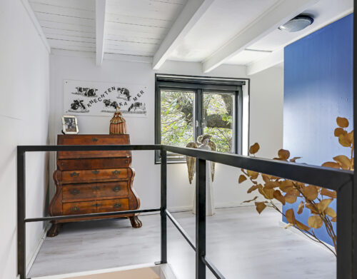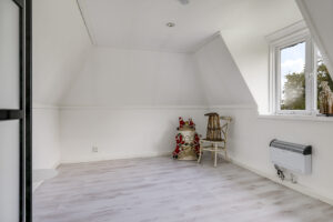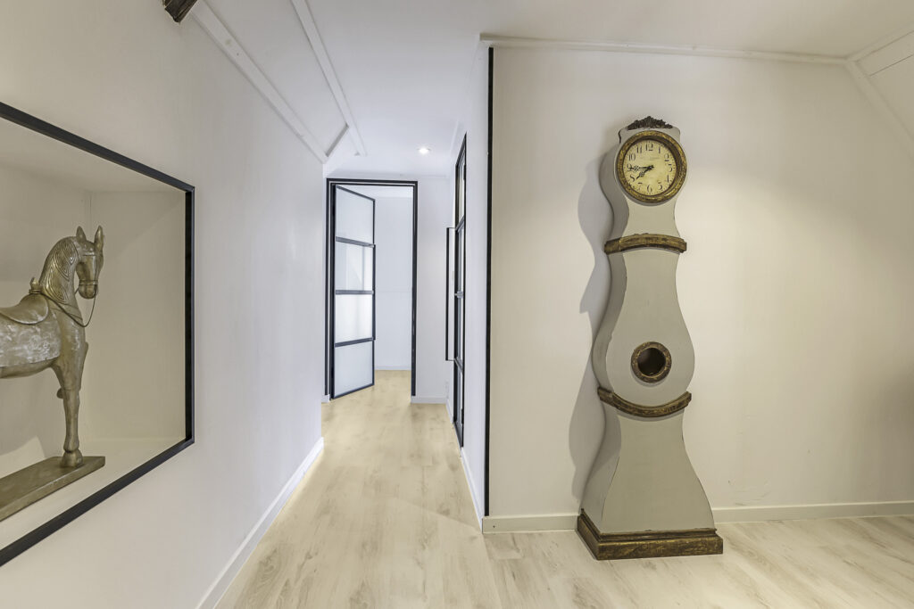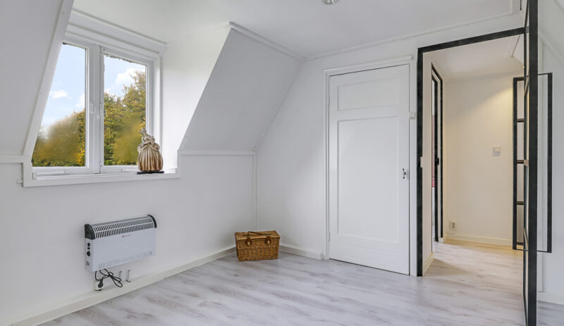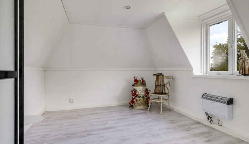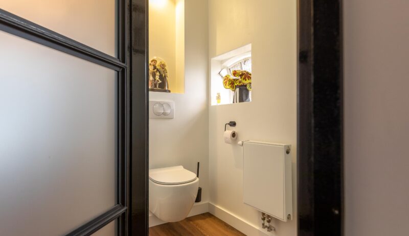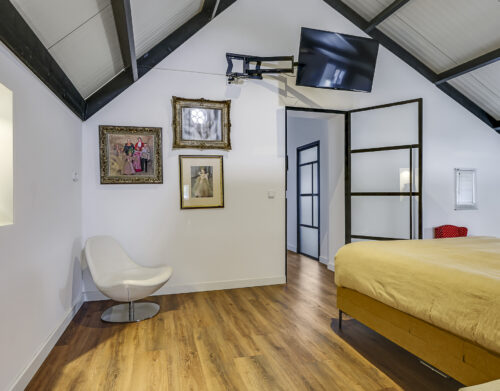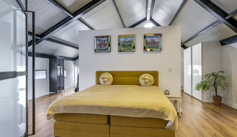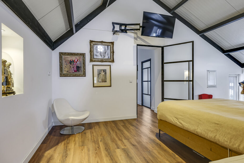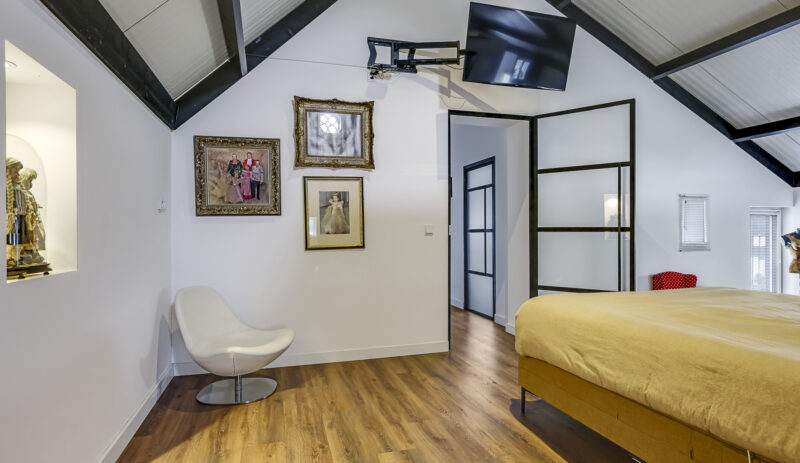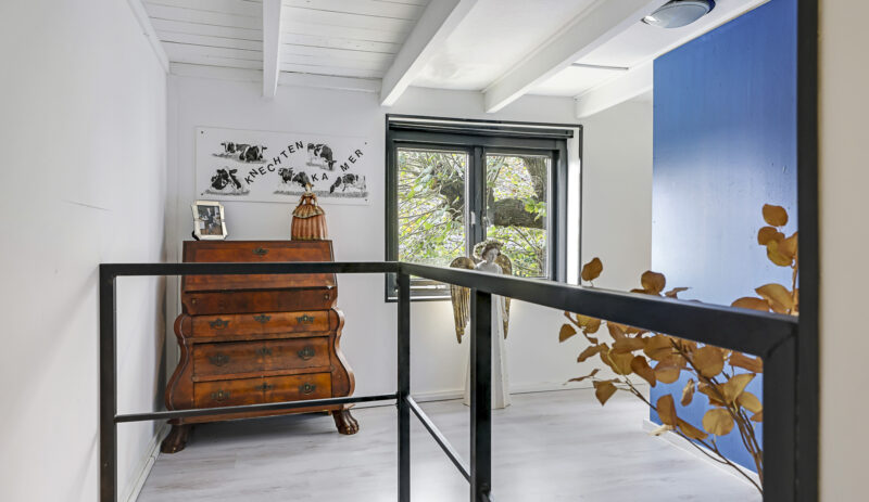 Op de verdieping bevindt zich een overloop met toegang tot drie (slaap)kamers, waaronder één met een originele bedstee, en een moderne badkamer. Via een stalen deur met glas biedt de overloop opnieuw uitzicht op de voormalige deel – een prachtige en sfeervolle verbinding tussen het beneden- en bovengedeelte van de woning.