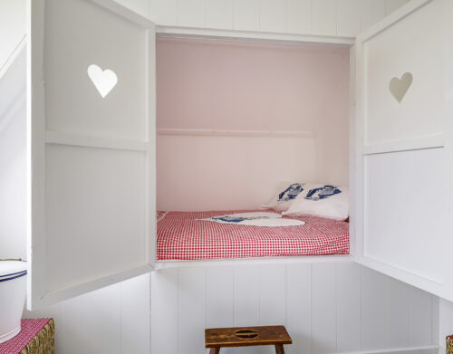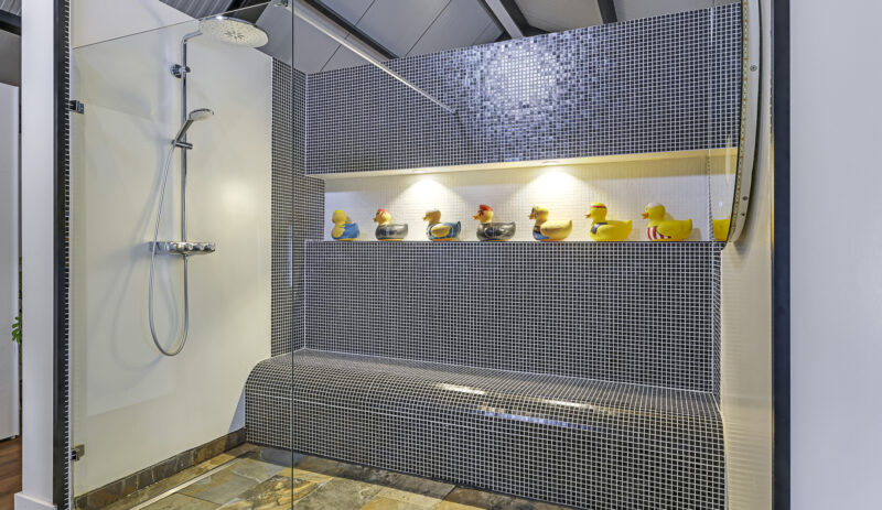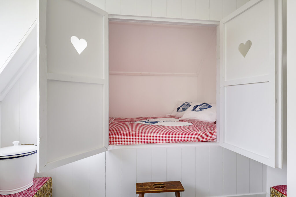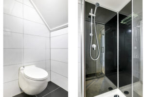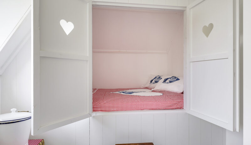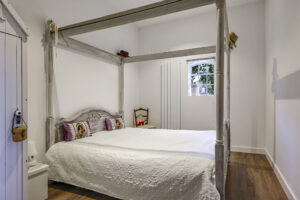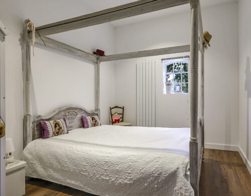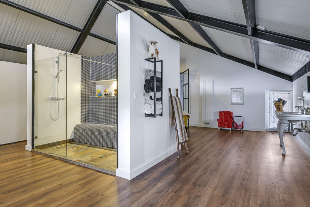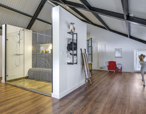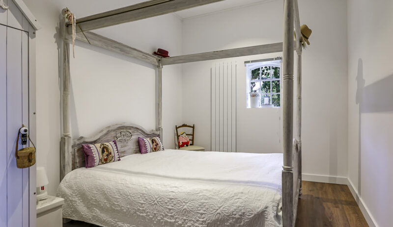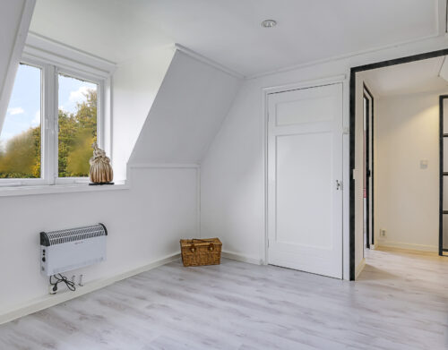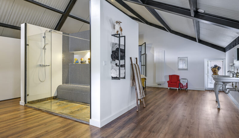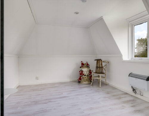 Op de verdieping bevindt zich een overloop met toegang tot drie (slaap)kamers, waaronder één met een originele bedstee, en een moderne badkamer. Via een stalen deur met glas biedt de overloop opnieuw uitzicht op de voormalige deel – een prachtige en sfeervolle verbinding tussen het beneden- en bovengedeelte van de woning.