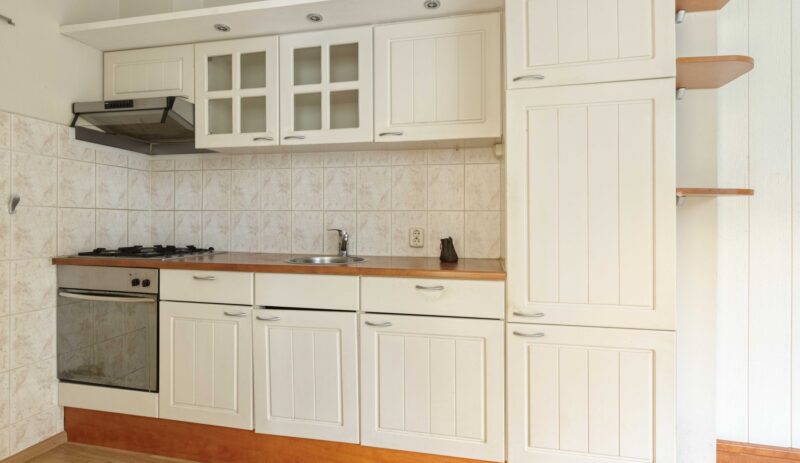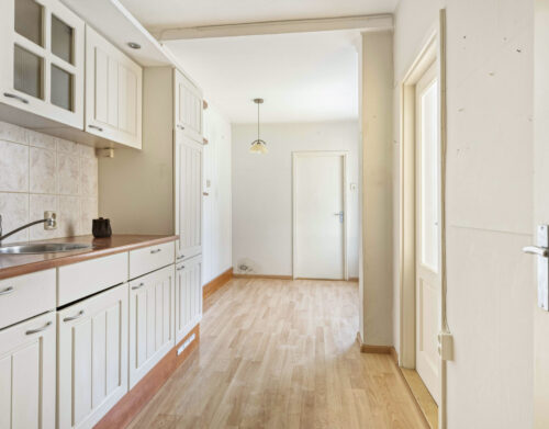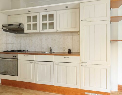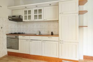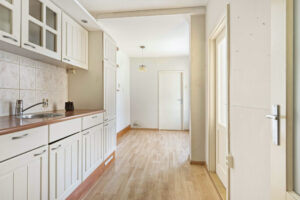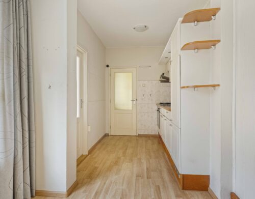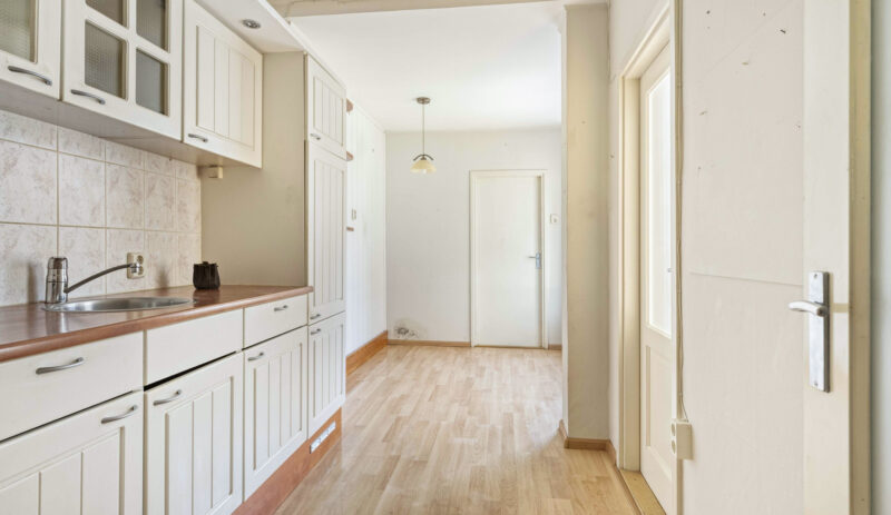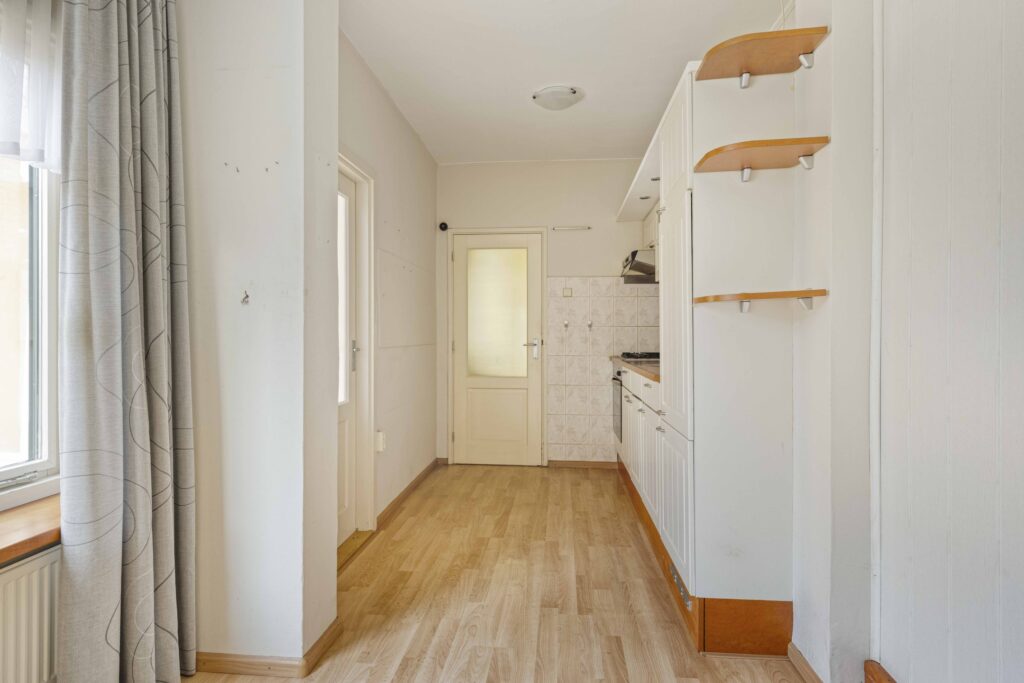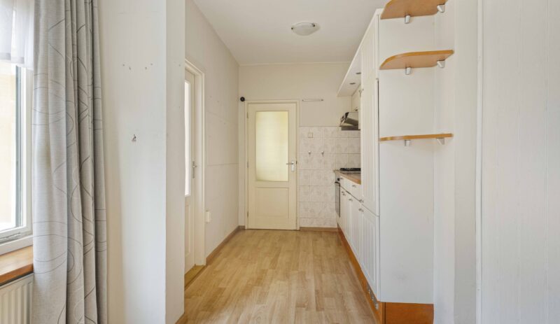 Je komt binnen in de hal met toiletruimte, meterkast, trapopgang naar de verdieping en een handige verdiepte trapkast. Vanuit de hal heb je toegang tot de uitgebouwde woonkeuken. De keuken is voorzien van een eenvoudig keukenblok met een oven, gaskookplaat, afzuigkap en een koelkast.