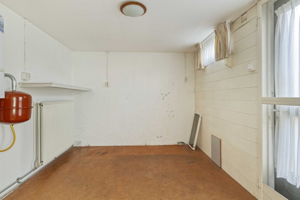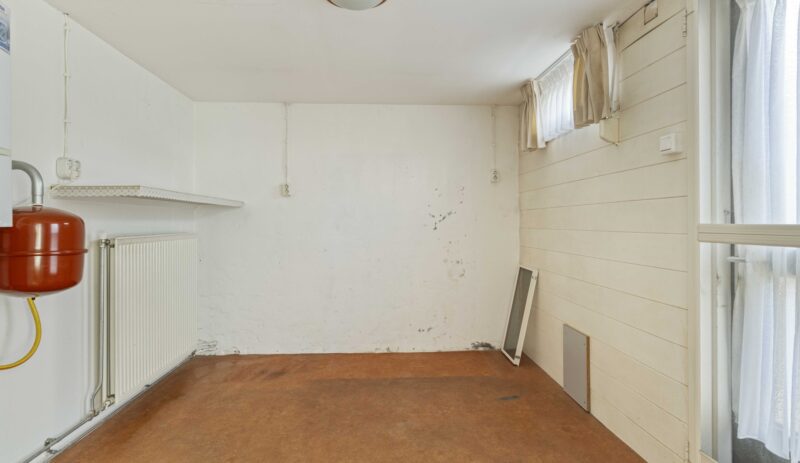 Aan de achterzijde van de keuken bevindt zich de bijkeuken met aansluiting voor de wasmachine, de opstelling van de cv-ketel (Vaillant, 2008), verwarming en een deur naar de achtertuin.