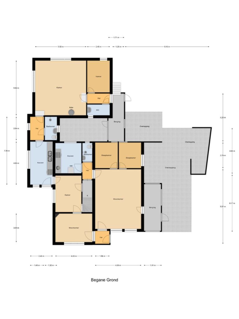 Bij binnenkomst tref je één van de vier hallen, die toegang geven tot verschillende leefruimtes. De begane grond is ruim van opzet en beschikt over twee woonkamers, twee keukens, twee badkamers, een aparte toiletruimte en meerdere (slaap)kamers. Deze ruimtes zijn flexibel in te delen als bijvoorbeeld werkkamer, hobbyruimte of levensloopbestendige slaapkamer.