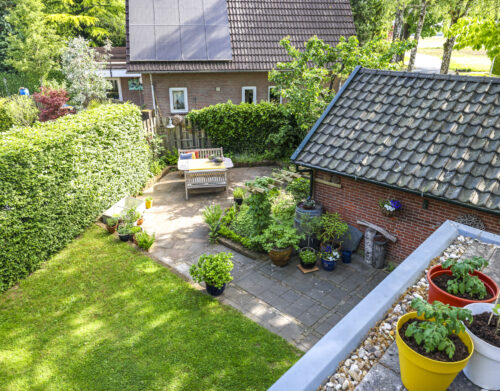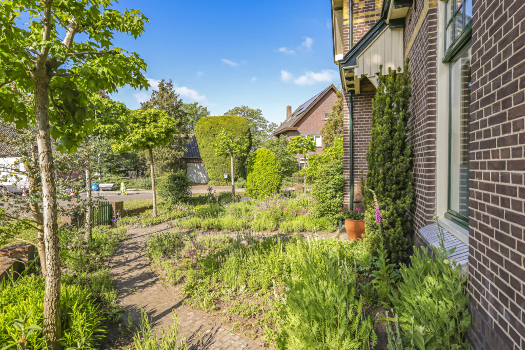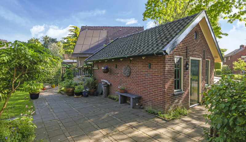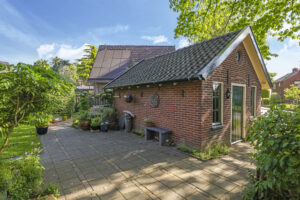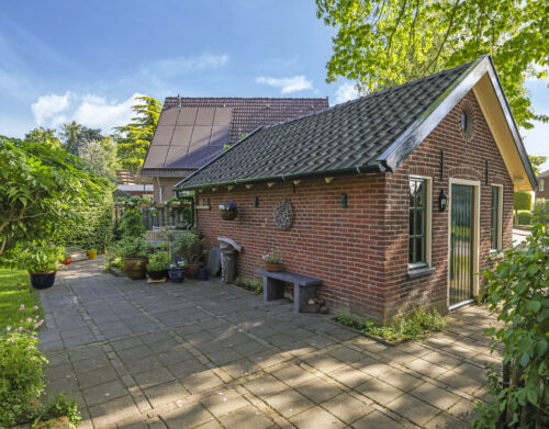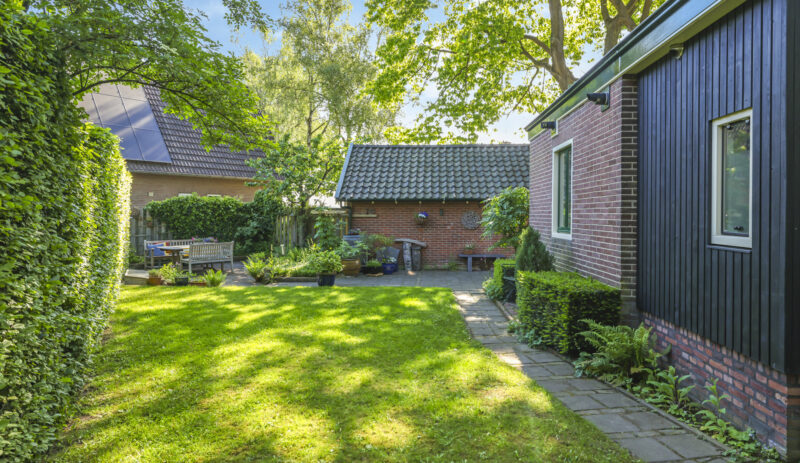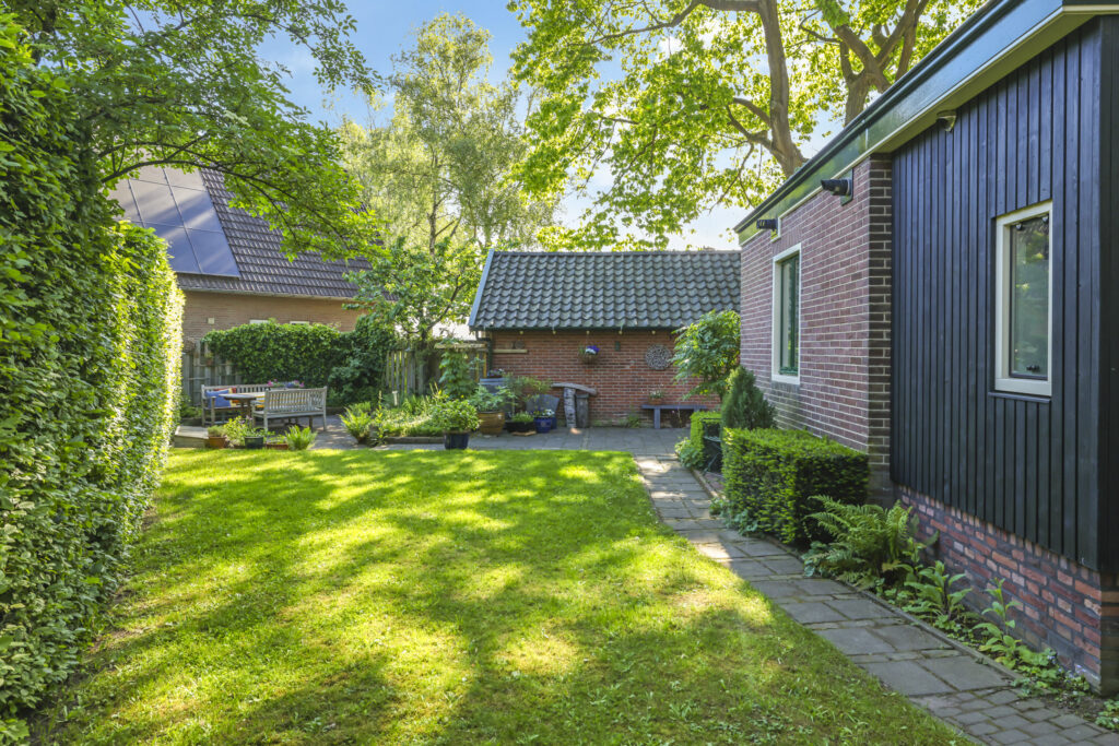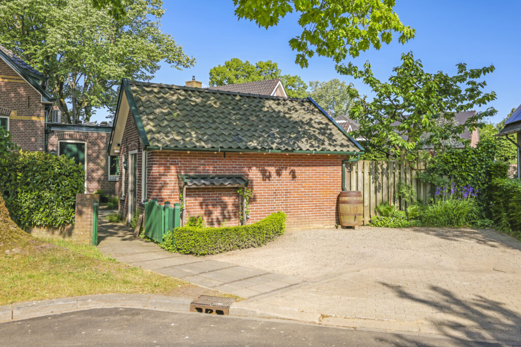De tuin ligt rondom het huis en is met zorg aangelegd en onderhouden. Of je nu graag in de zon zit, in de schaduw leest of lekker tuiniert: alles is hier mogelijk. De grote stenen schuur met vliering biedt volop plek voor fietsen, gereedschap of een hobbyruimte. En op de eigen oprit is ruimte voor twee auto’s.