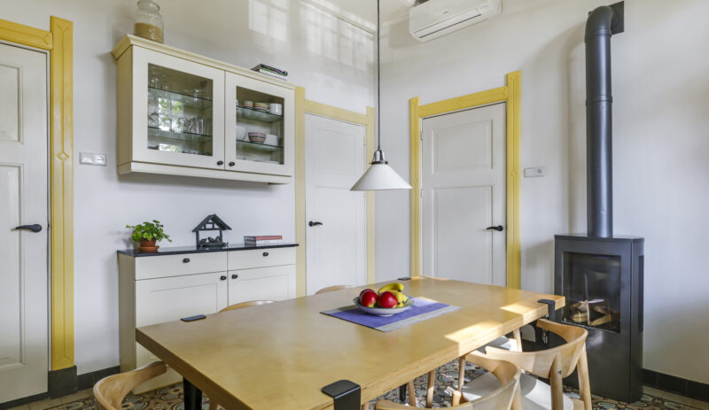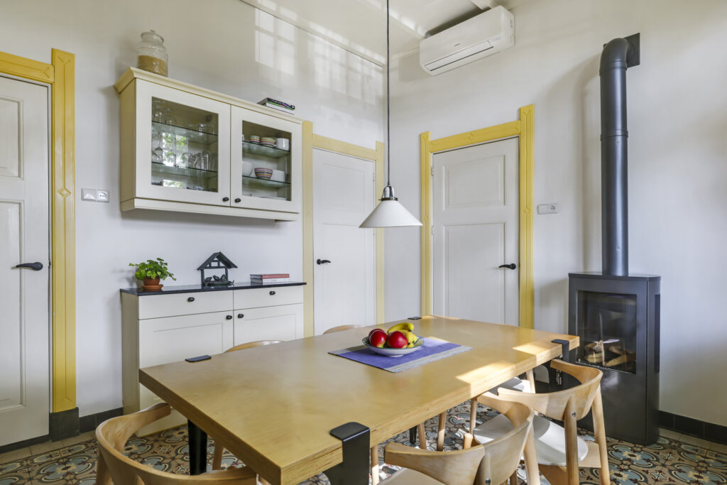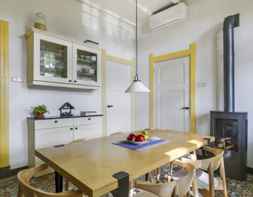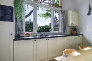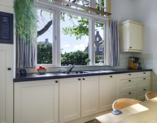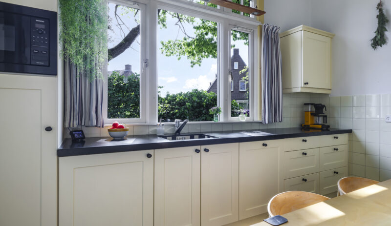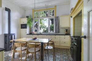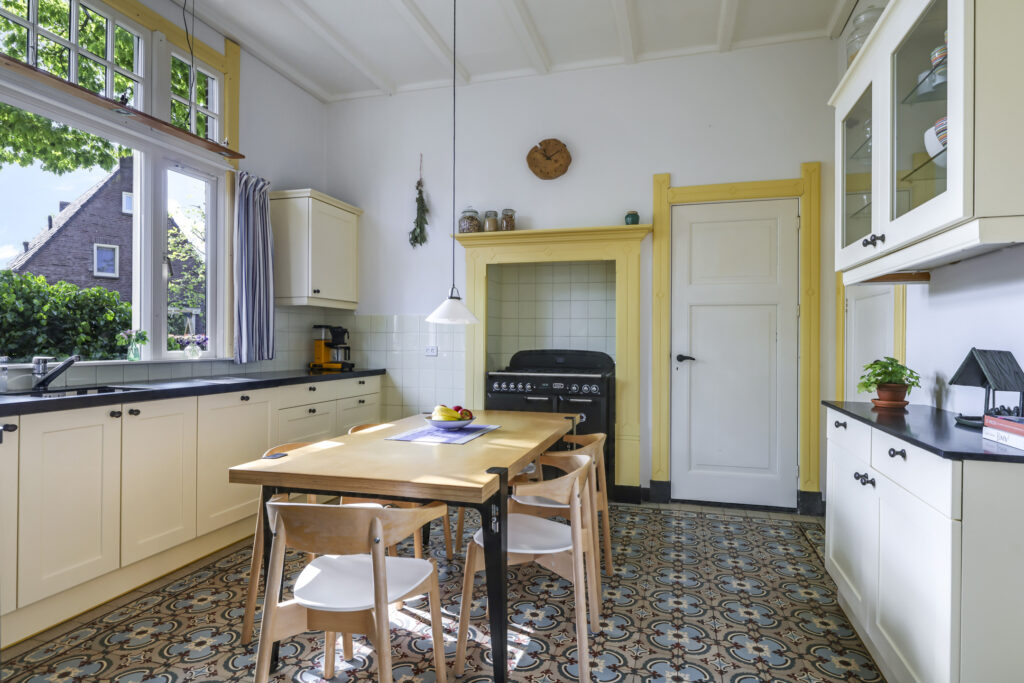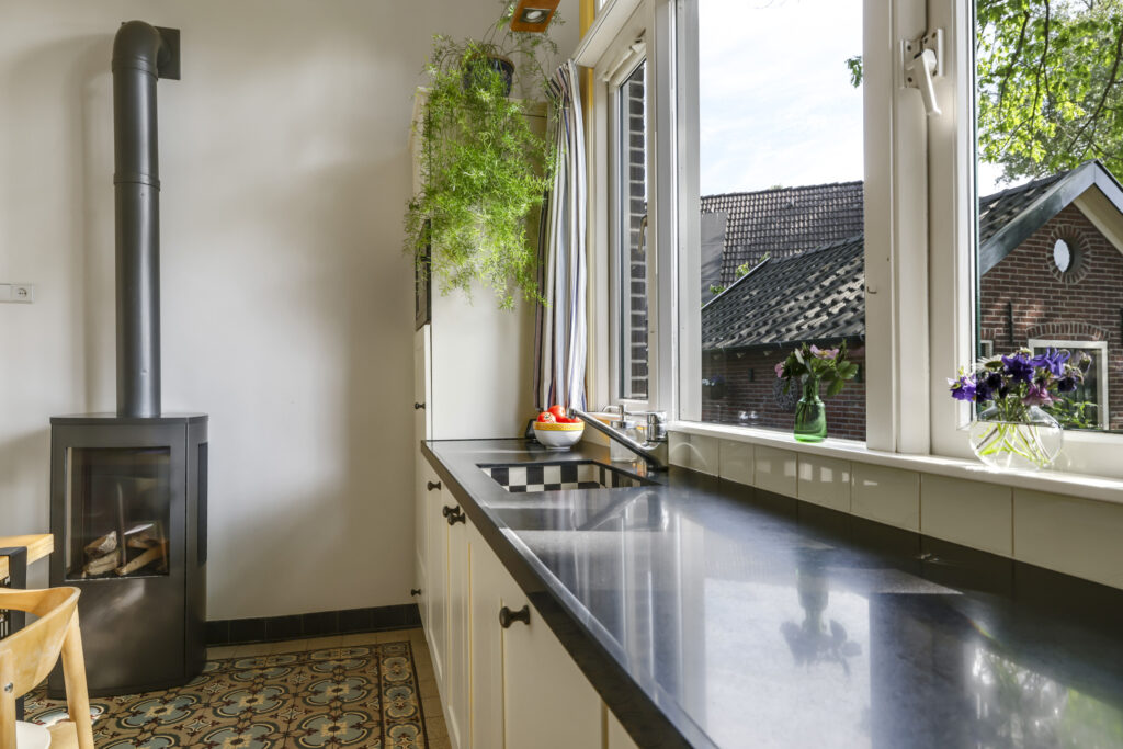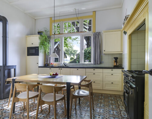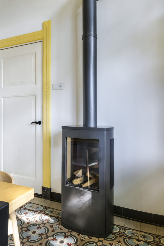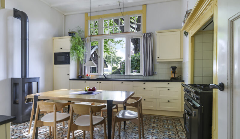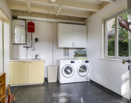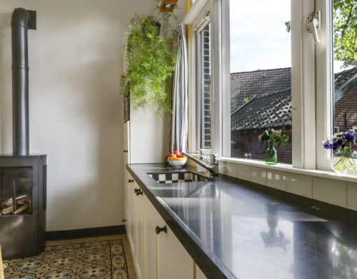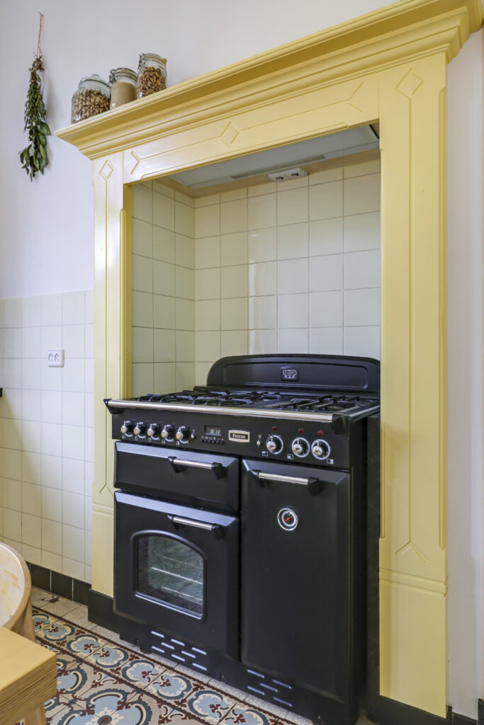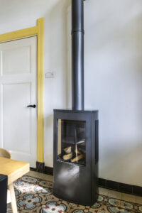 De sfeer proef je meteen als je binnenstapt. In de woonkamer ensuite zorgen twee gezellige gashaarden – één in de voor- en één in de achterkamer – voor warmte en sfeer. Aan de achterzijde van de woning ligt de royale leefkeuken, een echte woonkeuken waar je graag samenkomt. De keuken is voorzien van moderne inbouwapparatuur (een koelkast, magnetron, vaatwasser en een kooktoestel bestaande uit een gasformuis, grill, heteluchtoven en bordenwarmer), een sfeervolle gashaard én een airco die zowel verwarmt als koelt. Via de keuken bereik je een praktische provisiekelder en een ruime bijkeuken met aansluitingen voor wasmachine en droger en de CV-opstelling.