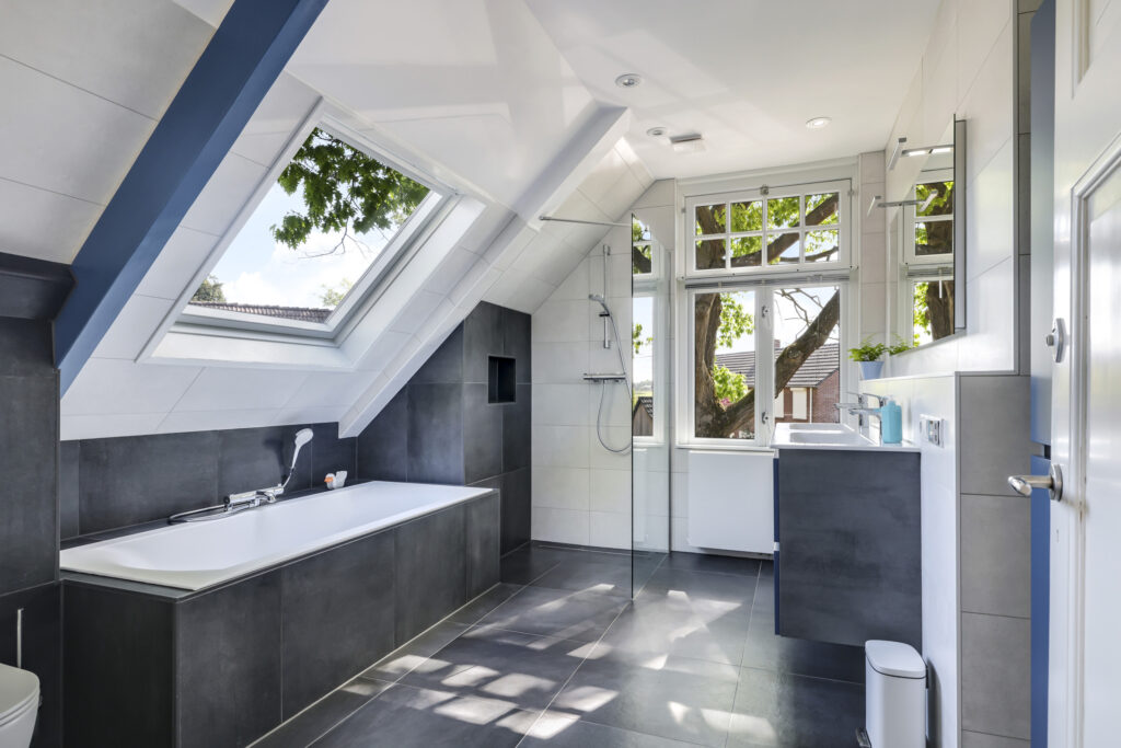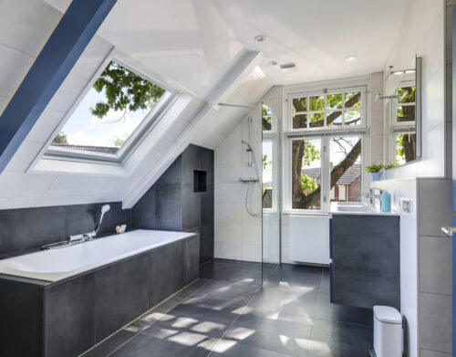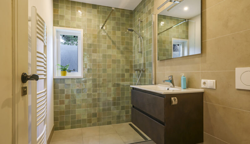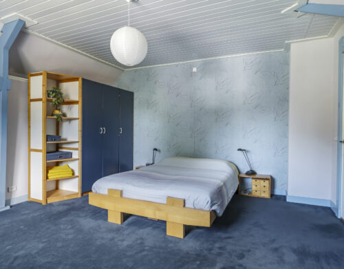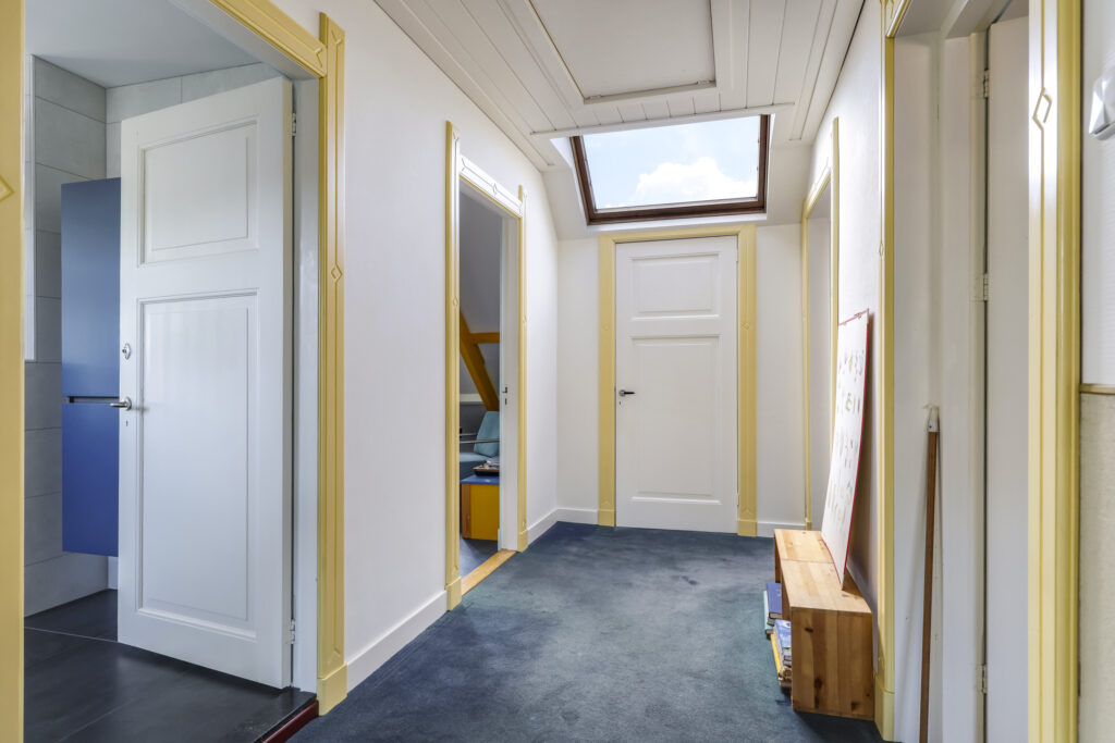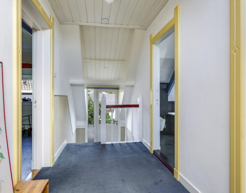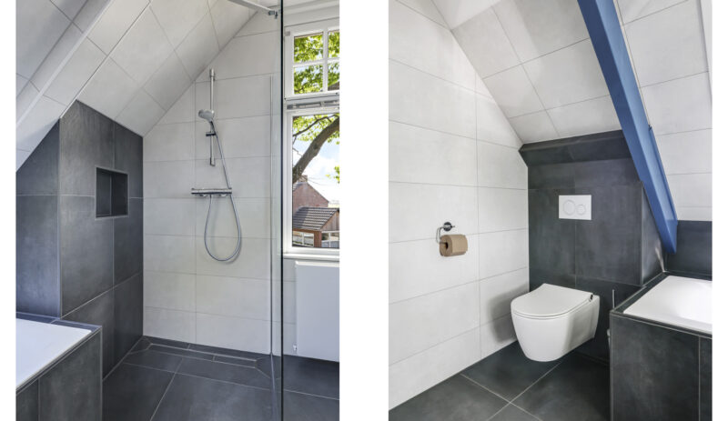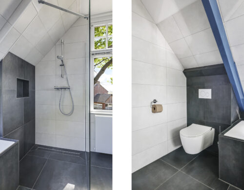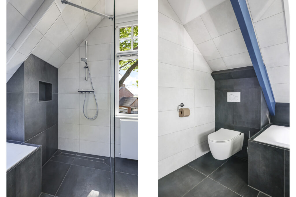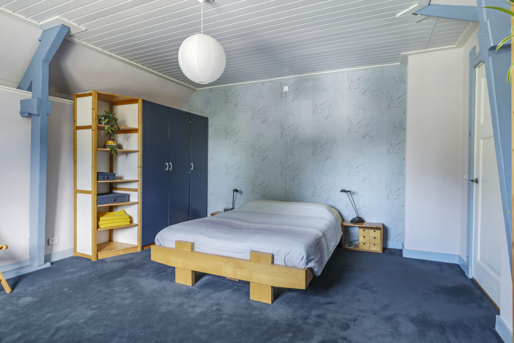 Op de eerste verdieping zijn drie royale slaapkamers en een tweede, luxe badkamer (2021), compleet met ligbad, inloopdouche, dubbel wastafelmeubel, hangtoilet en opnieuw een verwarmde spiegel. De overloop geeft toegang tot een bergkast én het platte dak. Via een vlizotrap bereik je bovendien nog een ruime bergzolder die volop opbergmogelijkheden biedt.