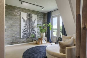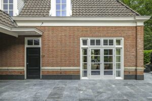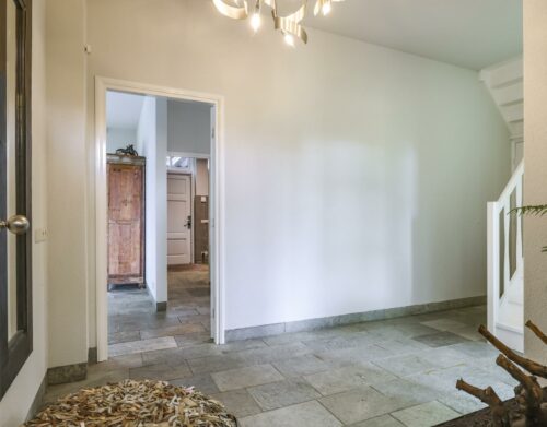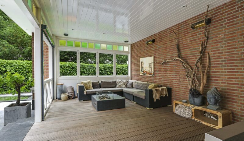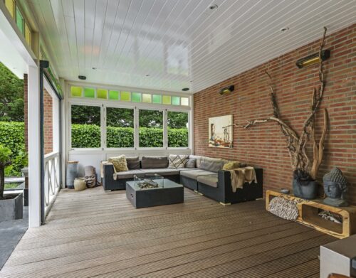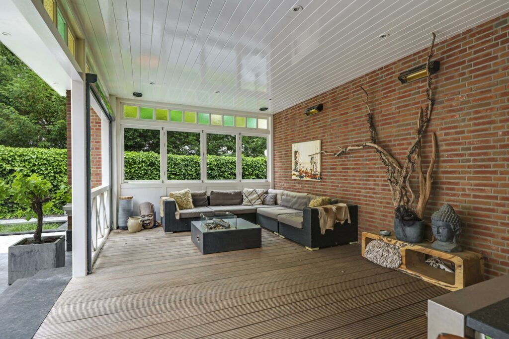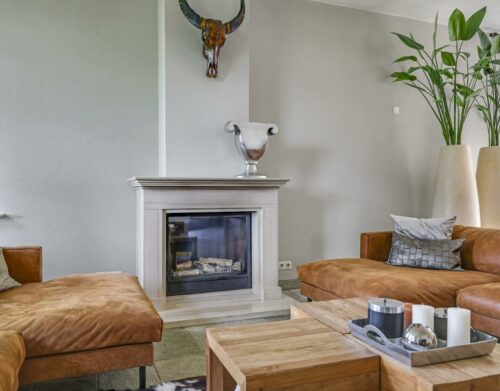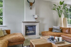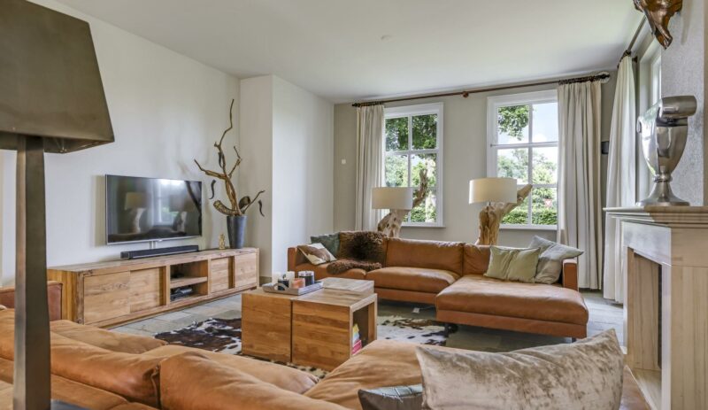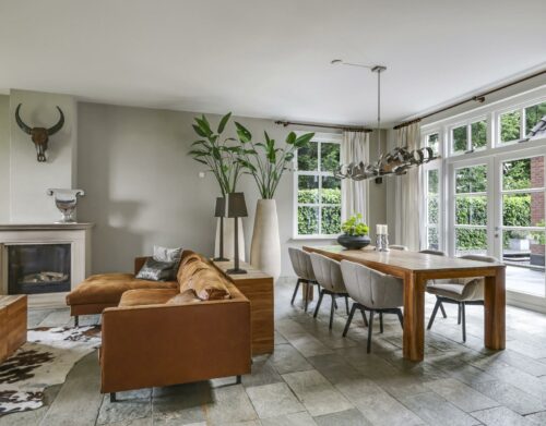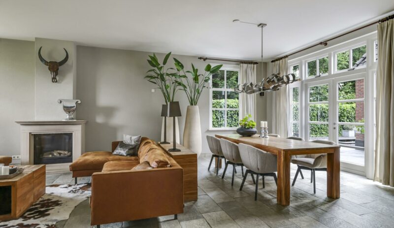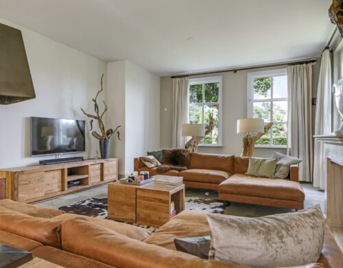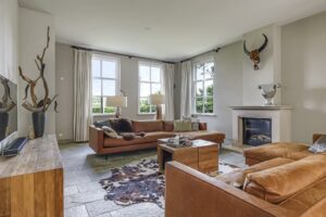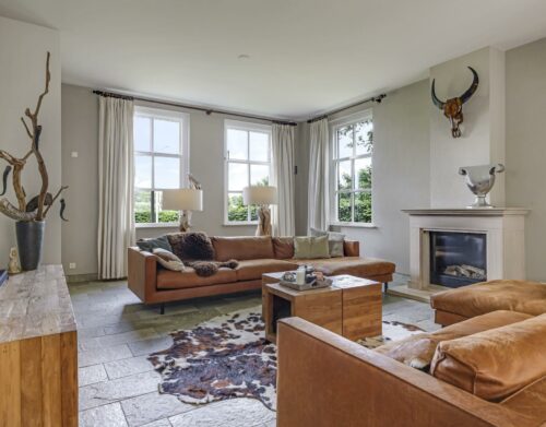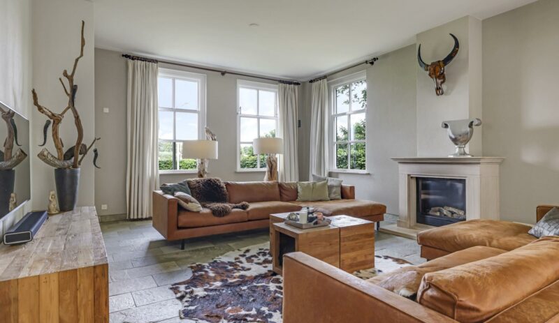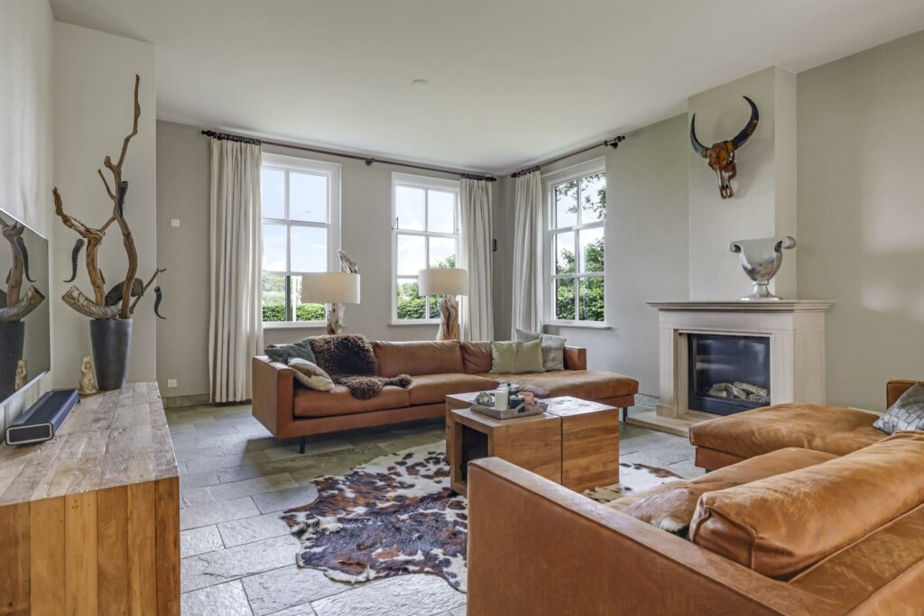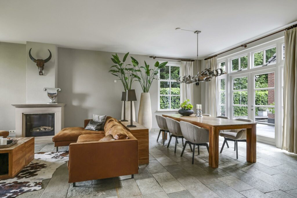 De woonkamer kenmerkt zich door de overvloed aan lichtinval en uitzicht, een sfeervolle gashaard met klassieke schouw, en een stijlvolle natuurstenen vloer. Openslaande deuren geven toegang tot de tuin.