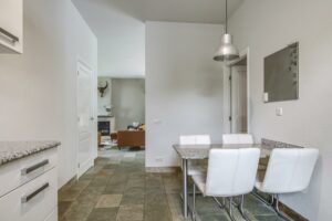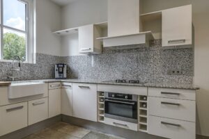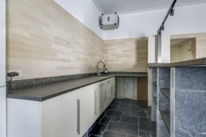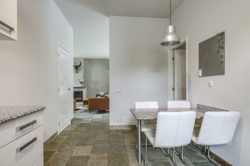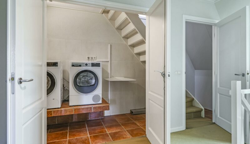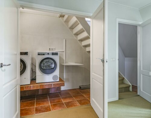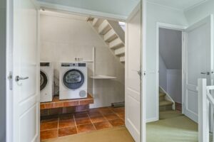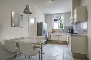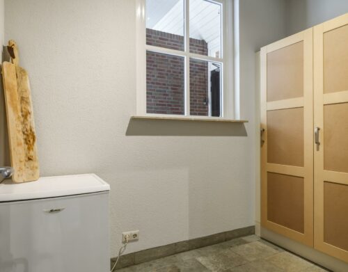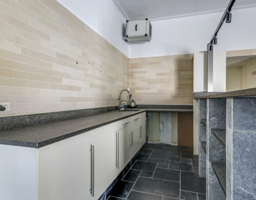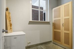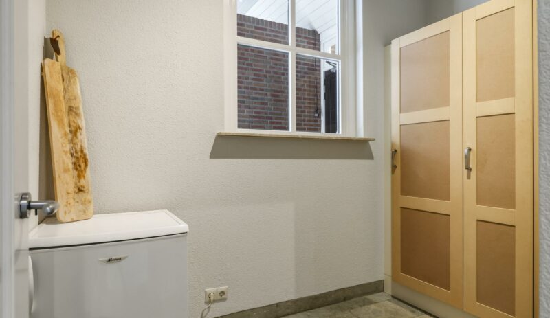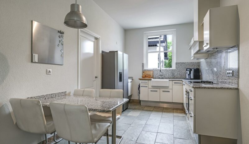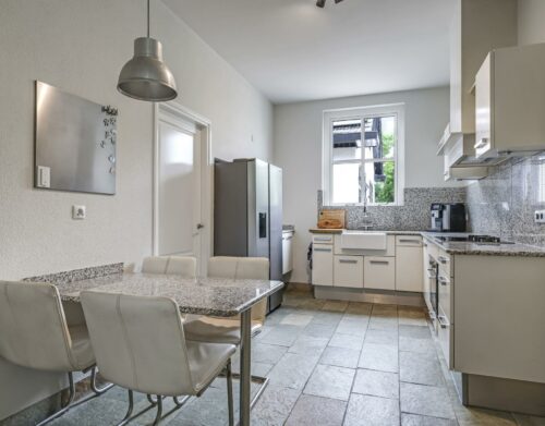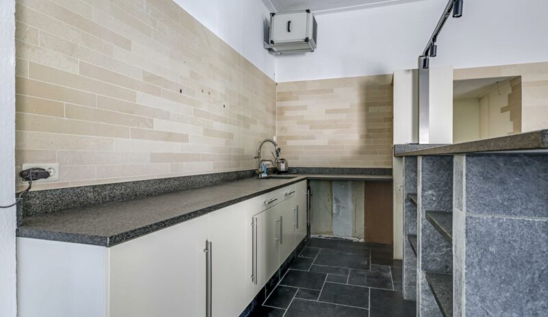 Het aanrechtblad is uitgevoerd in natuursteen, wat bijdraagt aan de luxe uitstraling. Vanuit de keuken is er toegang tot de bijkeuken en een berging.