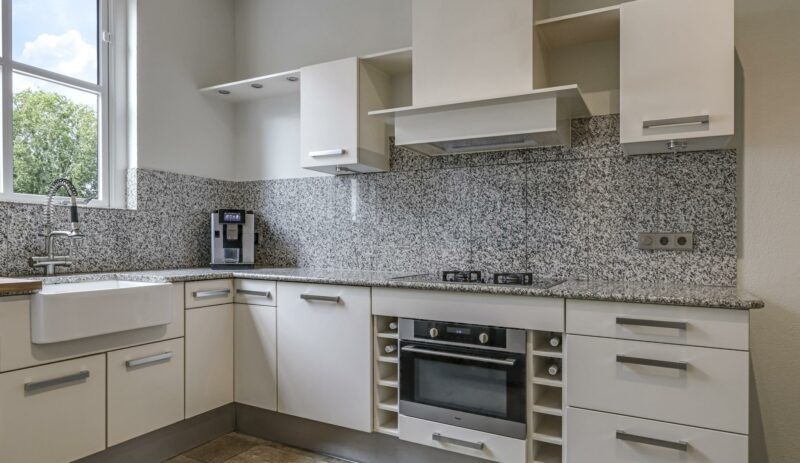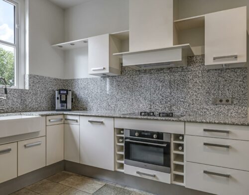 De moderne half open keuken is voorzien van hoogwaardige inbouwapparatuur, waaronder een kookplaat (gas/inductiecombinatie), combi-oven, vaatwasser, afzuigkap en een vrijstaande koel-/vriescombinatie.