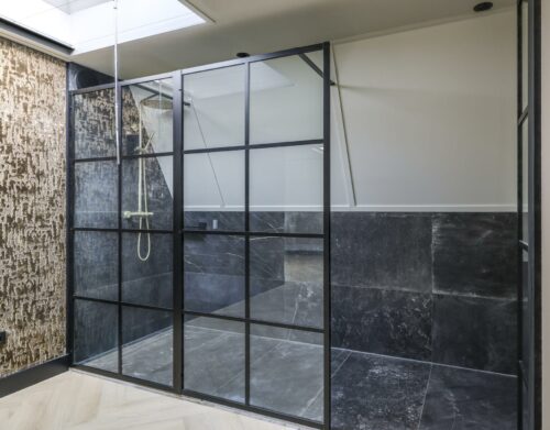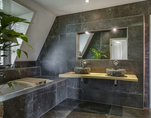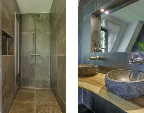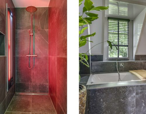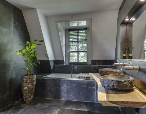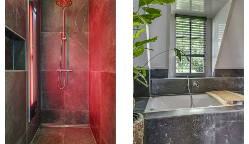 De badkamer is voorzien van, een ruim ligbad, inloopdouche met sunshower en dubbele waskommen. Ook hier is vloerverwarming aanwezig, voor extra comfort.