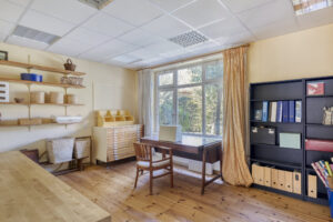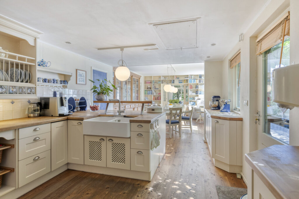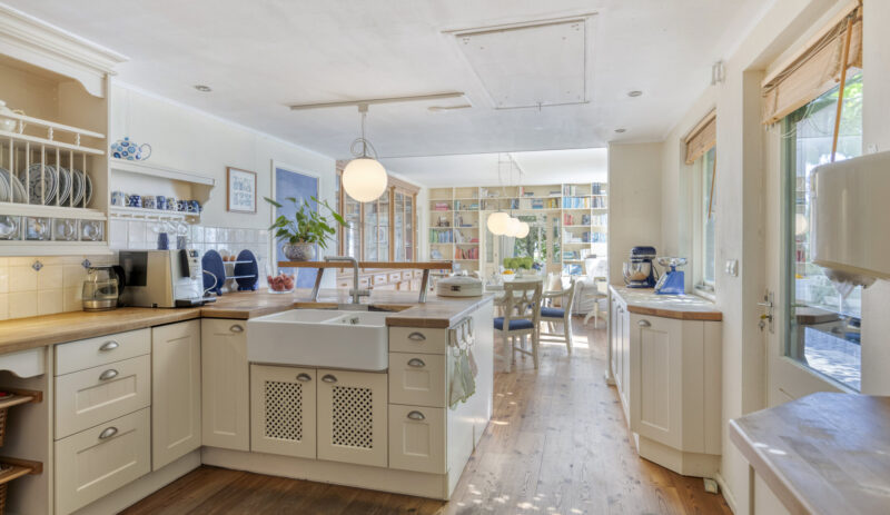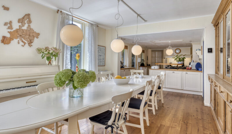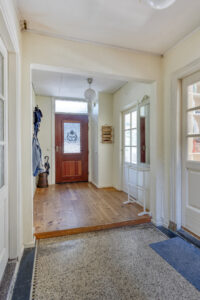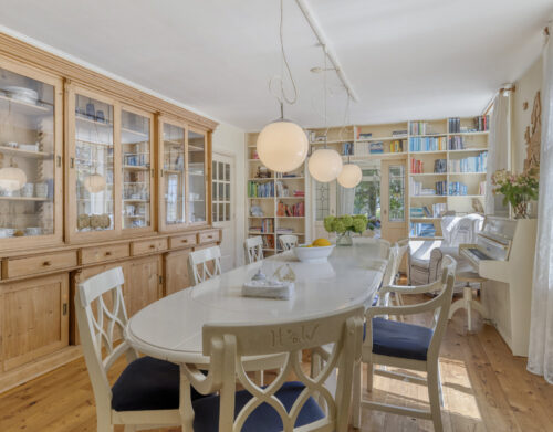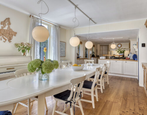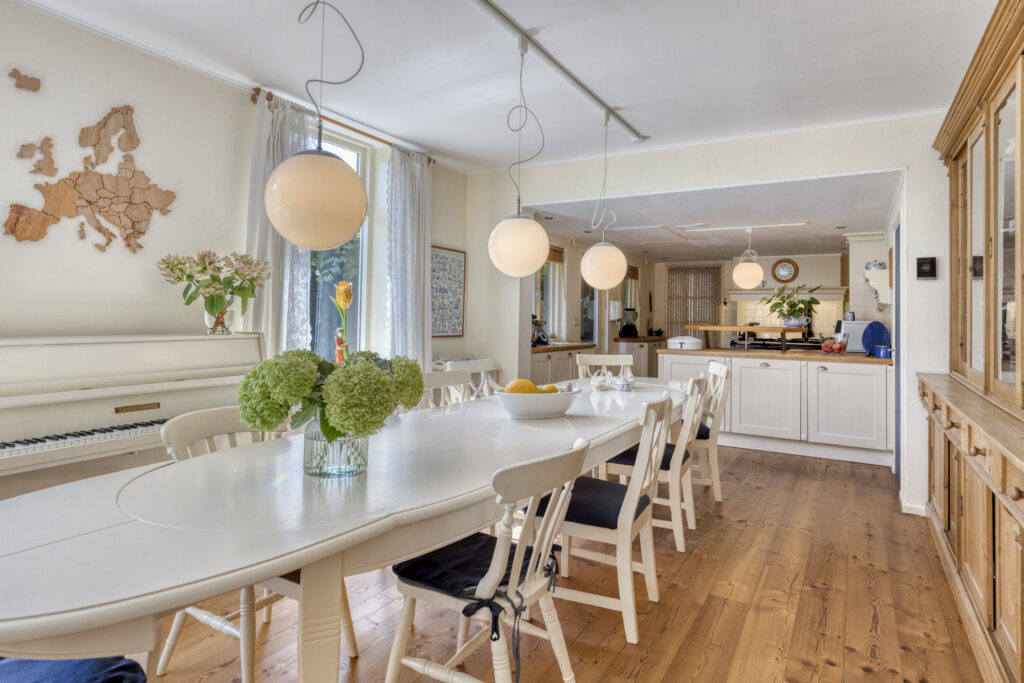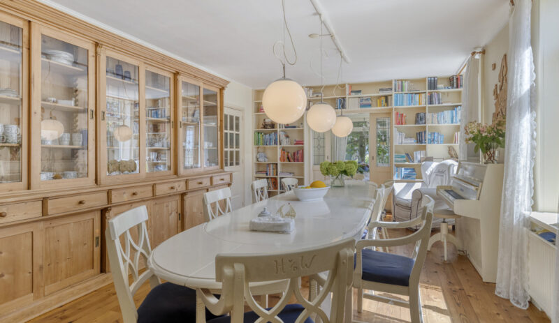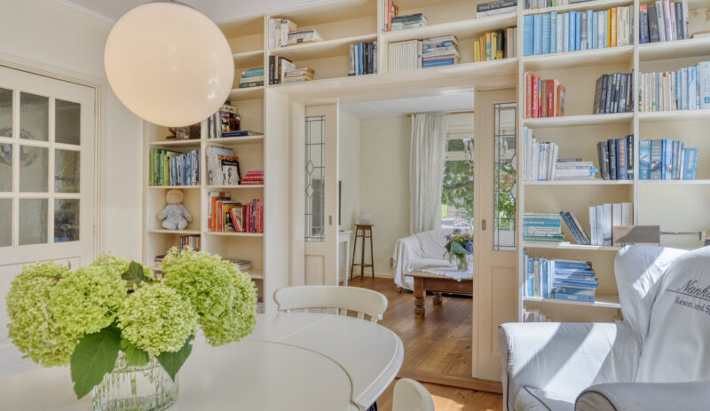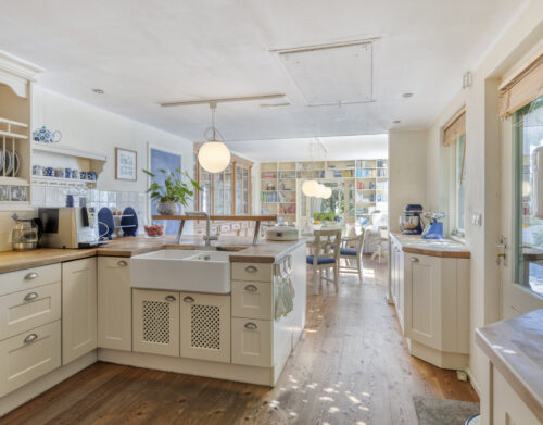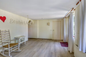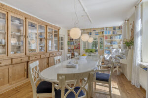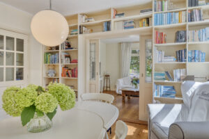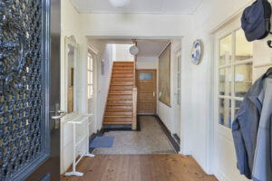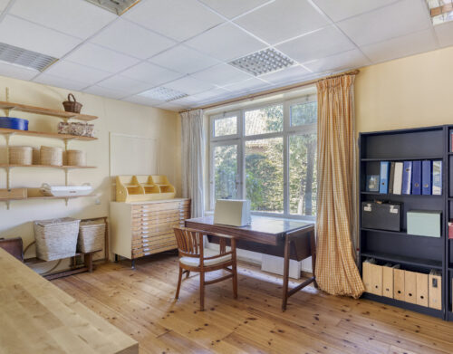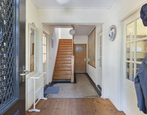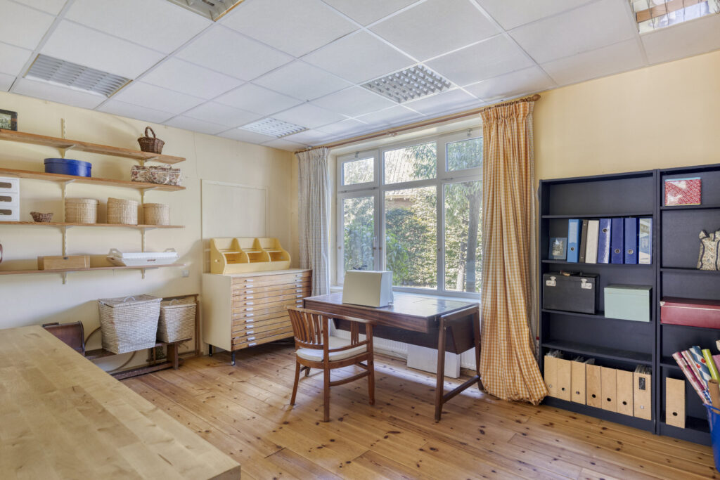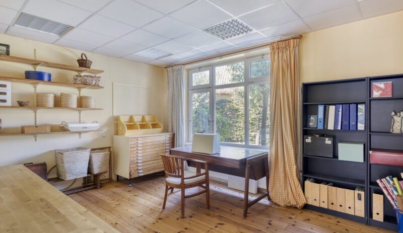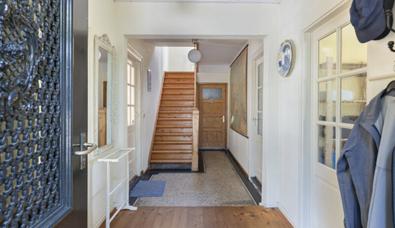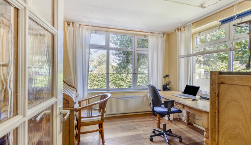 De ruime lichte hal met originele granito vloer verdeelt de beneden verdieping in twee delen met aan de rechter kant twee zeer ruime kamers, welke ook te gebruiken zijn als thuiskantoor, slaapkamer of hobby ruimte. Ideaal voor bedrijf aan huis. Aan de linker kant van de woning bevinden zich een zeer ruime woon/zitkamer waar kamer en suitedeuren direct toegang geven tot de indrukwekkend grote keuken.