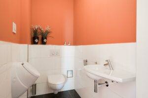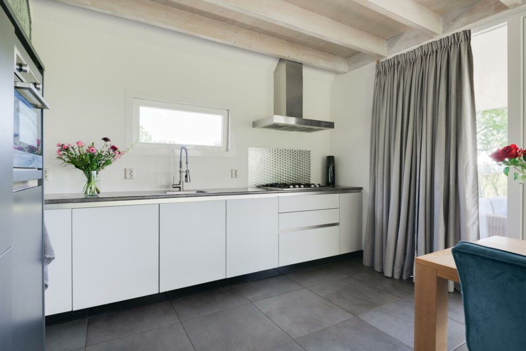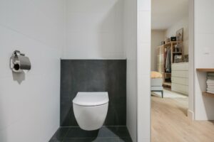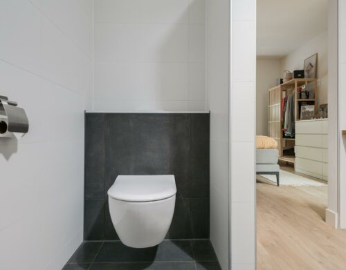 Je komt binnen via de entree en ontvangsthal met separate toiletruimte. Vanuit hier bereik je de open keuken, voorzien van modern keukenblok en inbouwapparatuur. Aangrenzend bevindt zich een compacte technische ruimte die ook geschikt is als berging, geschikt voor opslag of witgoed.
