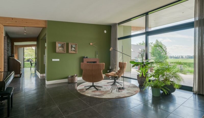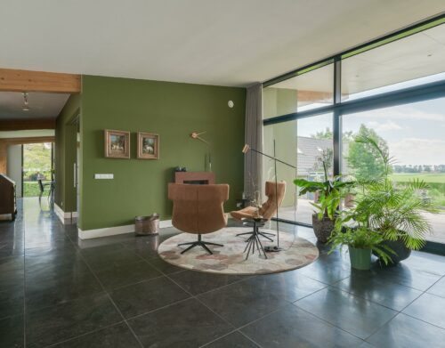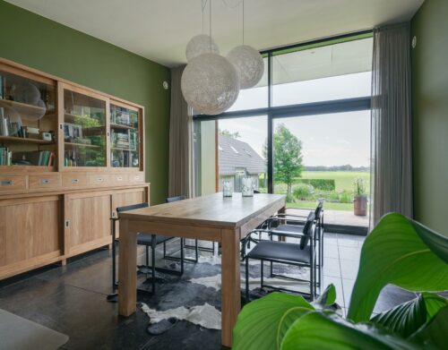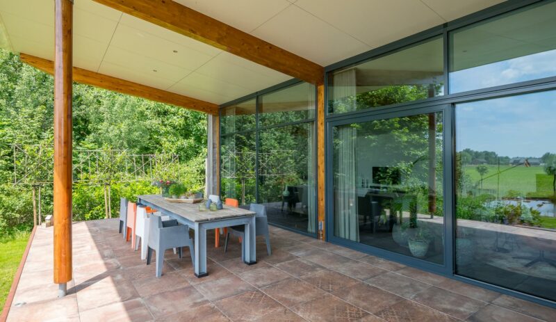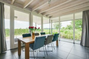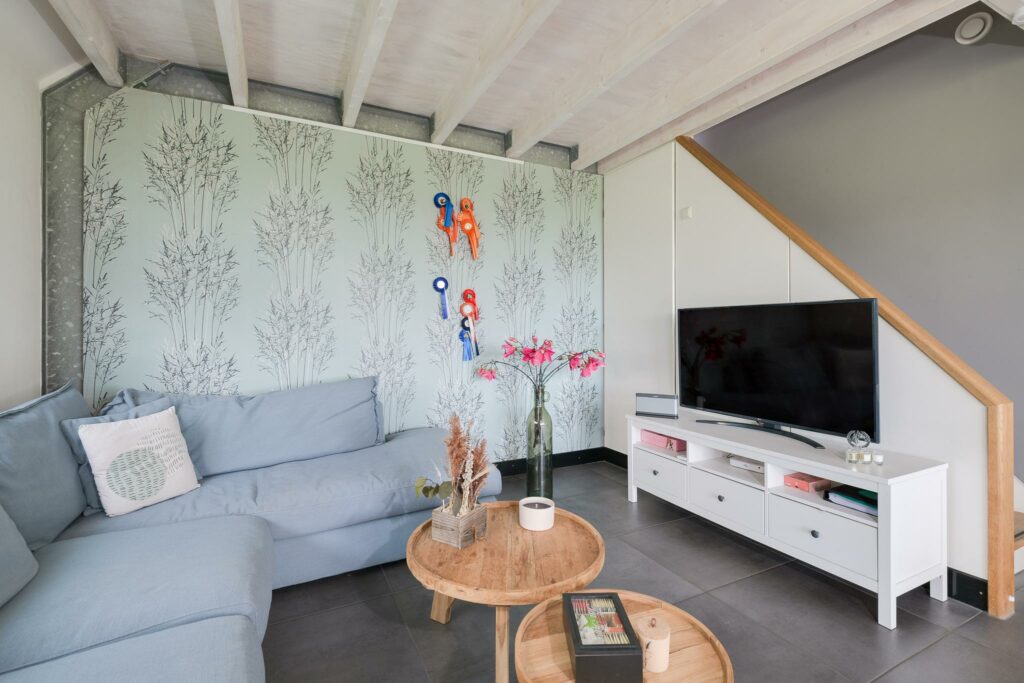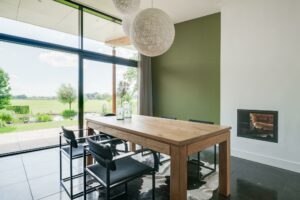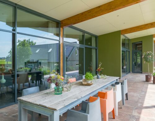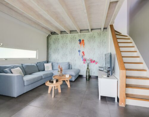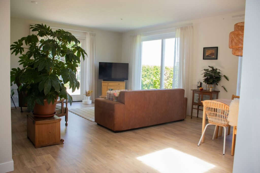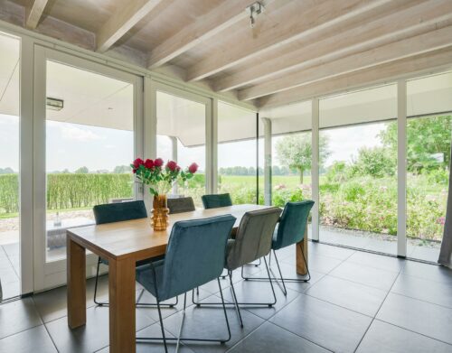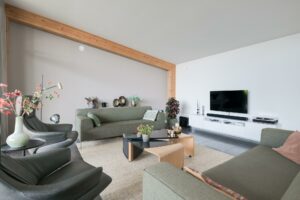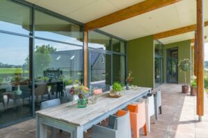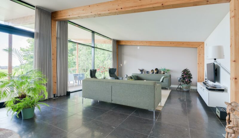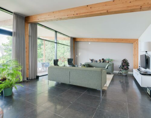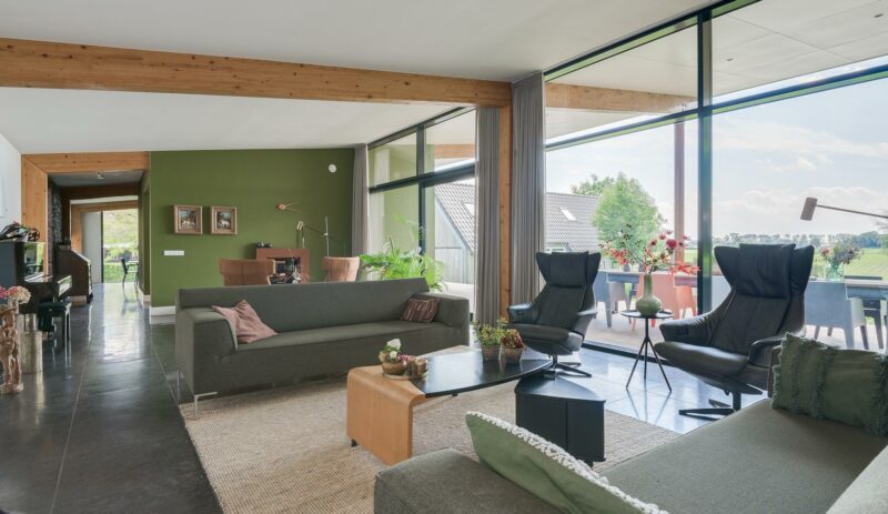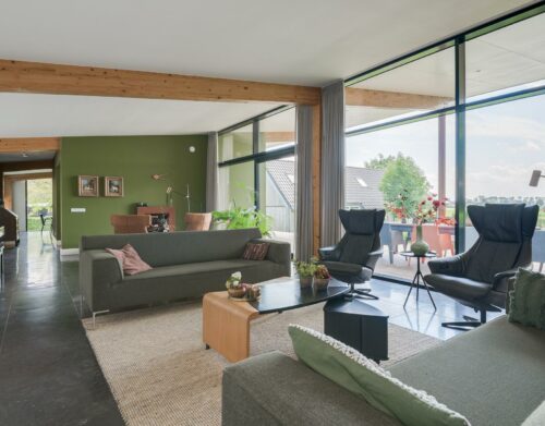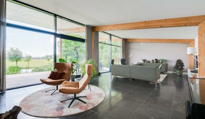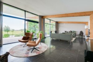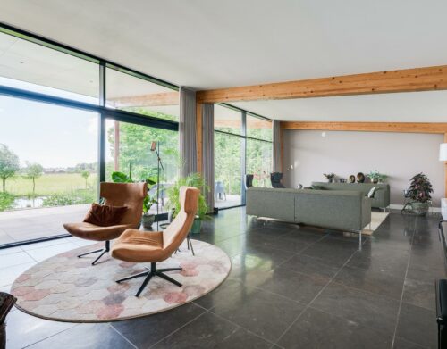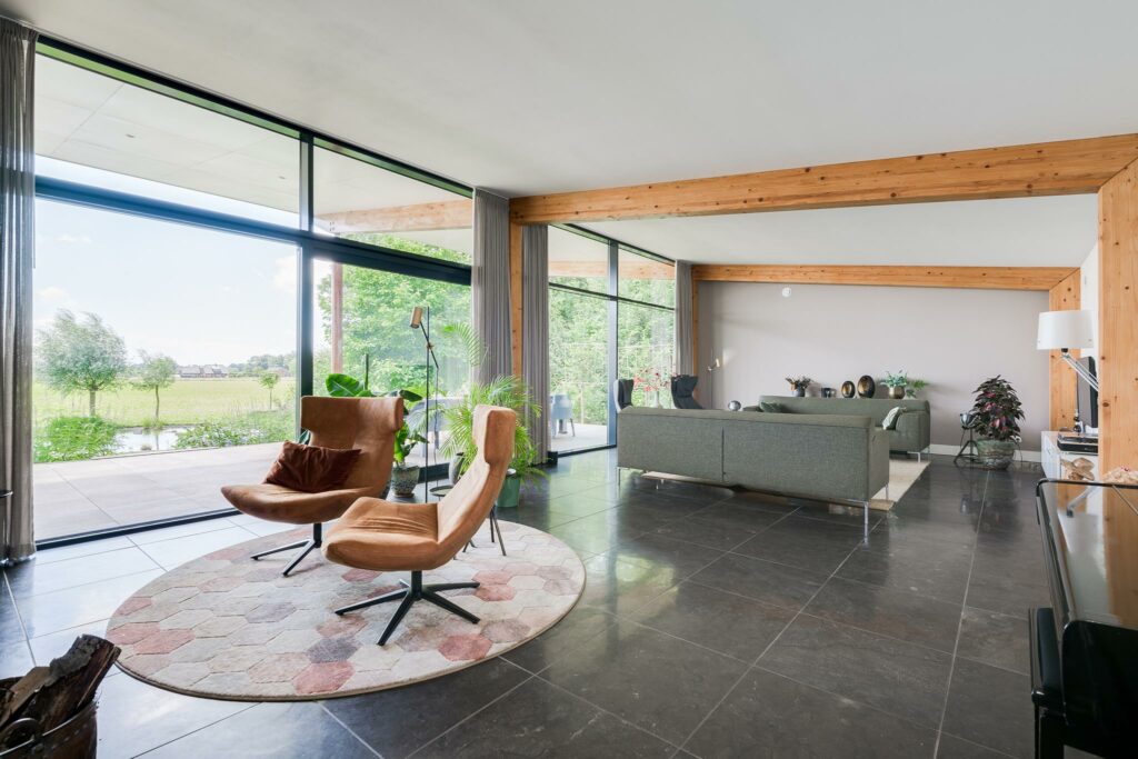 – Woonkamer van 53 m² met houten spanten en grote glazen pui
