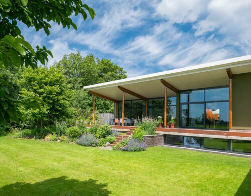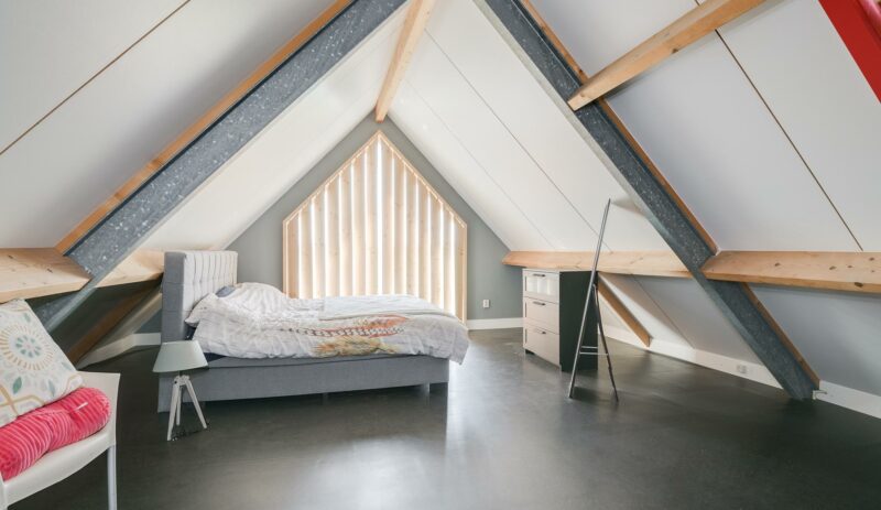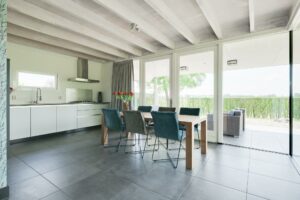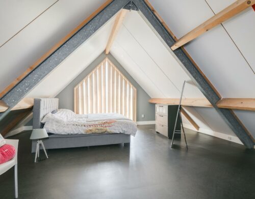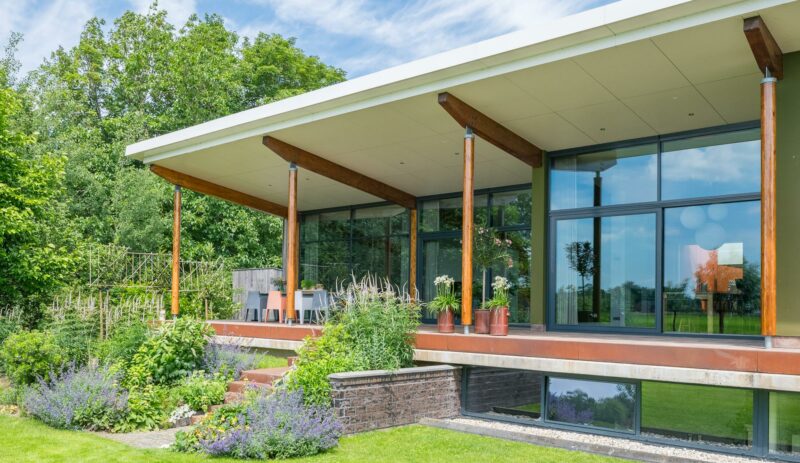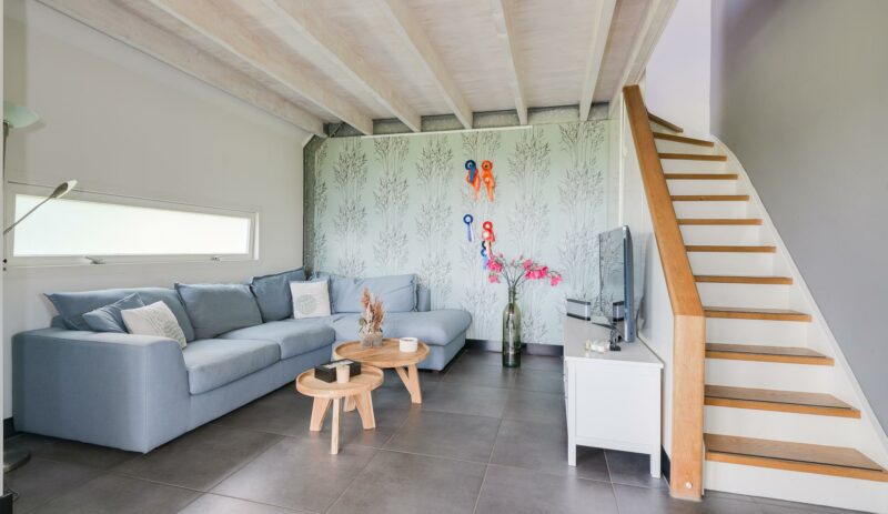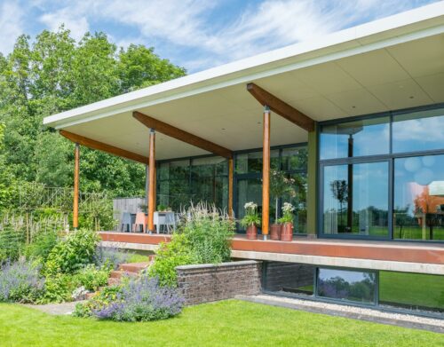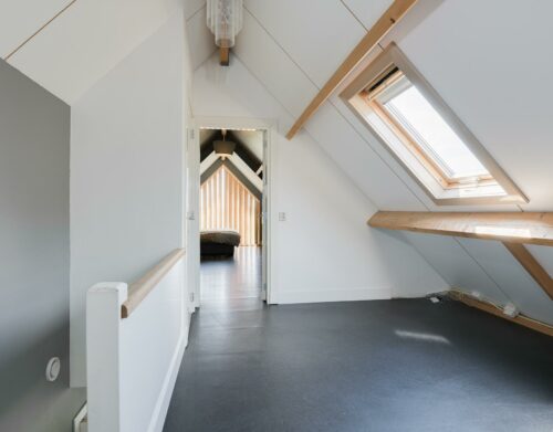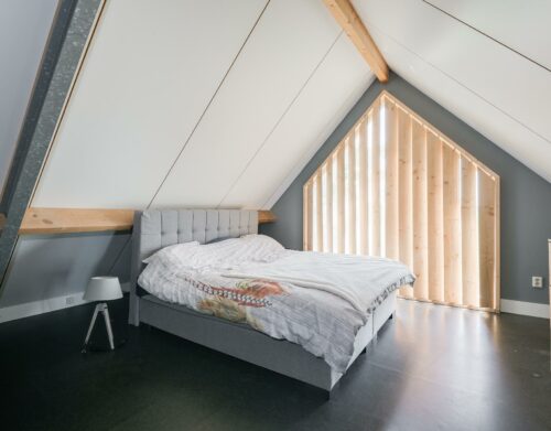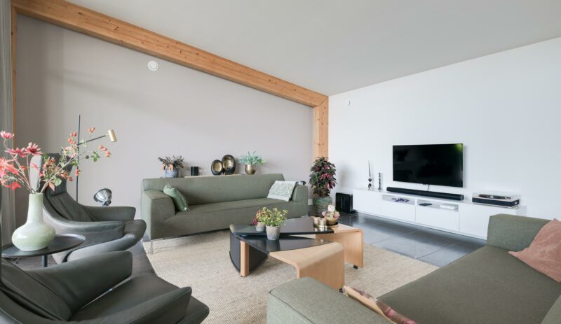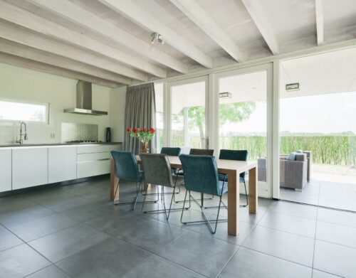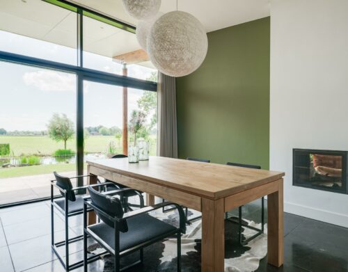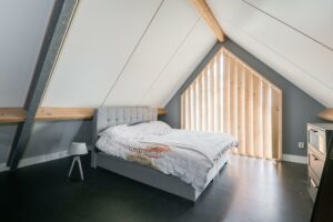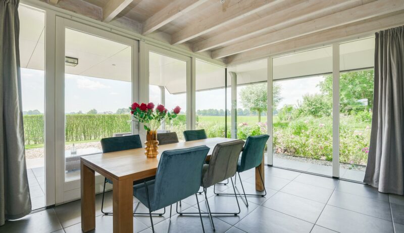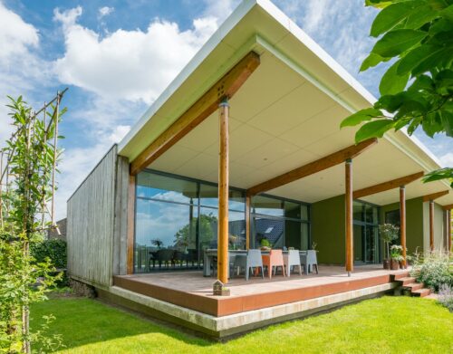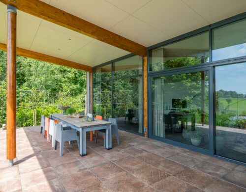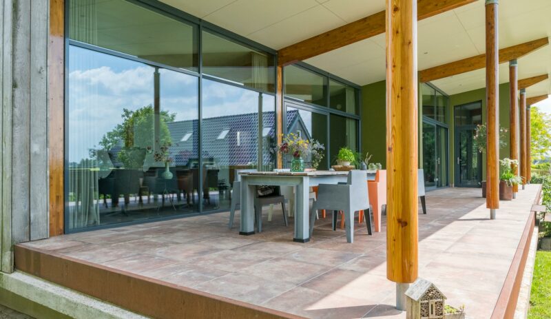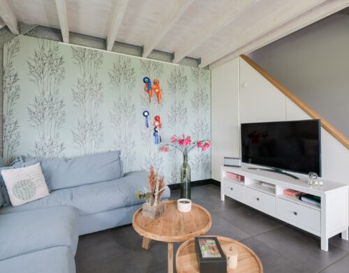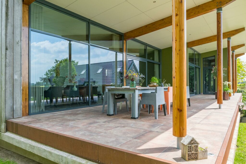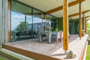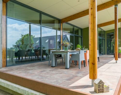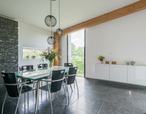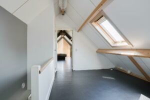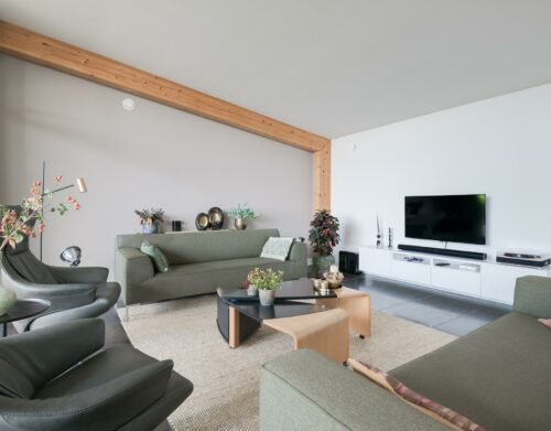 – Woonkamer van 53 m² met houten spanten en grote glazen pui