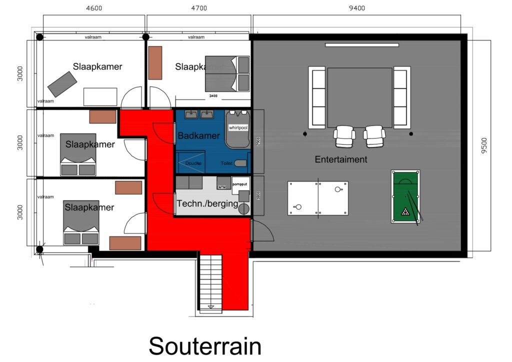– Souterrain met 4 slaapkamers, badkamer met whirlpool en separate recreatieruimte (90 m²)