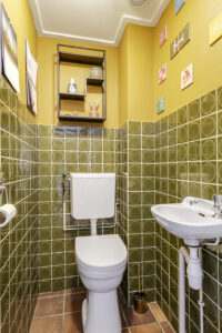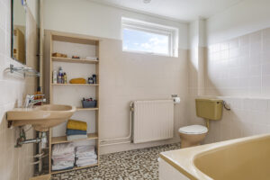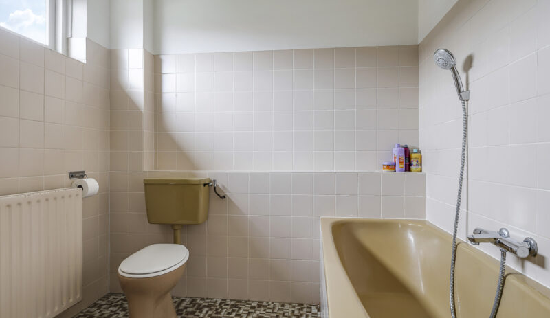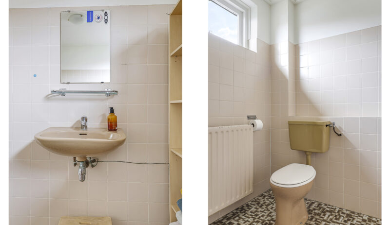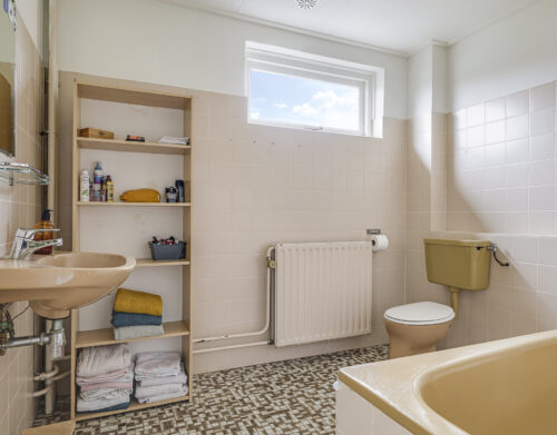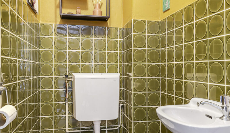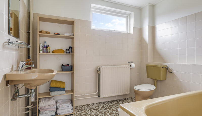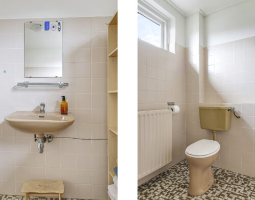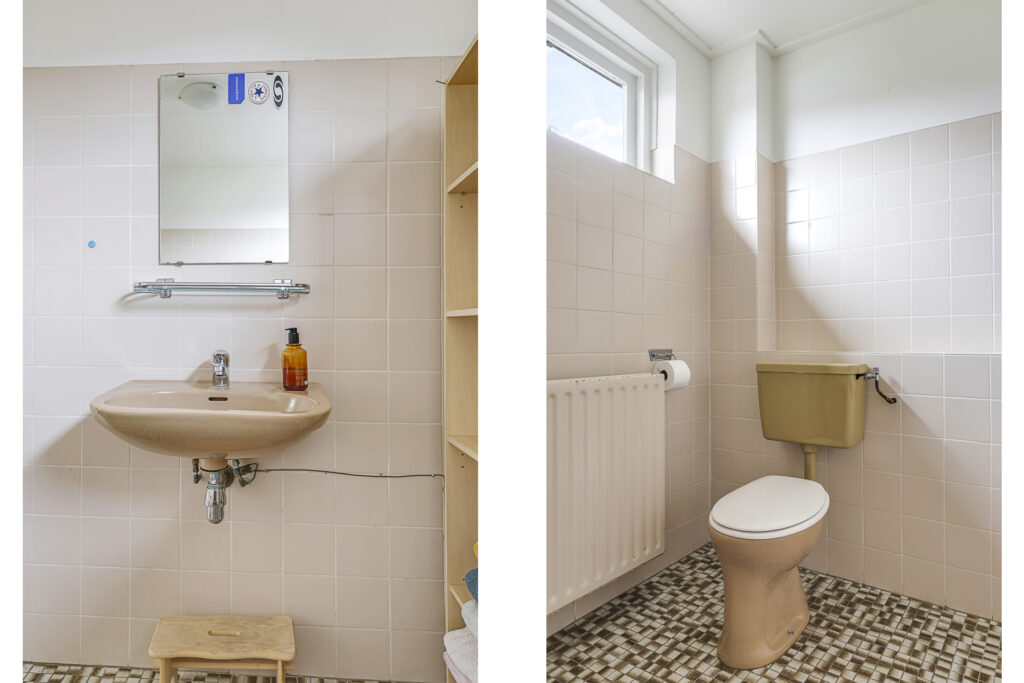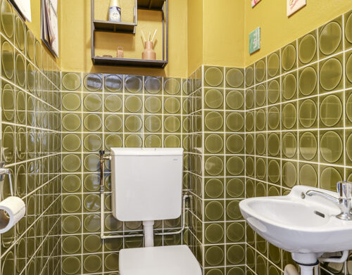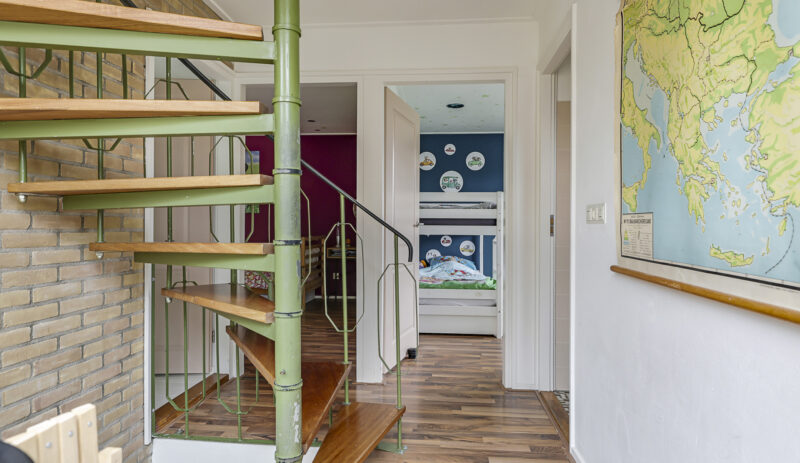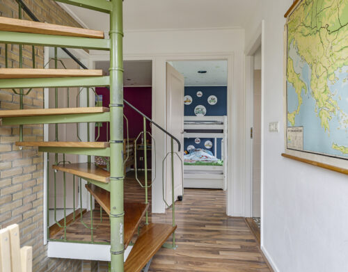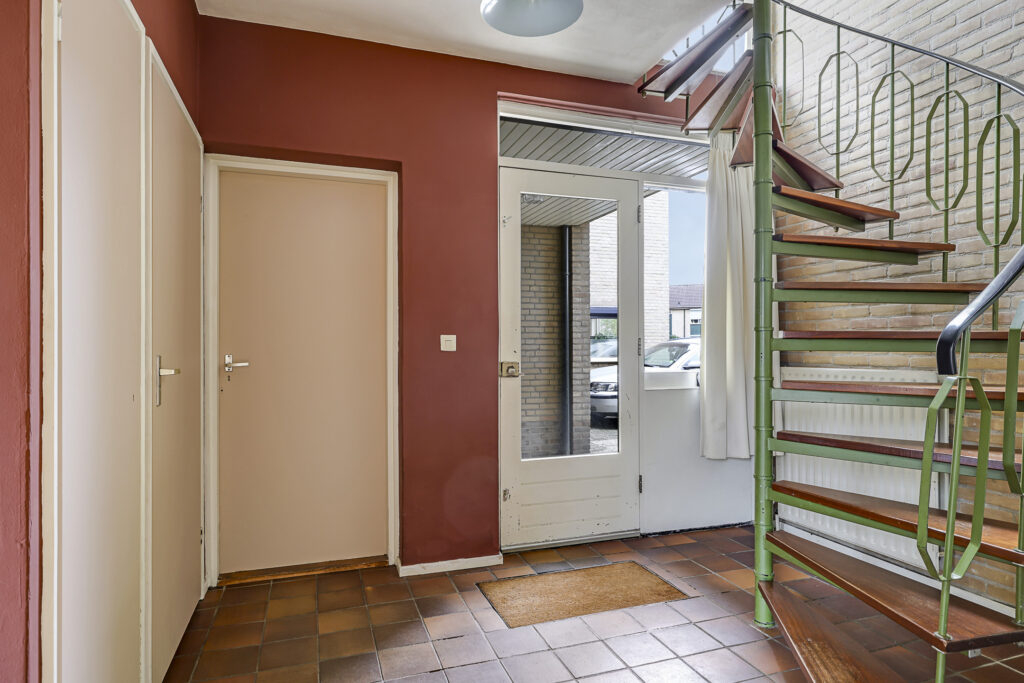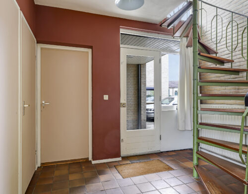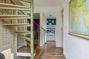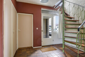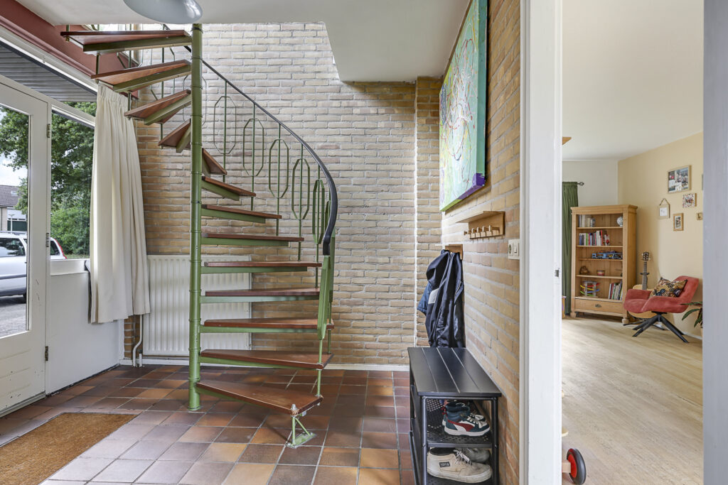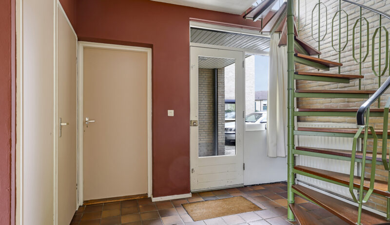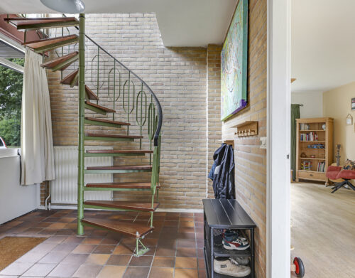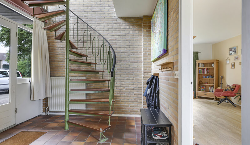Bij binnenkomst valt direct de sfeervolle entree op, met de karakteristieke retro wenteltrap als blikvanger. In de hal bevinden zich verder een toilet met fontein, de meterkast en een vaste kast voor extra opbergruimte.