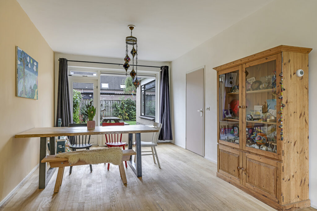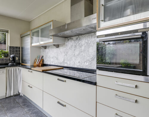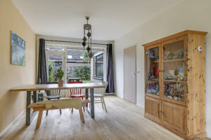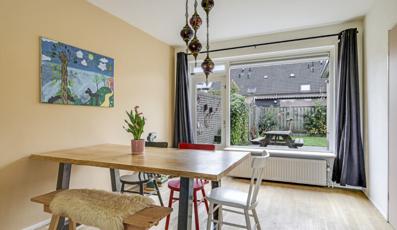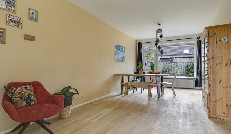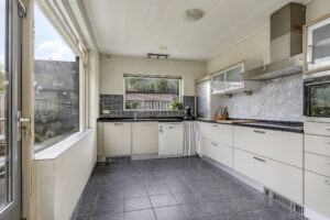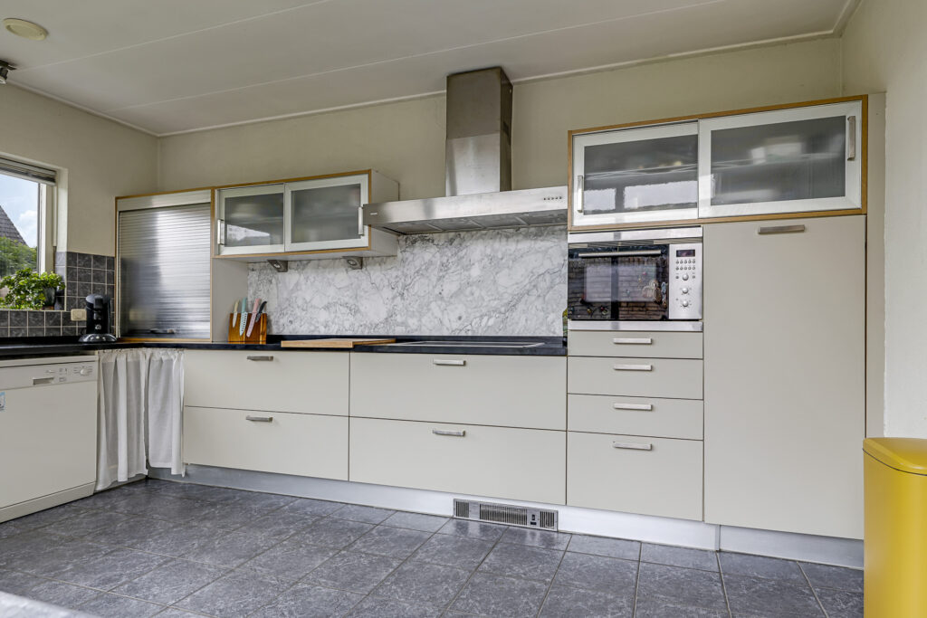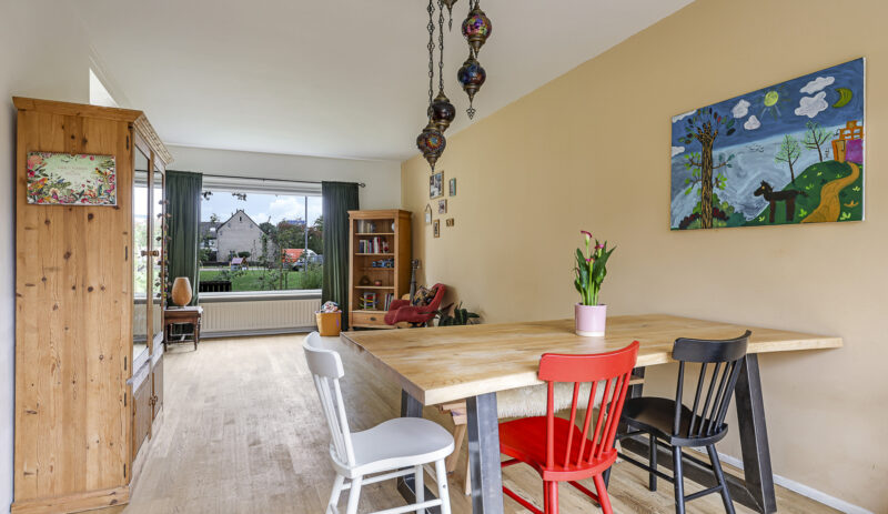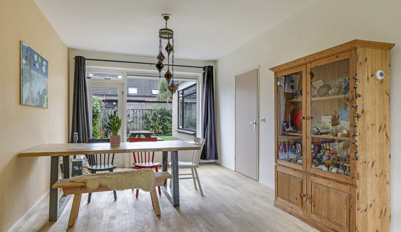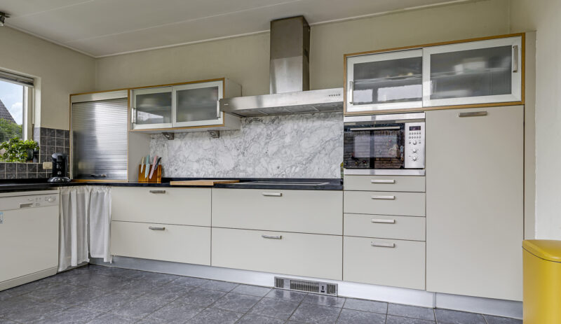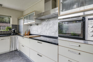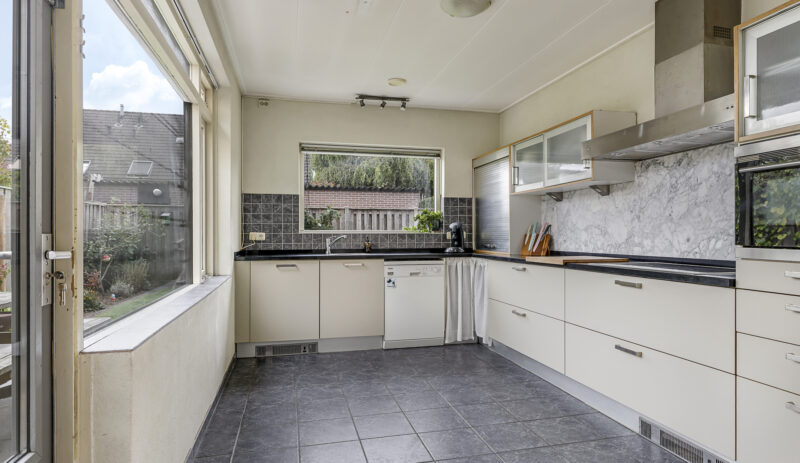 De ruime en lichte woonkamer heeft een nette eikenhouten parketvloer en een gezellige open haard – dé plek om samen te komen op koude winteravonden. De dichte keuken is via de hal te bereiken en vormt het hart van de woning. Deze lichte woonkeuken is voorzien van diverse inbouwapparatuur, waaronder een keramische kookplaat, combi-oven/magnetron, koelkast en losse vaatwasser.