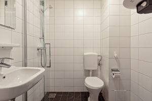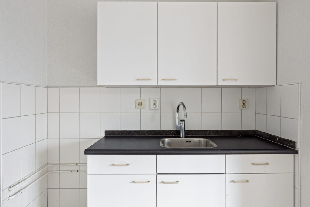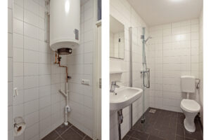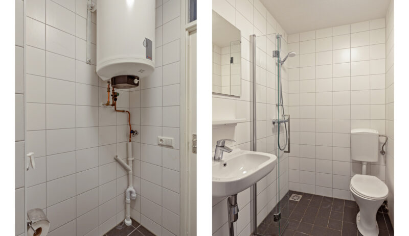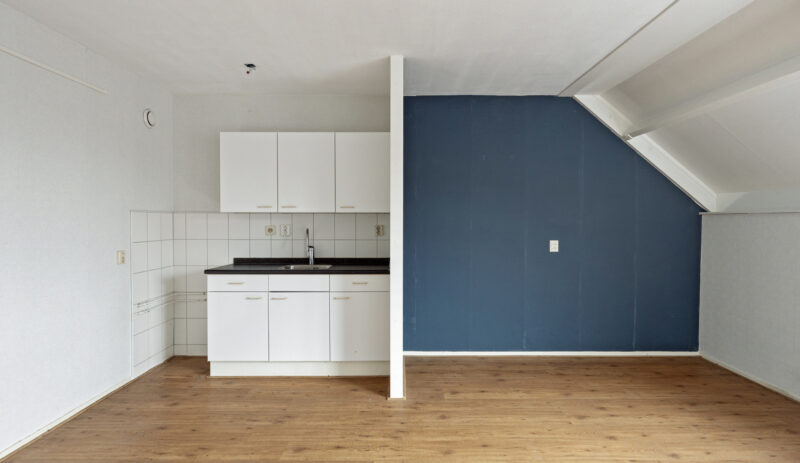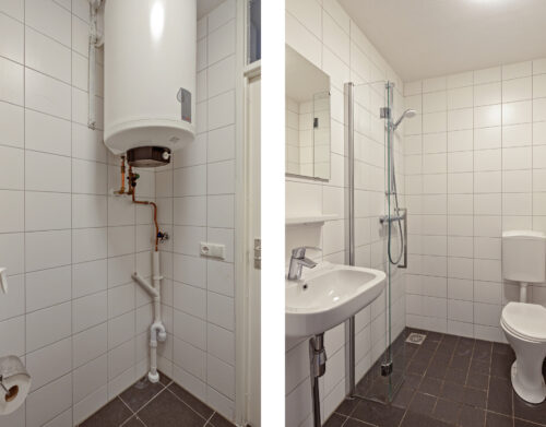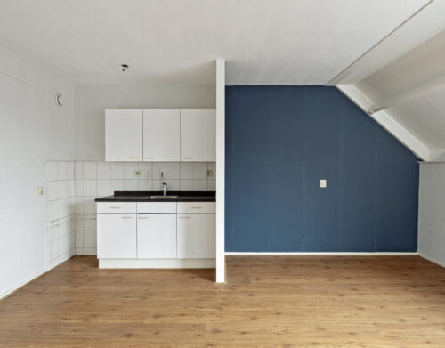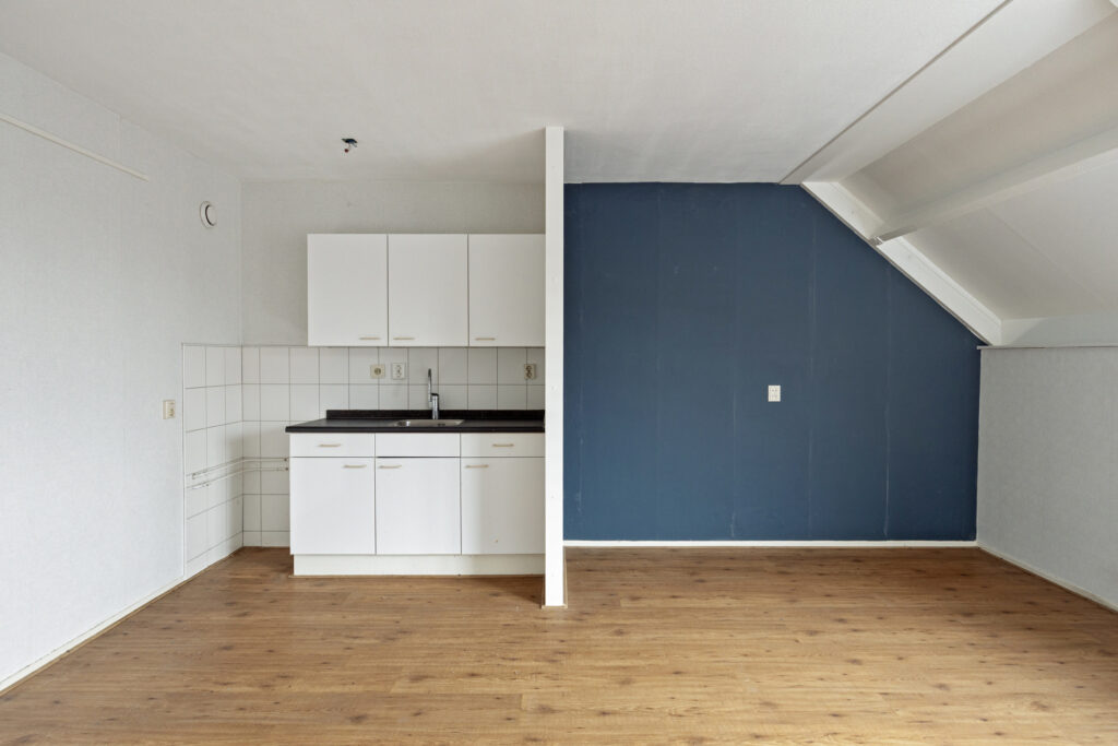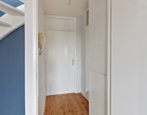 Entree/hal met toegang tot de badkamer, woonkamer en kleine bergkast. Betegelde badkamer voorzien van een douche, toilet, wastafel, witgoedaansluiting en elektrische boiler. Woon met open keuken. De vloer is voorzien van een nette laminaatvloer.