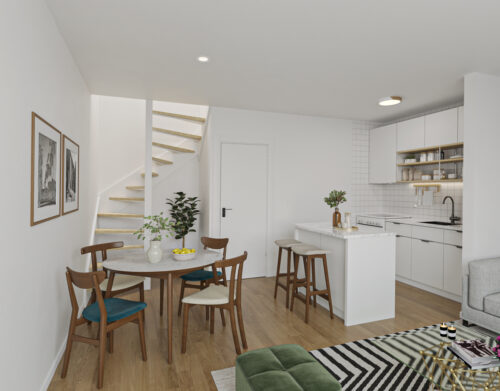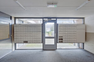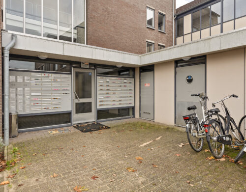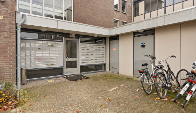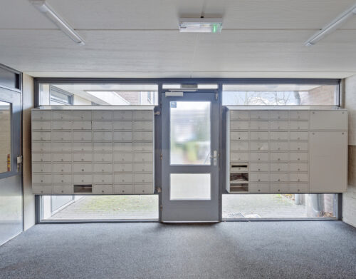 Op de begane grond kom je binnen in de gemeenschappelijke entree. Hier vind je de brievenbussen, bellenplateau en de toegang tot de trapopgang. Daarnaast is er vanuit de gemeenschappelijke entree toegang tot de inpandige fietsenberging. Voor het stallen van scooters of motoren is er een aparte berging buiten.