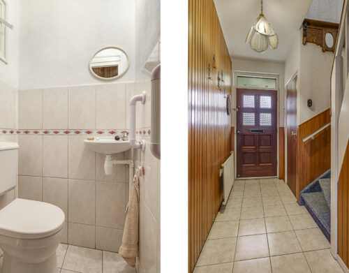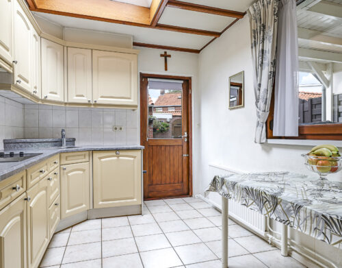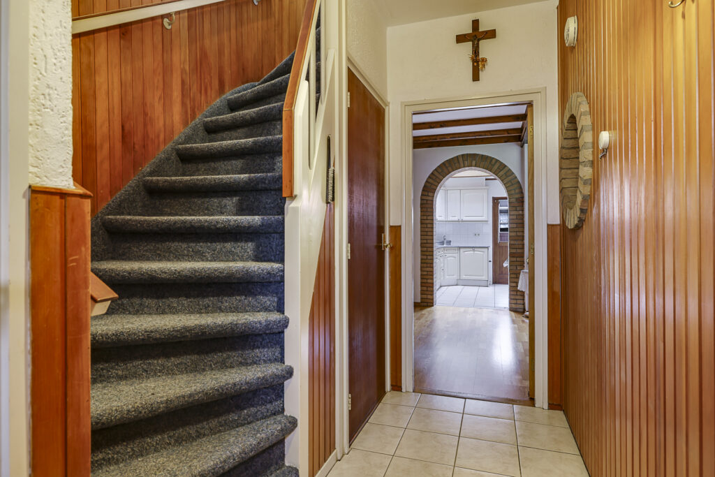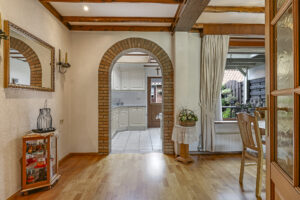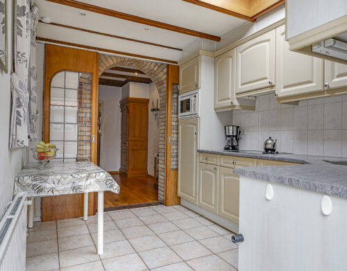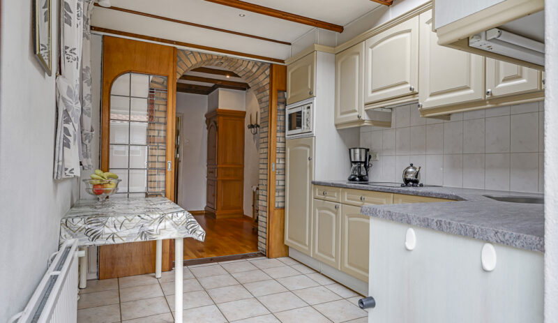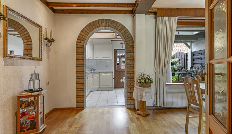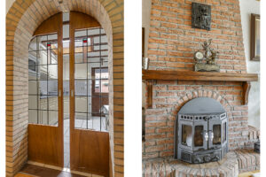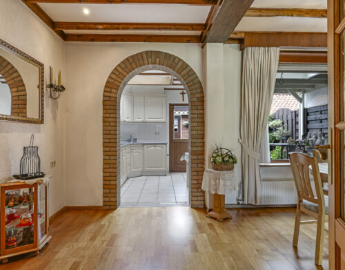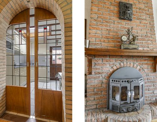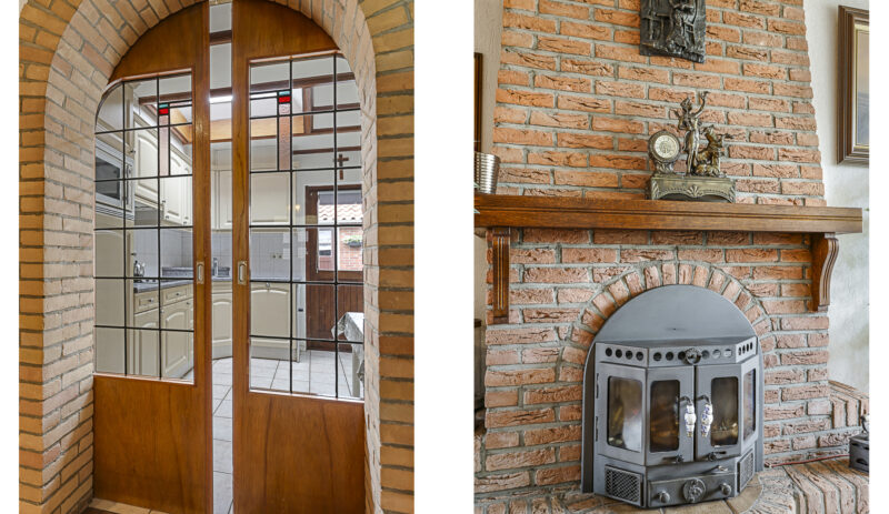 Bij binnenkomst van de woning arriveert u eerst in de ruime hal met trapopgang en toilet, de ontvangsthal geeft vervolgens toegang geeft tot de woonkamer en keuken. De sfeervolle doorzonwoonkamer met erker straalt warmte en karakter uit, mede dankzij de prachtige open haard met robuuste schouw en de houten balkenplafonds. Grote ramen zorgen voor veel natuurlijk licht en bieden een fraai uitzicht op de groene tuin. De combinatie van houten vloeren en klassieke details geeft de ruimte een huiselijke en authentieke uitstraling. De eetkamer sluit hier naadloos op aan en biedt volop ruimte voor een grote eettafel. Via de ronde boog met glas in lood schuifdeuren, bereikt u de keuken. Deze is praktisch ingericht en beschikt over een inductiekookplaat, afzuigkap, oven, koel/vriescombinatie en meer dan genoeg werk- en opslagruimte. Ook vanuit de keuken krijgt u een gezellig uitzicht over de tuin. Het betegelde toilet beschikt over een wc-fonteintje.
