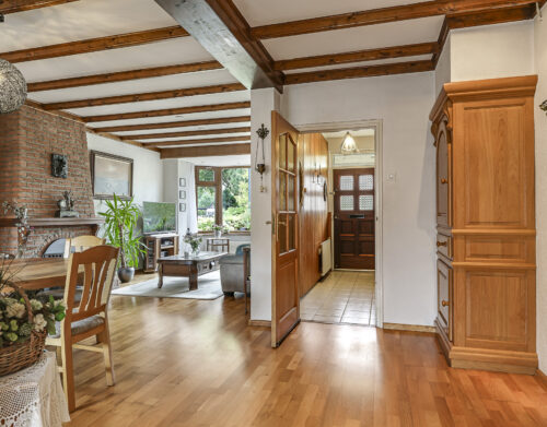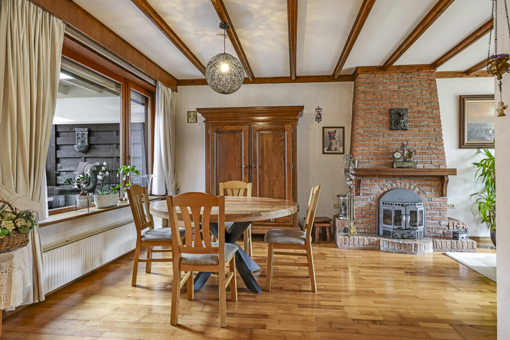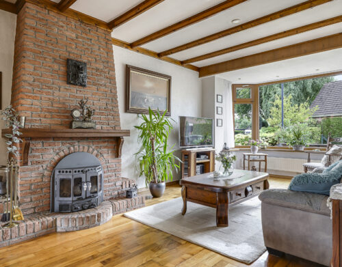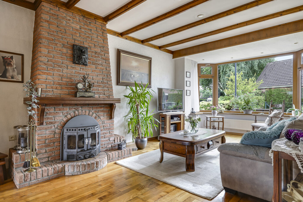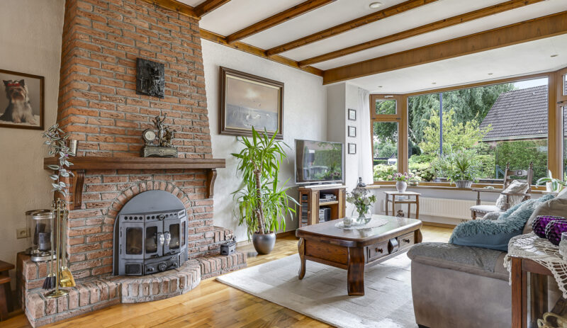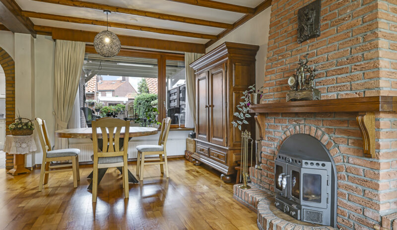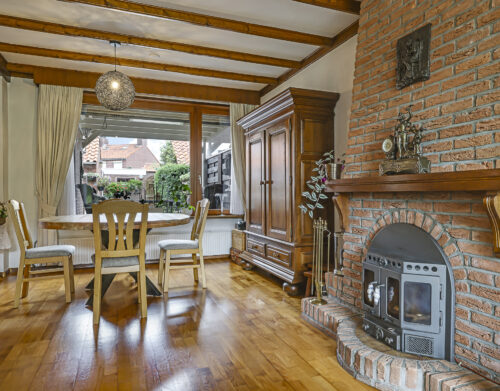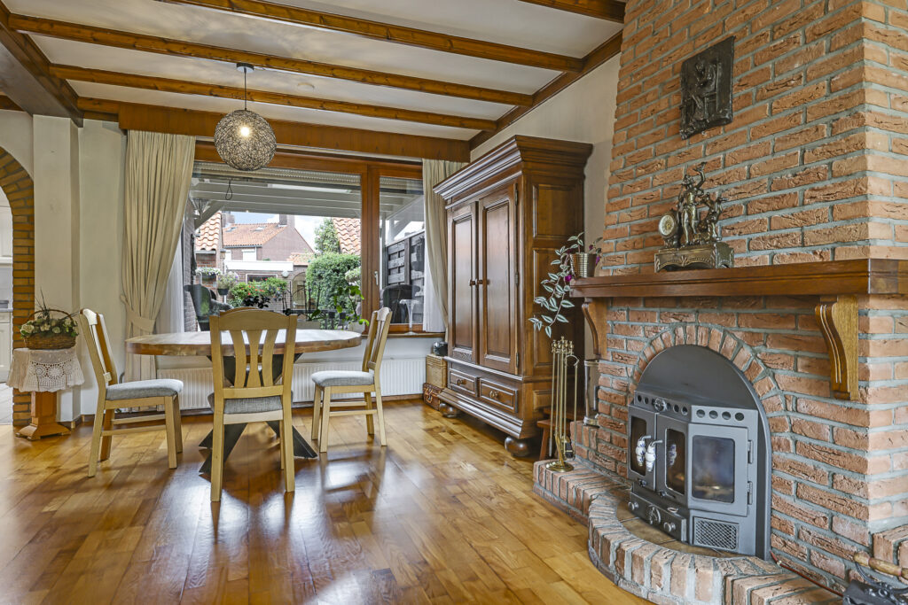 – Ruime doorzonwoonkamer met erker en karakteristieke details zoals houten balken en een haard