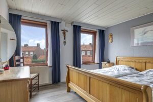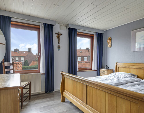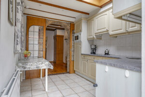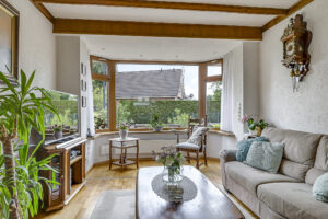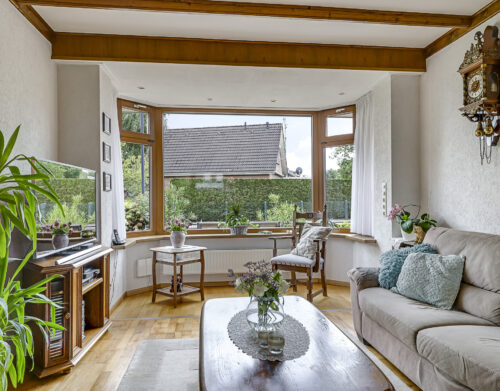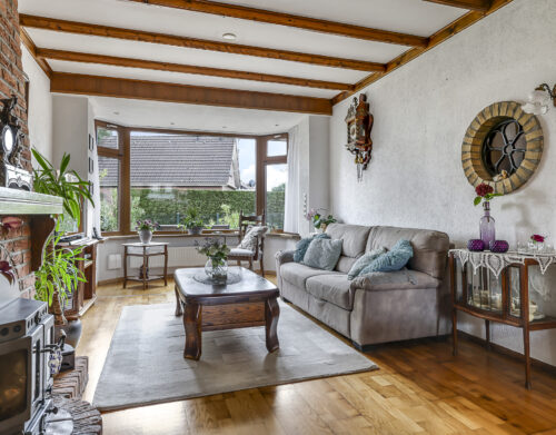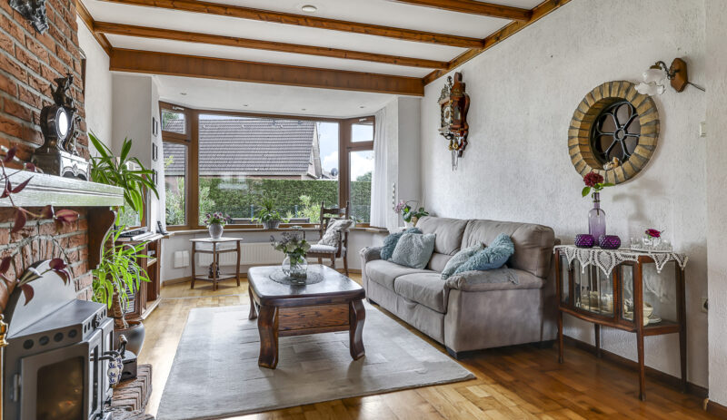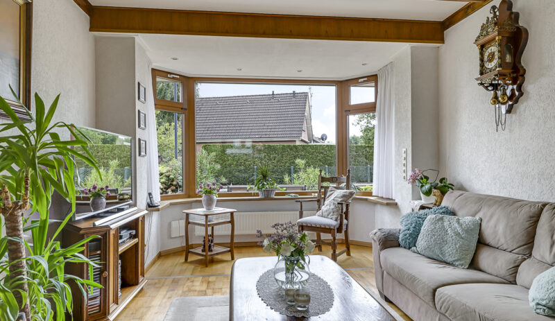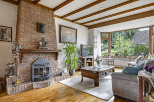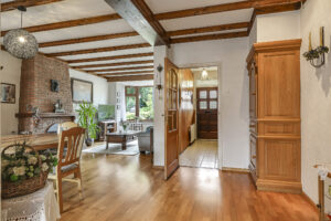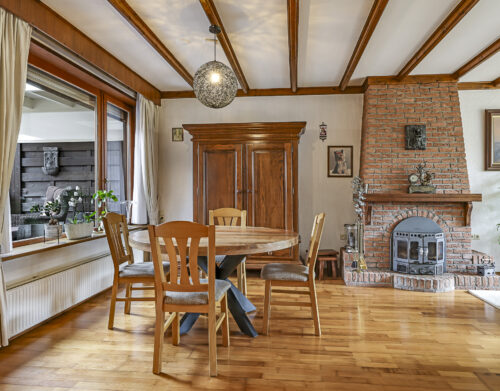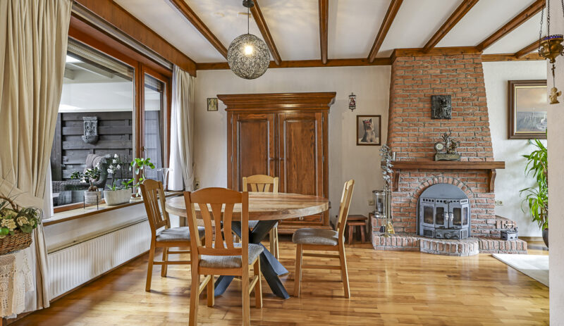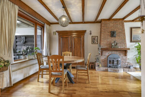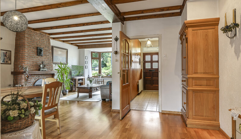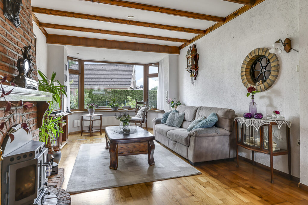 – Ruime doorzonwoonkamer met erker en karakteristieke details zoals houten balken en een haard