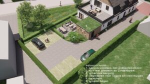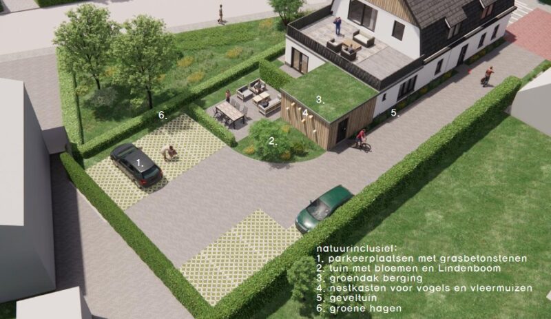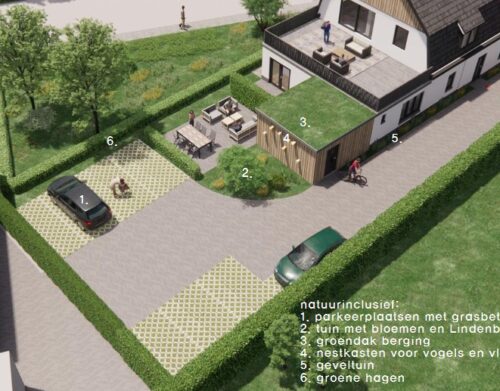 Op het gemeenschappelijke binnenterrein bevinden zich de (privé) parkeerplaatsen en een gemeenschappelijke fietsenberging. De ontwikkelaar zal zorg dragen voor een volledig afgewerkt buitenterrein inclusief bestrating, groen voorzieningen en erf afscheidingen.