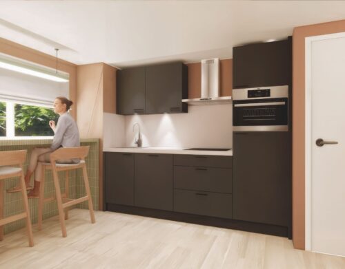 Het appartement is afgewerkt met modern zwart deurbeslag en beschikt over een centraal bellensysteem met deuropener. Voor internet zijn zowel een glasvezel- als een Ziggo-aansluiting beschikbaar. De woning wordt opgeleverd met een door alle ruimten doorgelegde laminaatvloer, een luxe badkamer en een volledig uitgeruste keuken in zwarte kleurstelling.
