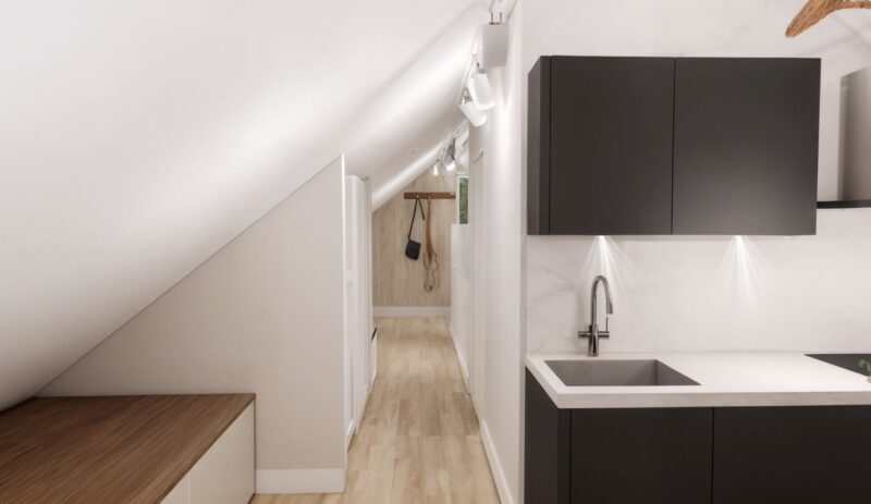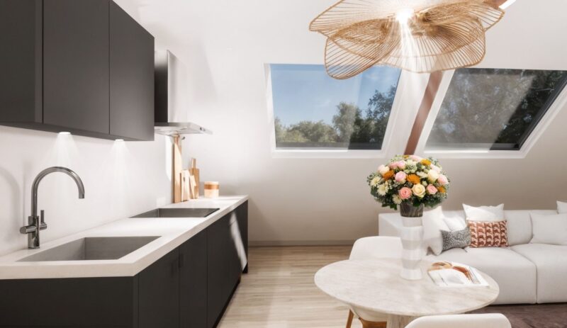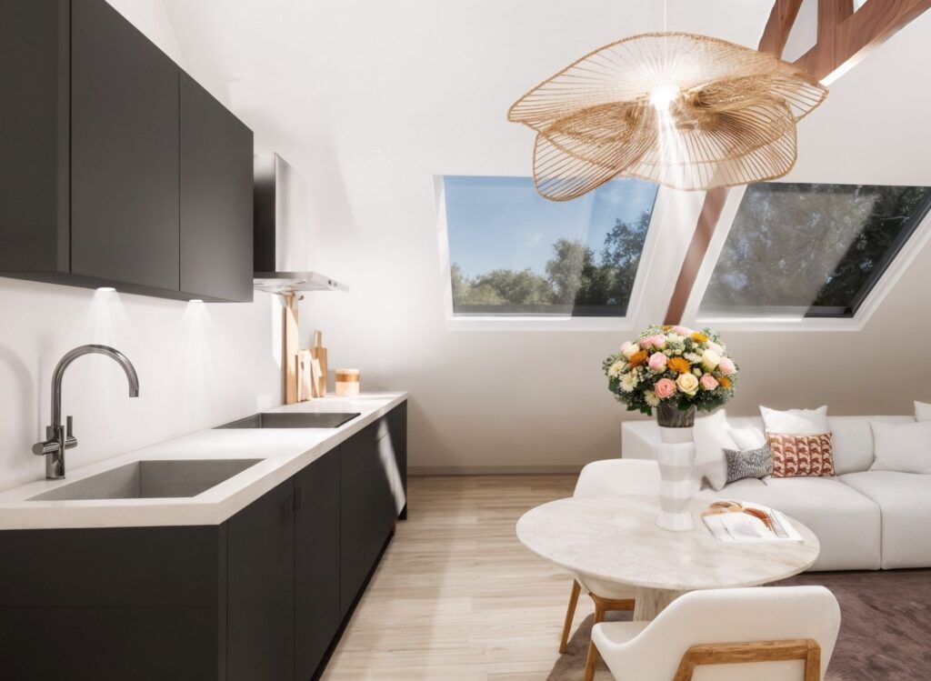 De woning wordt opgeleverd met een door alle ruimten doorgelegde laminaatvloer, een luxe badkamer en een volledig uitgeruste keuken in zwarte kleurstelling.