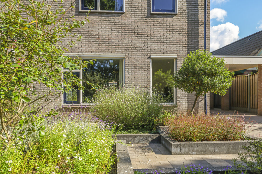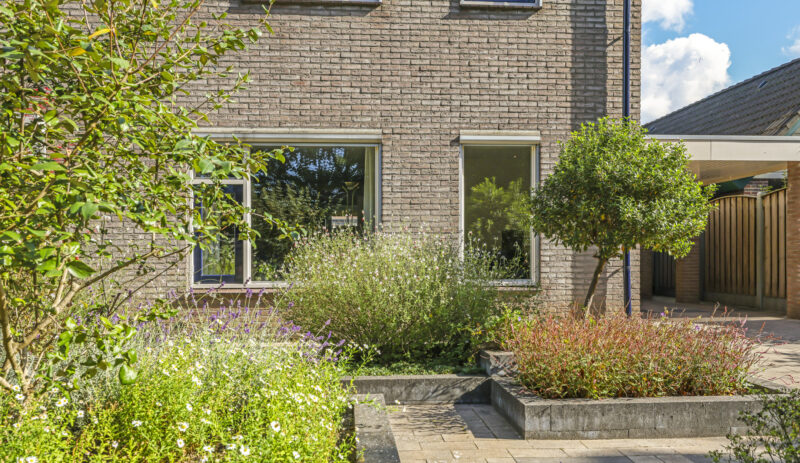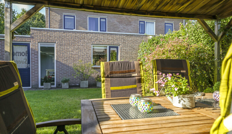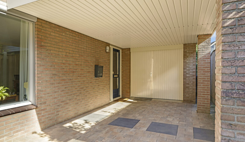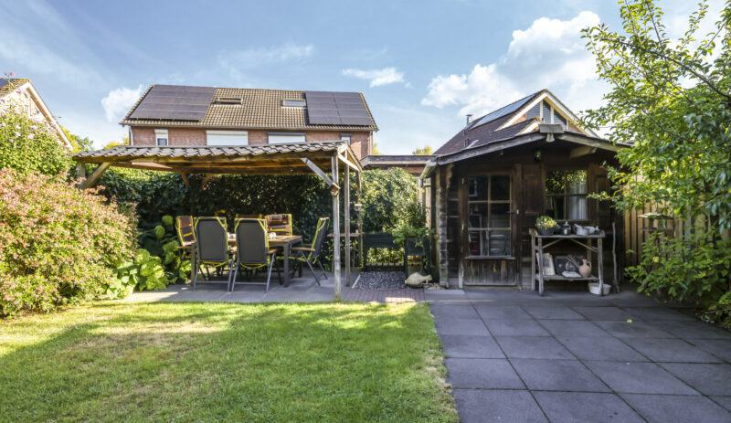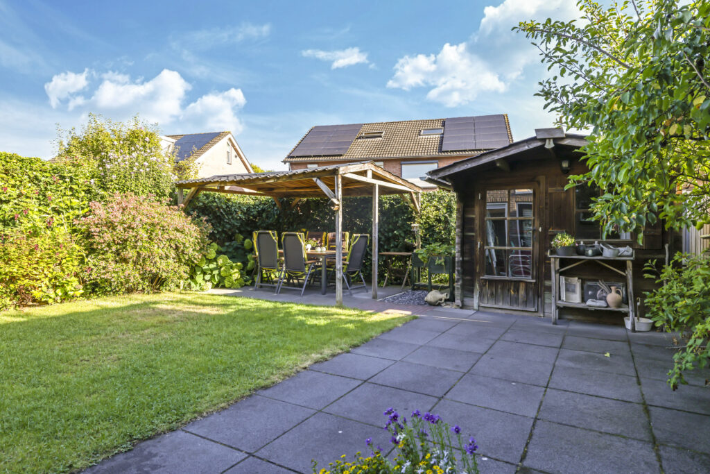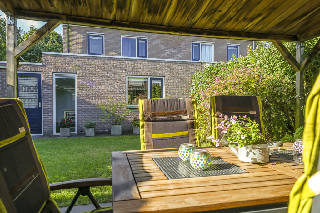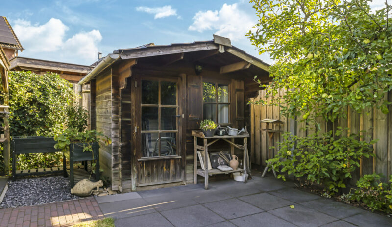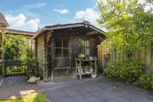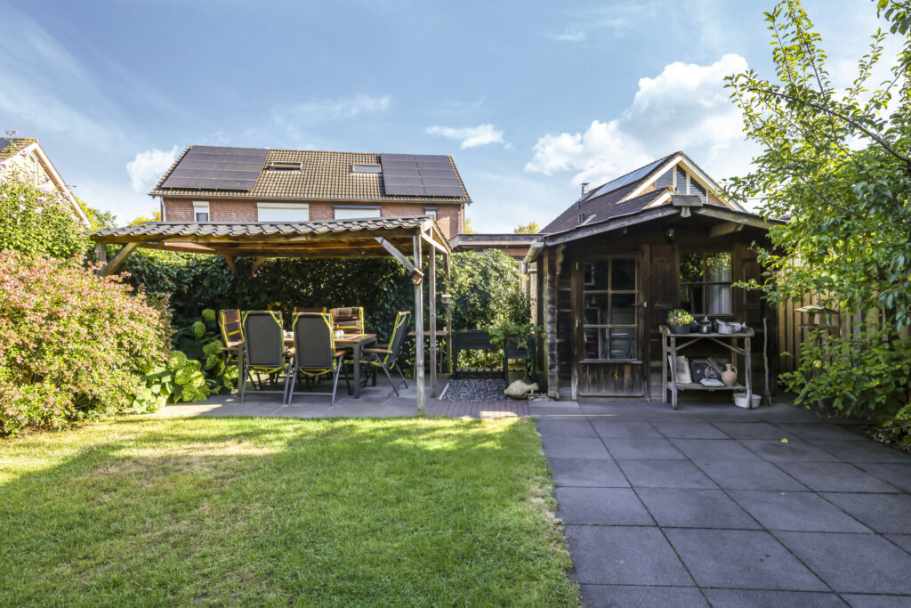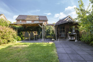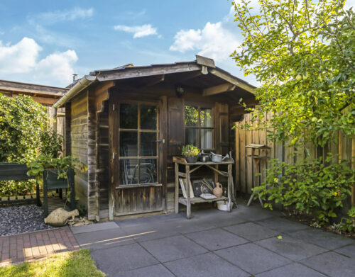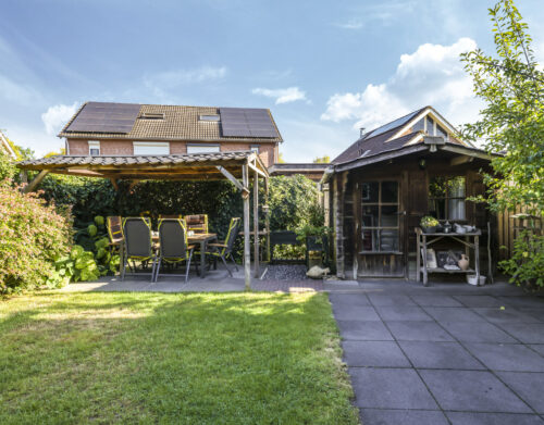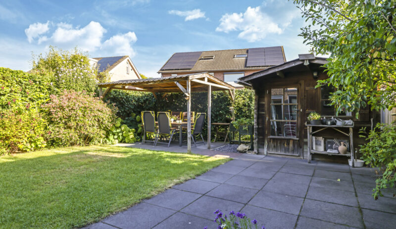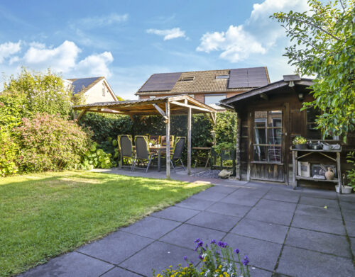 De tuin is volledig omsloten en daardoor heerlijk privé. Achterin staat een tuinhuisje met een overkapping: een fijne plek om in de zomer buiten te zitten of juist in de winter je tuinspullen droog te stallen. Via een omloop kun je eenvoudig rond het huis naar de oprit lopen.