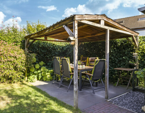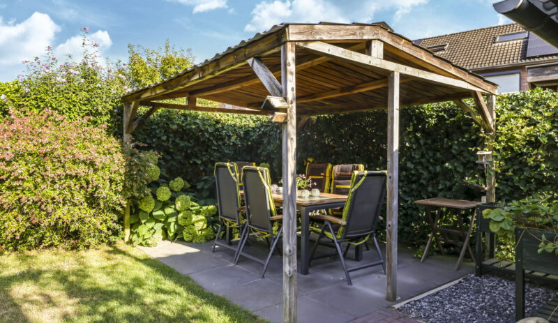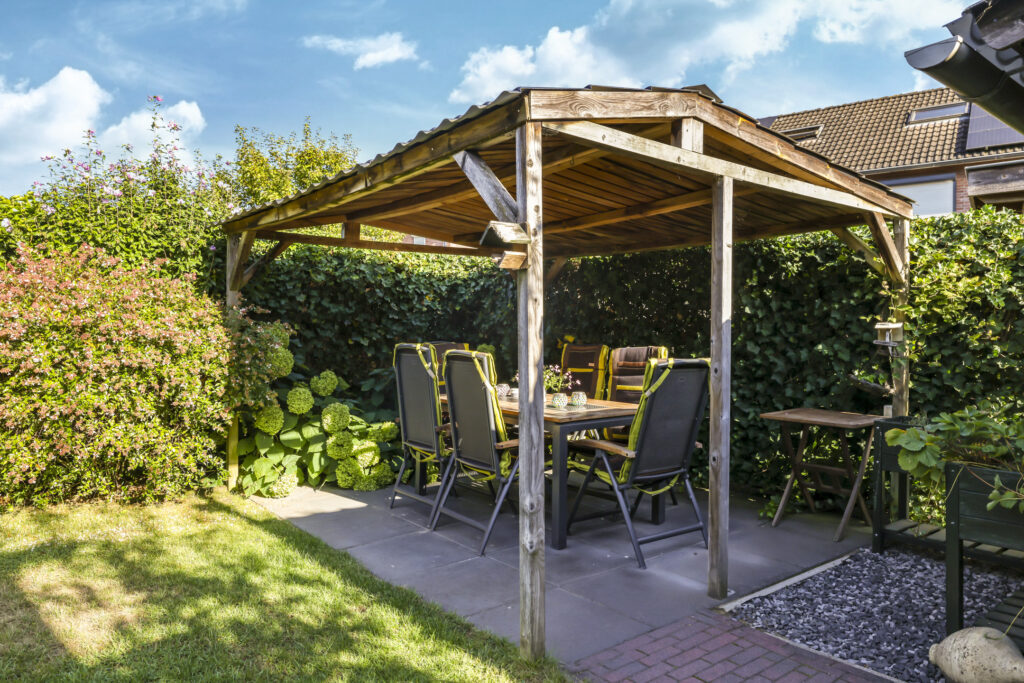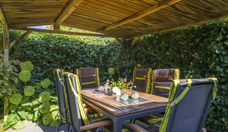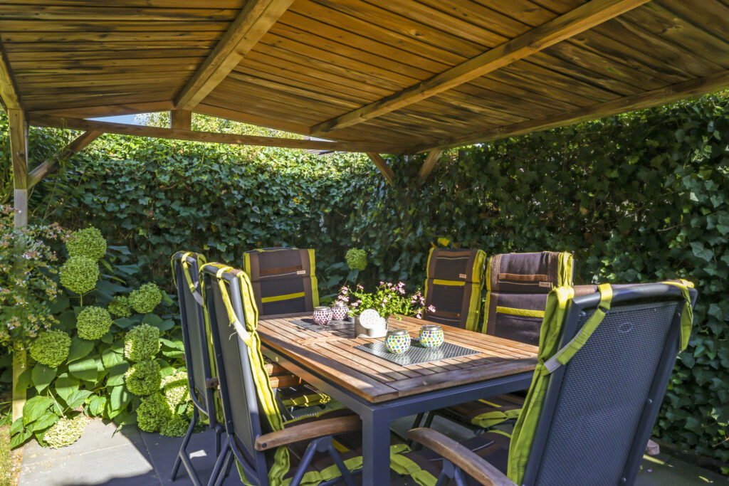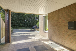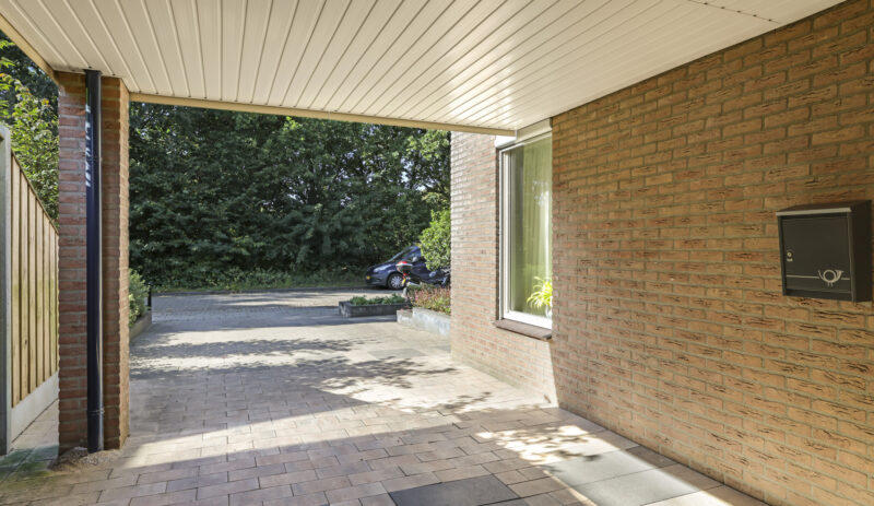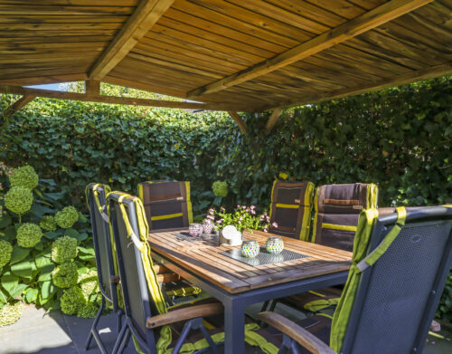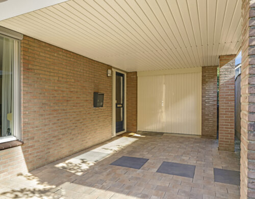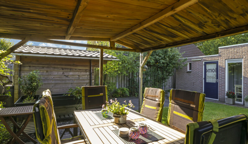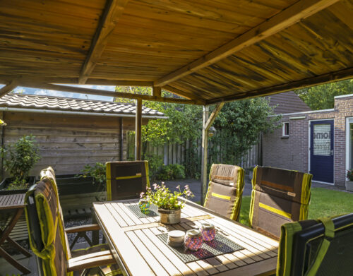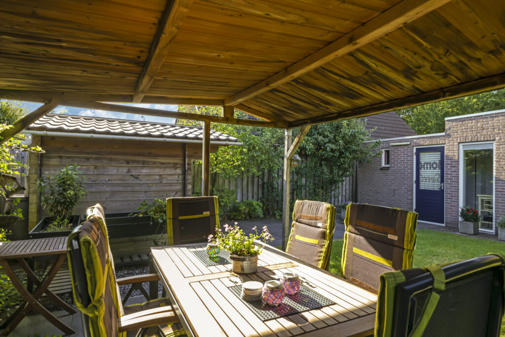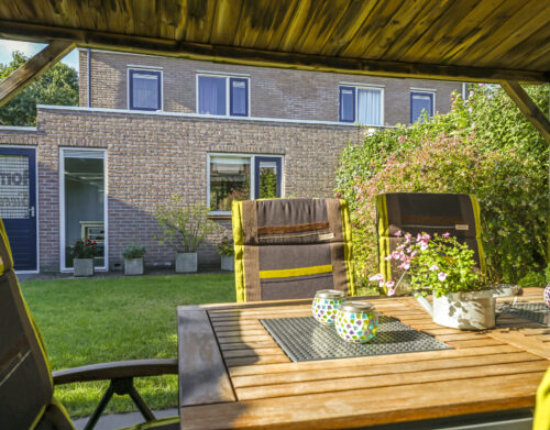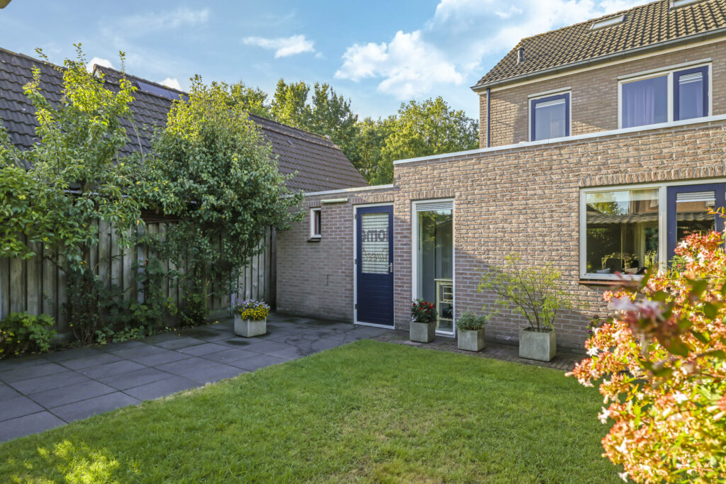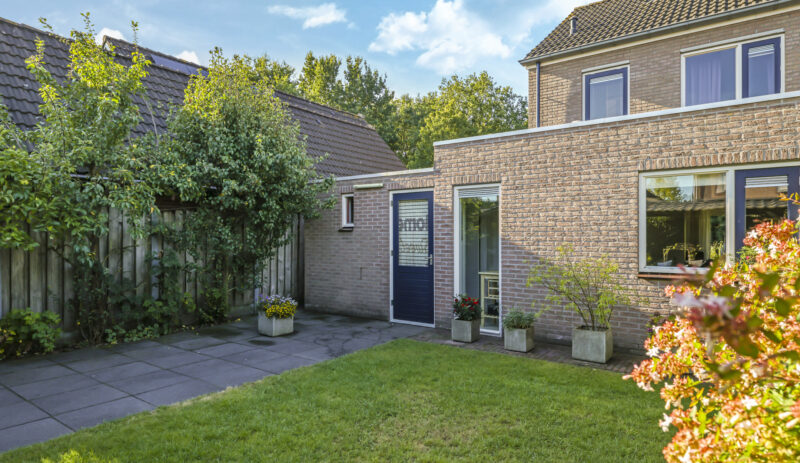 De tuin is volledig omsloten en daardoor heerlijk privé. Achterin staat een tuinhuisje met een overkapping: een fijne plek om in de zomer buiten te zitten of juist in de winter je tuinspullen droog te stallen. Via een omloop kun je eenvoudig rond het huis naar de oprit lopen.