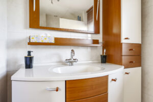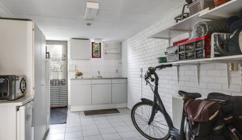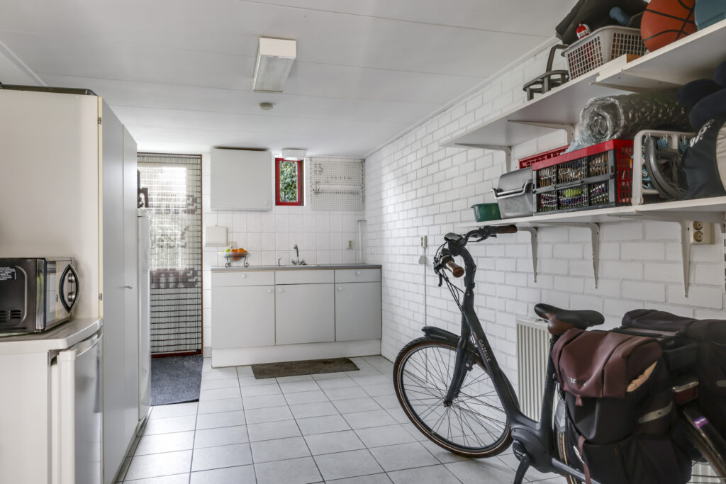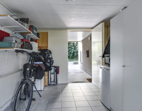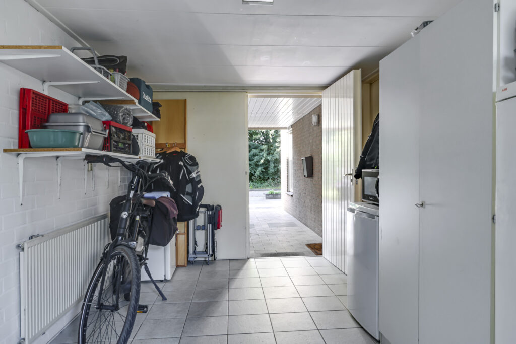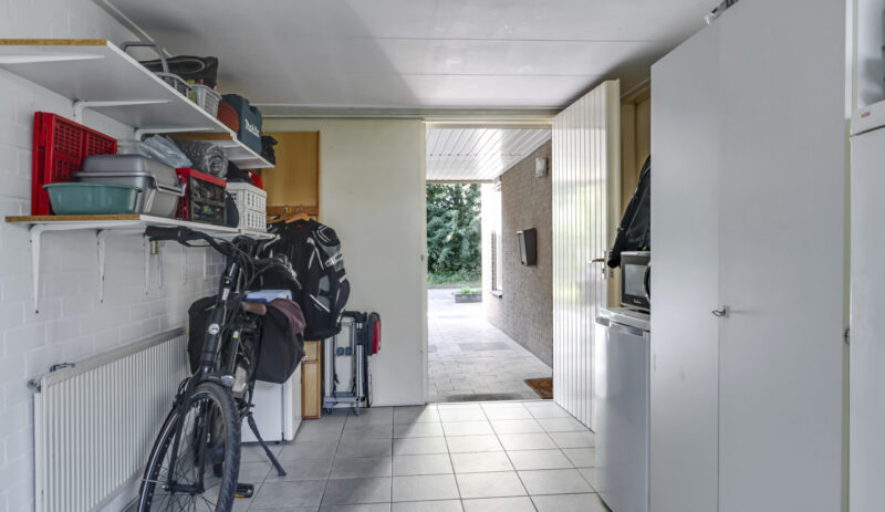 Via de keuken loop je zo door naar de garage. Deze is verwarmd, voorzien van elektra en een handig keukenblok met warm en koud water. Aan de voorkant openen de dubbele deuren naar de oprit en aan de achterkant stap je direct de tuin in.